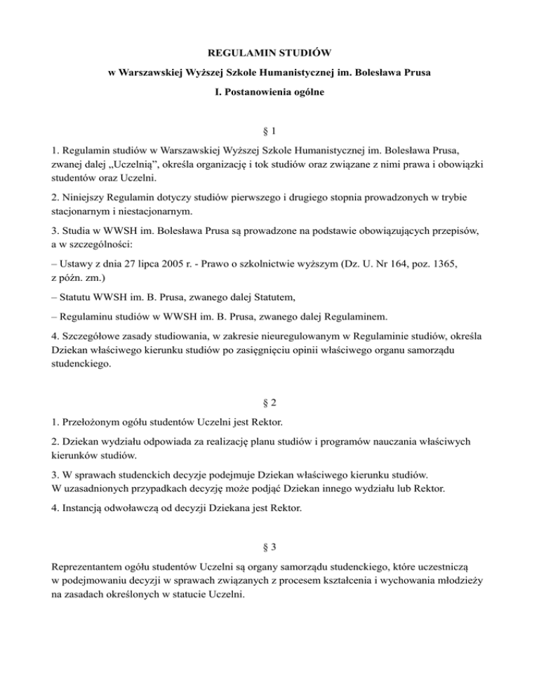 REGULAMIN STUDIÓW w Warszawskiej Wyższej Szkole Humanistycznej im. Bolesława Prusa I. Postanowienia ogólne §1 1. Regulamin studiów w Warszawskiej Wyższej Szkole Humanistycznej im. Bolesława Prusa, zwanej dalej „Uczelnią”, określa organizację i tok studiów oraz związane z nimi prawa i obowiązki studentów oraz Uczelni. 2. Niniejszy Regulamin dotyczy studiów pierwszego i drugiego stopnia prowadzonych w trybie stacjonarnym i niestacjonarnym. 3. Studia w WWSH im. Bolesława Prusa są prowadzone na podstawie obowiązujących przepisów, a w szczególności: – Ustawy z dnia 27 lipca 2005 r. - Prawo o szkolnictwie wyższym (Dz. U. Nr 164, poz. 1365, z późn. zm.) – Statutu WWSH im. B. Prusa, zwanego dalej Statutem, – Regulaminu studiów w WWSH im. B. Prusa, zwanego dalej Regulaminem. 4. Szczegółowe zasady studiowania, w zakresie nieuregulowanym w Regulaminie studiów, określa Dziekan właściwego kierunku studiów po zasięgnięciu opinii właściwego organu samorządu studenckiego. §2 1. Przełożonym ogółu studentów Uczelni jest Rektor. 2. Dziekan wydziału odpowiada za realizację planu studiów i programów nauczania właściwych kierunków studiów. 3. W sprawach studenckich decyzje podejmuje Dziekan właściwego kierunku studiów. W uzasadnionych przypadkach decyzję może podjąć Dziekan innego wydziału lub Rektor. 4. Instancją odwoławczą od decyzji Dziekana jest Rektor. §3 Reprezentantem ogółu studentów Uczelni są organy samorządu studenckiego, które uczestniczą w podejmowaniu decyzji w sprawach związanych z procesem kształcenia i wychowania młodzieży na zasadach określonych w statucie Uczelni. §4 Niniejszy Regulamin obowiązuje wszystkich studentów i pracowników Uczelni, w tym także obcokrajowców studiujących lub prowadzących zajęcia w Uczelni. II. Prawa i obowiązki pracowników dydaktycznych §5 Pracownik dydaktyczny Uczelni ma prawo do: 1. poszanowania godności osobistej ze strony każdego członka społeczności akademickiej; 2. rozwijania własnej działalności naukowej, praktycznej związanej tematycznie z działalnością uczelni oraz korzystania w tym celu z pomieszczeń dydaktycznych WWSH, Biblioteki oraz znajdujących się na Uczelni urządzeń; 3. powielania materiałów dydaktycznych, niezbędnych do prowadzenia zajęć. §6 Pracownik dydaktyczny ma przede wszystkim obowiązek należytego wykonywania swoich powinności wobec Uczelni i społeczności akademickiej, w tym przede wszystkim: 1. obecności na zaplanowanych zajęciach oraz dyżurach, 2. rzetelnego przygotowywania się do prowadzonych zajęć, 3. terminowego wywiązywania się z obowiązków wynikających z przygotowania dokumentacji niezbędnej dla prawidłowego funkcjonowania uczelni. 4. poszanowania godności studenta, 5. rzetelnej oceny wyników pracy studenta, 6. poszanowania mienia Uczelni. §7 1. Za postępowanie uchybiające godności nauczyciela akademickiego oraz naruszenie przepisów obowiązujących w Uczelni, nauczyciel akademicki ponosi odpowiedzialność przed Komisją Dyscyplinarną (powoływaną przez Senat Uczelni), która może zadecydować o nałożeniu kary dyscyplinarnej, takiej jak: - upomnienie, - nagana, - nagana z ostrzeżeniem. Organem odwoławczym od decyzji Komisji Dyscyplinarnej jest Odwoławcza Komisja Dyscyplinarna. Za szczególnie drastyczne naruszenie przepisów obowiązujących w Uczelni, Rektor może rozwiązać z pracownikiem dydaktycznym umowę o pracę lub umowę o dzieło. 2. Okresowej oceny działalności nauczycieli akademickich dokonuje uczelniana Komisja ds. monitorowania jakości kształcenia. III. Podejmowanie studiów §8 1. Przyjęcie w poczet studentów Uczelni następuje z chwilą immatrykulacji i złożenia ślubowania oraz podpisania umowy o naukę. Treść ślubowania określa Statut, a treść umowy Rektor w oparciu o obowiązujące przepisy prawne. 2. Złożenie ślubowania osoba przyjęta na studia potwierdza na piśmie. 3. Po immatrykulacji student otrzymuje indeks oraz legitymację studencką. 4. Indeks przestaje być dokumentem rejestrującym przebieg studiów oraz nie jest wymagany do rozliczenia roku. Indeks przestaje być dokumentem obowiązkowym dla wszystkich studentów WWSH, zarówno tych będących na pierwszym roku studiów pierwszego stopnia, drugiego stopnia, jak i dla tych będących na wyższych latach studiów. Indeks może zostać wydany na wniosek studenta. Jednak wydanie indeksu nie obliguje studenta do zbierania wpisów. Prowadzący zajęcia ma jednak obowiązek udzielić wpisu do indeksu na prośbę studenta. 5. Na wydziałach, które prowadzą elektroniczne dokumentowanie przebiegu studiów i nie wydają studentom indeksu oraz karty okresowych osiągnięć, zaliczenie semestru i roku studiów Dziekan potwierdza w karcie okresowych osiągnięć studenta będącej wydrukiem z systemu informatycznego. 6. Studenci odbywają studia na prowadzonych przez Uczelnię kierunkach, a w ramach kierunku studiów, na wybranej przez siebie specjalności. Kierunki studiów prowadzone są w Uczelni na podstawie pozwolenia ministra właściwego do spraw szkolnictwa wyższego, a specjalności na podstawie decyzji Senatu. 7. Kwestiami związanymi z jakością kształcenia na Uczelni, zajmuje się Uczelniana Komisja ds. monitorowania jakości kształcenia, działając na podstawie regulaminu zatwierdzonego przez Senat Uczelni. §9 1. Studia w WWSH można również podjąć w wyniku przeniesienia z innej uczelni (w tym zagranicznej), bądź wznowienia studiów. 2. Student może przenieść się z innej uczelni, w tym także zagranicznej (po wywiązaniu się z wszelkich zobowiązań na poprzedniej uczelni), do WWSH za zgodą Dziekana w drodze decyzji. 3. Dziekan podejmuje decyzję o przyjęciu na podstawie przedłożonych dokumentów, w tym w szczególności wykazu przedmiotów zaliczonych przez studenta w poprzedniej uczelni. 4. Dziekan określa warunki przyjęcia w poczet studentów WWSH, w tym warun