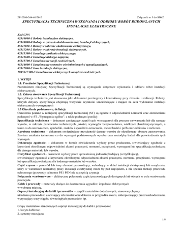 ZP-2380-264-61/2015 Załącznik nr 5 do SIWZ SPECYFIKACJA TECHNICZNA WYKONANIA I ODBIORU ROBÓT BUDOWLANYCH INSTALACJE ELEKTRYCZNE Kod CPV: 45310000-3 Roboty instalacyjne elektryczne, 45310000-0 Roboty w zakresie okablowania oraz instalacji elektrycznych, 45311100-1 Roboty w zakresie okablowania elektrycznego, 45311200-2 Roboty w zakresie instalacji elektrycznych, 45315300-1 Instalacje zasilania elektrycznego, 45315600-4 Instalacje niskiego napięcia, 45315700-5 Instalowanie stacji rozdzielczych, 45316000-5 Instalowanie systemów oświetleniowych i sygnalizacyjnych, 45317000-2 Inne instalacje elektryczne, 1045317300-5 Instalowanie elektrycznych urządzeń rozdzielczych. 1. WSTĘP 1.1. Przedmiot Specyfikacji Technicznej Przedmiotem niniejszej Specyfikacji Technicznej są wymagania dotyczące wykonania i odbioru robot instalacji elektrycznych. 1.2. Zakres stosowania Specyfikacji Technicznej Specyfikacja techniczna jest stosowana jako dokument przetargowy i kontraktowy przy zlecaniu i realizacji. Roboty, których dotyczy specyfikacja obejmują wszystkie czynności umożliwiające i mające na celu wykonanie instalacji elektrycznych wewnętrznych 1.3 Określenia podstawowe, definicje Określenia podane w niniejszej specyfikacji technicznej (ST) są zgodne z odpowiednimi normami oraz określeniami podanymi w ST „Wymagania ogólne”. a także podanymi poniżej: Specyfikacja techniczna – dokument zawierający zespół cech wymaganych dla procesu wytwarzania lub dla samego wyrobu, w zakresie parametrów technicznych, jakości, wymogów bezpieczeństwa, wielkości charakterystycznych, a także co do nazewnictwa, symboliki, znaków i sposobów oznaczania, metod badań i prób oraz odbiorów i rozliczeń. Aprobata techniczna – dokument stwierdzający przydatność danego wyrobu do określonego obszaru zastosowania. Zawiera ustalenia techniczne co do wymagań podstawowych wyrobu oraz metodykę badań dla potwierdzenia tych wymagań. Deklaracja zgodności – dokument w formie oświadczenia wydany przez producenta, stwierdzający zgodność z kryteriami określonymi odpowiednimi aktami prawnymi, normami, przepisami, wymogami lub specyfikacją techniczną dla danego materiału lub wyrobu. Certyfikat zgodności – dokument wydany przez upoważnioną jednostkę badającą (certyfikującą), stwierdzający zgodność z kryteriami określonymi odpowiednimi aktami prawnymi, normami, przepisami, wymogami lub specyfikacją techniczną dla badanego materiału lub wyrobu. Część czynna – przewód lub inny element przewodzący, wchodzący w skład instalacji elektrycznej lub urządzenia, który w warunkach normalnej pracy instalacji elektrycznej może by pod napięciem, a nie spełnia funkcji przewodu ochronnego (przewody ochronne PE i PEN nie są częścią czynną). Połączenia wyrównawcze – elektryczne połączenie części przewodzących dostępnych lub obcych w celu wyrównania potencjału. Kable i przewody – materiały służące do dostarczania sygnałów, impulsów elektrycznych w wybrane miejsce. Osprzęt instalacyjny do kabli i przewodów – zespół materiałów dodatkowych, stosowanych przy układaniu przewodów, ułatwiający ich montaż oraz dotarcie w przypadku awarii, zabezpieczający przed uszkodzeniami, wytyczający trasy ciągów równoległych przewodów itp. Grupy materiałów stanowiących osprzęt instalacyjny do kabli i przewodów: 1. koryta kablowe; 2. systemy mocujące; 1/8 ZP-2380-264-61/2015 Załącznik nr 5 do SIWZ 3. końcówki kablowe, gniazda elektryczne Urządzenia elektryczne – wszelkie urządzenia i elementy instalacji elektrycznej przeznaczone do wytwarzania, przekształcania, przesyłania, rozdziału lub wykorzystania energii elektrycznej. Odbiorniki energii elektrycznej – urządzenia przeznaczone do przetwarzania energii elektrycznej w inną formę energii (światło, ciepło, energię mechaniczną itp.). Klasa ochronności – umowne oznaczenie, określające możliwości ochronne urządzenia, ze względu na jego cechy budowy, przy bezpośrednim dotyku. Stopień ochrony IP – określona w PN-EN 60529:2003, umowna miara ochrony przed dotykiem elementów instalacji elektrycznej oraz przed przedostaniem się ciał stałych, wnikaniem cieczy (szczególnie wody) i gazów, a którą zapewnia odpowiednia obudowa. Obwód instalacji elektrycznej – zespół elementów połączonych pośrednio lub bezpośrednio ze źródłem energii elektrycznej za pomocą chronionego przed przetężeniem wspólnym zabezpieczeniem, kompletu odpowiednio połączonych przewodów elektrycznych. W skład obwodu elektrycznego wchodzą przewody pod napięciem, przewody ochronne oraz wszelkie urządzenia zmieniające parametry elektryczne obwodu, rozdzielcze, sterownicze i sygnalizacyjne, związane z danym punktem zasilania w energię (zabezpieczeniem). Przygotowanie podłoża – zespół czynności wykonywanych przed zamocowaniem osprzętu instalacyjnego, urządzenia elektrycznego, odbiornika energii elektrycznej, układaniem kabli i przewodów mający na celu zapewnienie możliwości ich zamocowania zgodnie z dokumentacją. Do prac przygotowawczych zalicza się następujące grupy czynności: 1. osadzanie kołków w podłożu; 2. montaż uchwytów do rur i przewodów; 3. montaż korytek, drabinek, listew i rur instalacyjnych; 4. oczyszczenie podłoża – przygotowanie do klejenia. 1.4. Ogólne wymagania dotyczące robot Ogólne wymagania dotyczące robot podano w dokumentacji projektowej. Instalacje powinny być wykonane zgodnie z Polskimi Normami, obecnie obowiązującym prawem budowlanym i wymaganiami wszelkich władz lokalnych, przepisów i regulacji terenowych. Wykonawca robot jest odpowiedzialny za jakość ich wykonania oraz ich zgodność z dokumentacją projektową,specyfikacją techniczną i poleceniami Zamawiającego oraz za bezpieczeństwo i higienę pracy. Odbiór placu budowy Przed rozpoczęciem robot instalacji elektrycznych wykonawca powinien zapoznać się z bud