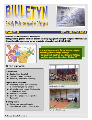 ZWIASTUN LUTY – MARZEC 2014 Gazetka szkolna wznawia działalność ! Redagowanie gazetki szkolnej przez uczniów pragnących rozwijać swoje zainteresowania dziennikarskie rozpocznie się od września roku szkolnego 2014/2015. Zdrowych pogodnych Świąt Wielkanocnych, radosnego wiosennego nastroju i serdecznych spotkań z najbliższymi składa redakcja biuletynu. Wesołego Alleluja !!! W tym numerze: Aktualności Sześciolatki do szkoły Gimnazjum bez tajemnic Konkursy, konkursy, konkursy … Wydarzenia sportowe Wiosenny turniej piłki siatkowej o puchar sołtysa wsi Górzyn Wywiad z panią Irminą Malinowską o jej życiowej pasji Zawody w unihokeju Zawody w piłce nożnej o puchar Tymbarka Sześciolatki do szkoły Sprawy rożne Ogłoszenie o poszukiwaniu materiałów z historii naszej szkoły Turniej piłki siatkowej Redakcja: Danuta Kowalska AKTUALNOŚCI Sześciolatki do szkoły Zgodnie z nowelizacją ustawy o systemie oświaty dzieci urodzone w okresie 1stycznia – 30 czerwca 2008r. pójdą w wieku sześciu lat obowiązkowo do szkoły 1 września 2014r. Wraz z siedmiolatkami urodzonymi w 2007r. Do szkoły będą mogły pójść także pozostałe dzieci z tego rocznika urodzone w okresie od 1 lipca do 31 grudnia 2008r. jeśli rodzice tak zdecydują. Z naszego rejonu rodzice już podjęli decyzję. Po zapisach dzieci wszystko wskazuje na to, że będą 2 grupy. 15 – sześciolatków i 16 – siedmiolatków. Decyzję rodziców poprzedziły między innymi: spotkanie połączone z prezentacją multimedialną „ sześciolatek idzie do szkoły” , rozmowy z nauczycielami, dyrektorem szkoły oraz specjalistami z Poradni Psychologiczno- Pedagogicznej w Lubsku. Spotkaniem podsumowującym a zarazem rozpoczynającym nowe wyzwania dla dzieci, był festyn zatytułowany „W szkole jest fajnie”. Pomysłodawczynie imprezy pani Magda Stasik i pani Elżbieta Czerw zaprosiły przyszłych uczniów i ich rodziców do wspólnej zabawy. Dzieci sprawdzały swoje umiejętności manualne, matematyczne, komunikacyjne i sprawnościowe. Po tak „wyczerpującej” zabawie zostały nagrodzone upominkami biurowymi i słodkim poczęstunkiem. Gimnazjum bez tajemnic 21marca uczniowie klasy VI odwiedzili Gimnazjum Nr1 im. Królowej Jadwigi w Lubsku uczestnicząc w Dniu Otwartym pod hasłem „Od Unii Lubelskiej do Unii Europejskiej”. Społeczność Gimnazjum organizując dla kolegów i koleżanek ze szkół podstawowych prezentację swojej szkoły przygotowała: – zwiedzanie szkoły, – fizyczne i chemiczne „czary mary”, – warsztaty geograficzne i biologiczne, – spektakl teatralny, – oraz prezentacje gimnazjalistów. Konkursy, konkursy, konkursy … Omnibus W konkursie wiedzy ogólnej dla uczniów klas VI Szkół Podstawowych Miasta i Gminy Lubsko uczestniczy troje uczniów naszej szkoły. Celem konkursu jest rozbudzanie wśród uczniów zainteresowań, wykrywanie i rozwijanie uzdolnień, pobudzanie do twórczego myślenia, podnoszenia poziomu wiedzy i umiejętności jej stosowania w działaniu praktycznym. Tematyka konkursu wykracza ponad program przedmiotów szkolnych. Konkurs trwa od października do maja a ogłoszenie wyników i rozdanie nagród nastąpi w czerwcu. W każdym etapie konkursu (raz w miesiącu) można zdobyć maksymalnie 50 punktów. Punktacja na m-c luty przedstawiała się następująco: 1.Patrycja Ostapowicz- 106 2.Kacper Kostka- 84 3.Sandra Zielonko- 66 W konkursie prowadzi uczeń Szkoły Podstawowej nr 1 w Lubsku uzyskując 181 p. Konkurs matematyczny Systematyczna i wytrwała praca opłaciła się. Nasz uczeń Wojciech Stuła zdobył 34 punkty na 40 możliwych i został finalistą konkursu matematycznego organizowanego przez Lubuskiego Kuratora Oświaty. Konkurs rozpoczął etap rejonowy, w którym uczestniczyły 2 osoby. Patrycja Ostapowicz z kl. VI oraz Wojciech Stuła z kl. V Dnia 22 lutego 2014r. Wojtek wziął udział w etapie wojewódzkim i zdobył tytuł finalisty. Uczeń posiada duży potencjał, który rozwija między innymi na kółku matematycznym. Życzymy dalszych sukcesów. Do konkursu przygotowywała ucznia pani Kazimiera Muzyka. Konkurs interdyscyplinarny „Ja to wiem” Konkurs Interdyscyplinarny dla uczniów szkół podstawowych „JA TO WIEM”, adresowany był do uczniów klas IV- VI. Organizatorem było Niepubliczne Gimnazjum dla Młodzieży im. Noblistów Polskich w Lubsku. Konkurs obejmował treści podstaw programowych z przedmiotów: – język polski, – historia, – przyroda, – matematyka. Konkurs na etapie szkolnym przeprowadzony był 28 lutego 2014r we wszystkich szkołach tego samego dnia i polegał na rozwiązaniu przesłanego do szkół testu. Do etapu finałowego, każda ze szkół mogła zgłosić maksymalnie 3 uczniów, którzy uzyskali największą liczbę punktów na etapie szkolnym. Z naszej szkoły były to osoby z klasy VI: Sandra Zielonko, Oliwia Musielak, Patrycja Ostapowicz. W etapie finałowym uczennica Oliwia Musielak zdobyła wyróżnienie . Turniej szachowy W Grand Prix Lubska Szkół Podstawowych w szachach w roku szkolnym 2013/2014 uczestniczący uczniowie zdobyli indywidualnie do m-ca marca następującą ilość punktów: 1. Kacper Kostka kl. VI- 13,5p. 2. Maciej Barski kl. V- 11p. 3. Wojciech Stuła kl. V- 9p. 4. Nikodem Stuła kl. III- 7p. 5. Piotr Żekieć kl. VI- 6p. 6. Klaudia Gwozdowska kl. VI- 5p. 7. Patrycja Ostapowicz kl. VI- 3,5p. 8. Jakub Rzeżawski kl. V- 3,5p. 9. Mikołaj Lewicki kl. VI- 3p. 10. Nikola Majkut kl. III- 2,5p. 11. Konrad Lisowiec kl. IV- 2p. 12. Kamil Rejner kl. IV- 2p. 13. Gabriela Kirmiel kl. IV- 1p. Uczniowie przygotowują się do rozgrywek pod kierunkiem pani Elżbiety Sokal. Konkurs recytatorski 20 lutego 2014 r. odbył się w szkole Lubski Konkurs Recytatorski. Był to etap szkolny. Wzięło w nim udział 18-stu uczniów z klas I – VI. Do etapu rejonowego zakwalifikowało się 6 osób. W kategorii młodszej: Małgorzata Radzion kl. III, Elżbieta Staniszewska kl. I, Weronika Kołodz