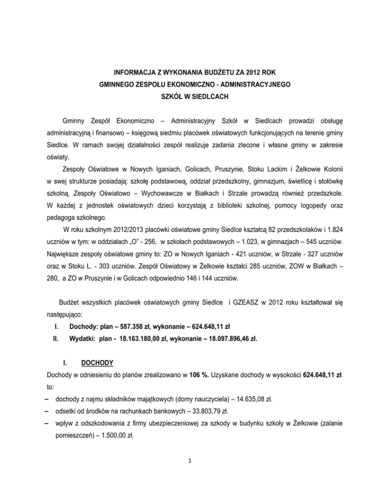 INFORMACJA Z WYKONANIA BUDŻETU ZA 2012 ROK GMINNEGO ZESPOŁU EKONOMICZNO - ADMINISTRACYJNEGO SZKÓŁ W SIEDLCACH Gminny Zespół Ekonomiczno – Administracyjny Szkół w Siedlcach prowadzi obsługę administracyjną i finansowo – księgową siedmiu placówek oświatowych funkcjonujących na terenie gminy Siedlce. W ramach swojej działalności zespół realizuje zadania zlecone i własne gminy w zakresie oświaty. Zespoły Oświatowe w Nowych Iganiach, Golicach, Pruszynie, Stoku Lackim i Żelkowie Kolonii w swej strukturze posiadają: szkołę podstawową, oddział przedszkolny, gimnazjum, świetlicę i stołówkę szkolną. Zespoły Oświatowo – Wychowawcze w Białkach i Strzale prowadzą również przedszkole. W każdej z jednostek oświatowych dzieci korzystają z biblioteki szkolnej, pomocy logopedy oraz pedagoga szkolnego. W roku szkolnym 2012/2013 placówki oświatowe gminy Siedlce kształcą 82 przedszkolaków i 1.824 uczniów w tym: w oddziałach „O” - 256, w szkołach podstawowych – 1.023, w gimnazjach – 545 uczniów. Największe zespoły oświatowe gminy to: ZO w Nowych Iganiach - 421 uczniów, w Strzale - 327 uczniów oraz w Stoku L. - 303 uczniów. Zespół Oświatowy w Żelkowie kształci 285 uczniów, ZOW w Białkach – 280, a ZO w Pruszynie i w Golicach odpowiednio 146 i 144 uczniów. Budżet wszystkich placówek oświatowych gminy Siedlce i GZEASZ w 2012 roku kształtował się następująco: I. Dochody: plan – 587.358 zł, wykonanie – 624.648,11 zł II. Wydatki: plan - 18.163.180,00 zł, wykonanie – 18.097.896,46 zł. I. DOCHODY Dochody w odniesieniu do planów zrealizowano w 106 %. Uzyskane dochody w wysokości 624.648,11 zł. to: – dochody z najmu składników majątkowych (domy nauczyciela) – 14.635,08 zł. – odsetki od środków na rachunkach bankowych – 33.803,79 zł. – wpływ z odszkodowania z firmy ubezpieczeniowej za szkody w budynku szkoły w Żelkowie (zalanie pomieszczeń) – 1.500,00 zł. 1 – opłaty rodziców za pobyt dzieci w przedszkolu powyżej pięciu godzin dziennie oraz zajęcia dodatkowe (język angielski) – 23.646,74 zł. w tym Białki – 13.133,25 Strzała – 10.513,49. – opłaty rodziców za wyżywienie dzieci w przedszkolu – 54.911 zł. w tym: Białki - 22.021 ; Strzała 25.890. – opłaty rodziców za wyżywienie dzieci w stołówkach szkolnych – 496.151,50 zł. w tym: Białki 74.043,40; Iganie - 96.180; Stok Lacki - 112.240; Strzała - 119.403,50; Żelków - 94.284,60. II. WYDATKI Na działalność oświaty i wychowania w analizowanym okresie sprawozdawczym zaplanowano środki w wysokości 18.163.180 zł., z czego wykorzystano kwotę 18.097.896,46 zł, co stanowi 99,64%. Z ogólnej kwoty wykonanych wydatków przypada na: świadczenia na rzecz osób fizycznych – 994.056,23 zł. w tym dodatek wiejski i mieszkaniowy dla nauczycieli – 710.090,04 zł; stypendia naukowe i sportowe dla uczniów – 57.689 zł; pomoc materialna dla uczniów – 167.126 zł; wyprawka szkolna – 30.150 zł. wydatki bieżące jednostek oświatowych – 16.944.267,48 zł. wydatki majątkowe – 35.327,69 zł. tj. w ZO Iganie - zakup kuchni gazowej 4-palnikowej 9.827,70; w ZOW Strzała: zakup urządzenia wielofunkcyjnego (kopiarko-drukarki) 5.499,99 oraz wymiana pieca centralnego ogrzewania w domu nauczyciela 20.000 zł; wydatki na realizację projektów unijnych w ramach Programu Operacyjnego Kapitał Ludzki 124.245,06 zł. Wydatki bieżące jednostek obejmują: wynagrodzenia i pochodne wynagrodzeń (składki ZUS pracodawcy) 277 pracowników (262,40 etaty) zatrudnionych w placówkach oświatowych gminy Siedlce i GZEASz - 14.016.014,80 zł, tj. 77,45% wszystkich wydatków. W 2012 roku w ramach środków na wynagrodzenia wypłacono: jednorazowy dodatek uzupełniający dla nauczycieli za 2011 r. na kwotę 316.588,17 zł, 29 nagród jubileuszowych na kwotę 129.643,87 zł, wynagrodzenie za godziny ponadwymiarowe i zastępstwa – 687.756,40 zł. zwrot kosztów dojazdów uczniów do szkoły – 202.806,89 zł, dokształcanie i doskonalenie nauczycieli – 42.575,60 zł, odpisy na Zakładowy Fundusz Świadczeń Socjalnych (zfśs) pracowników i emerytów - 690.910 zł, zakup usług remontowych – 257.216,08 zł, zakup środków żywności do przedszkoli – 58.199,95 zł, do stołówek szkolnych – 475.482,57 zł 2 pozostałe wydatki bieżące (zakup mebli szkolnych i biurowych, materiałów biurowych, książek, pomocy dydaktycznych, zakup paliwa do samochodu służbowego, dostawa energii cieplnej, elektrycznej i wody, opłaty za badania okresowe pracowników, usługi telekomunikacyjne, pocztowe, wywóz nieczystości, monitoring, dofinansowanie dokształcania pracowników i opłaty za szkolenia, opłaty licencyjne za programy komputerowe, ubezpieczenia majątkowe, itp.) – 1.201.061,59 zł Wydatki w poszczególnych rozdziałach klasyfikacji budżetowej zrealizowano w następującym zakresie: Tabela Nr 1. Wykonanie wydatków w poszczególnych rozdziałach klasyfikacji budżetowej. Wyszczególnienie Wykonanie (zł) % Wykonania 9 554 291,00 9 529 244,69 99,74% Oddziały przedszkolne w szkołach podstawowych - 80103 920 843,00 916 332,47 99,51% Przedszkola - 80104 680 680,00 677 923,21 99,59% 3 724 078,00 3 718 649,16 99,85% 203 021,00 202 806,89 99,89% 594 853,00 589 657,58 99,13% 44 314,00 42 575,60 96,08% 1 200 047,00 1 193 281,63 99,44% 138 085,00 135 774,00 98,33% 99 992,00 99 985,22 99,99% 761 526,00 757 845,17 99,52% 203 589,00 197 276,00 96,90% 7 285,00 7 285,00 100,00% 25 576,00 24 259,84 94,85% 5 000,00 5 000,00 100,00% 18 163 180,00 18 097 896,46 99,64% Szkoły Podstawowe - 80101 Gimnazja - 80110 Dowożenie uczniów do szkół - 80113 Gminny Zespół EkonomicznoAdministracyjny Szkół - 80114 Dokształcanie i doskonalenie nauczycieli - 80146 Stołówki szkolne - 80148 Pozostałe zadania w zakresie oświaty - 80195 Pomoc społeczna-pozostała działalność – 85295 Świetlice szkolne - 85401 Pomoc materialna dla uczni
