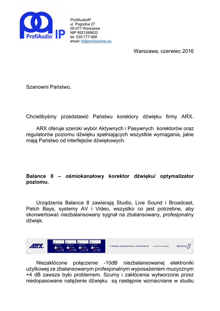 ProfiAudioIP ul. Pogodna 27 05-077 Warszawa NIP 9521268632 tel. 535-777-568 email: [email protected] Warszawa, czerwiec 2016 Szanowni Państwo, Chcielibyśmy przedstawić Państwu korektory dźwięku firmy ARX. ARX oferuje szeroki wybór Aktywnych i Pasywnych korektorów oraz regulatorów poziomu dźwięku spełniających wszystkie wymagania, jakie mają Państwo od interfejsów dźwiękowych. Balance 8 – ośmiokanałowy korektor dźwięku/ optymalizator poziomu. Urządzenia Balance 8 zawierają Studio, Live Sound i Broadcast, Patch Bays, systemy AV i Video, wszystko co jest potrzebne, aby skonwertować niezbalansowany sygnał na zbalansowany, profesjonalny dźwięk. Niezakłócone połączenie -10dB niezbalansowanej elektroniki użytkowej ze zbalansowanym profesjonalnym wyposażeniem muzycznym +4 dB zawsze było problemem. Szumy i zakłócenia wytworzone przez niedopasowane natężenie dźwięku są następnie wzmacniane w studiu lub przez system nagłośnieniowy. Balancer 8 równoważy poziomy dźwięku -10dB ze źródeł nieprofesjonalnych i bezproblemowo przekształca je w zbalansowany sygnał odbierany przez wszystkie profesjonalne systemy audio. Wejścia to niesymetryczne złącza RCA, wyjścia zestandaryzowane XLR. Para pokręteł Gain Mode na przednim panelu pozwala na wybór wzmocnienia dźwięku za pomocą Balance 8, a także optymalizację poziomu dźwięku od -10 dB do +4 dB . Lampki LED znajdujące się na przednim panelu pokazują, które funkcje urządzenia są aktywne. De Balance 8 8 channel Audio DeBalancer / Level Optimizer De Balance 8 zawiera wszystko co jest potrzebne, aby dokonać konwersji zbalansowanego sygnału na nie zbalansowany. Prędzej czy później zachodzi potrzeba konwersji zbalansowanych wyjść Pro Audio na niezbalansowane, aby bez zakłóceń współpracowały z nieprofesjonalnymi wejściami niezbalansowanymi. De Balance 8 konwertuje poziom +4dB z profesjonalnych systemów audio na niezbalansowany sygnał dla takich urządzeń jak ekrany LED, LCD oraz innych sprzętów powszechnego użytku. Wejście to standardowe XLR, wyjścia to niezbalansowane złącza RCA. Lampki LED na przednim panelu wskazują na funkcje, które są aktywne. Audibox ISO Balancer Audibox ISO Balancer konwertuje niezbalansowany sygnał o niskiej impedencji na sygnał zbalansowany, przeznaczony dla profesjonalnego sprzętu i przesyłania długimi kablami. Transformer Ground Isolation sprawia, że dźwięk jest przesyłany bez zakłóceń. Urządzenie pasywne - nie wymaga zasilania. Audibox ISO DeBalancer De-Balancer konwertuje zbalansowany sygnał stereo o niskiej impedencji na sygnał niezbalansowany. Pozwala to na zachowanie zbalansowanego sygnału przez całą drogę z wyjścia do wejścia niezbalansowanego, minimalizując zakłócenia i szumy odbioru. Transformer Ground Isolation zapewnia cichą pracę. Urządzenie pasywne- nie wymaga zasilania. Chętnie udzielimy wszystkich informacji handlowych i technicznych. Prosimy o kontakt mailowy lub telefoniczny od poniedziałku do piątku w godzinach od 8 do 16. Z poważaniem Karolina Łuniewska Asystentka działu Marketingu i Sprzedaży ProfiAudioIP