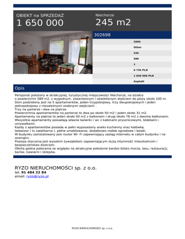 OBIEKT na SPRZEDAŻ 1 650 000 Niechorze 245 m2 302698 2000 Other 245 589 1 6 735 PLN 1 650 000 PLN Asphalt Opis Pensjonat położony w atrakcyjnej, turystycznej miejscowości Niechorze, na działce o powierzchni 589 m2, z wygodnym, utwardzonym i oświetlonym dojściem do plaży około 100 m. Dom podzielony jest na 5 apartamentów, jeden trzypokojowy, trzy dwupokojowych i jeden jednopokojowy z niezależnymi osobnymi wejściami . Trzy na parterze i dwa na piętrze. Powierzchnia apartamentów na parterze to dwa po około 50 m2 i jeden około 31 m2. Apartamenty na piętrze to jeden około 50 m2 z balkonem i drugi około 78 m2 z dwoma balkonami. Wszystkie apartamenty posiadają własne łazienki / wc z kabinami prysznicowymi, bidetami i umywalkami. Każdy z apartamentów posiada w pełni wyposażony aneks kuchenny oraz lodówkę. telewizor ( tv satelitarna ), pełne umeblowanie, dodatkowo meble ogrodowe i leżaki. W budynku zainstalowany jest router Wi- Fi zapewniający zasięg internetu w całym budynku i na zewnątrz. Posesja otoczona jest wysokim żywopłotem zapewniającym dużą intymność mieszkańcom i bezpieczeństwo dzieciom. Oferta godna polecenia ze względu na atrakcyjne położenie bardzo blisko morza, lasu, restauracji, barów, kawiarni i sklepów. RYZO NIERUCHOMOŚCI sp. z o.o. tel. 91 484 22 84 email: [email protected] RYZO NIERUCHOMOŚCI sp. z o.o. Powered by TCPDF (www.tcpdf.org)