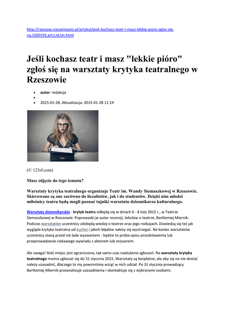 http://rzeszow.naszemiasto.pl/artykul/jesli-kochasz-teatr-i-masz-lekkie-pioro-zglos-siena,3260192,art,t,id,tm.html Jeśli kochasz teatr i masz "lekkie pióro" zgłoś się na warsztaty krytyka teatralnego w Rzeszowie autor: redakcja 2015-01-28, Aktualizacja: 2015-01-28 11:19 (© 123rf.com) Masz zdjęcie do tego tematu? Warsztaty krytyka teatralnego organizuje Teatr im. Wandy Siemaszkowej w Rzeszowie. Skierowane są one zarówno do licealistów, jak i do studentów. Dzięki nim młodzi miłośnicy teatru będą mogli poznać tajniki warsztatu dziennikarza kulturalnego. Warsztaty dziennikarskie - krytyk teatru odbędą się w dniach 6 - 8 luty 2015 r., w Teatrze Siemaszkowej w Rzeszowie. Poprowadzi je autor recenzji, tekstów o teatrze, Bartłomiej Miernik. Podczas warsztatów uczestnicy zdobędą wiedzę o teatrze oraz jego rodzajach. Dowiedzą się też jak wygląda krytyka teatralna od kuchni i jakich błędów należy się wystrzegać. Na koniec warsztatów uczestnicy staną przed nie lada wyzwaniem - będzie to próba opisu przedstawienia lub przeprowadzenie ciekawego wywiadu z aktorem lub reżyserem. Ale uwaga! Ilość miejsc jest ograniczona, tak samo czas nadsyłania zgłoszeń. Na warsztaty krytyka teatralnego można zgłaszać się do 31 stycznia 2015. Warsztaty są bezpłatne, ale aby się na nie dostać należy uzasadnić, dlaczego to my powinniśmy wziąć w nich udział. Po 31 stycznia prowadzący Bartłomiej Miernik przeanalizuje uzasadnienia i skontaktuje się z wybranymi osobami.
