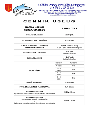 CENNIK USŁUG NAZWA USŁUGI RODZAJ ZABIEGU CENA / CZAS WYNAJĘCIE KAWIARNI 30 zł / godz. SOLARIUM STOJĄCE LUB LEŻĄCE 1,23 zł / min. POKOJE 2-OSOBOWE Z ŁAZIENKAMI I ANEKSEM KUCHENNYM 30,00 zł / doba od osoby w tym 1 godz. basenu dziennie gratis ŁAŹNIA PAROWA Z BASENEM 12 zł / godz. dopłata 1 zł za 5min SAUNA Z BASENEM 12 zł / godz. dopłata 1 zł za 5min SAUNA FIŃSKA Ilość osób 1 godzina 1 osoba 16 zł 2–3 osób 4–5 osób 6–8 osób 24 zł 32 zł 44 zł MASAŻ „HYDRO-JET” 0,50 zł / min FOTEL Z MASAŻEM LUB TLENOTERAPIA 0,50 zł / min WANNA-KAPSUŁA SPA Hydromasaż, masaż powietrzny - (bąbelkowy), koloroterapia 10,00 zł / 30 min WANNA-KAPSUŁA SPA sauna parowa, sauna ir – podczerwień + hydromasaż, masaż powietrzny, koloroterapia, aromoterapia 30,00 zł / 30 min
