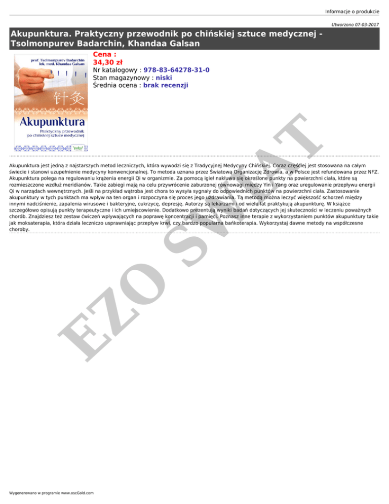 Informacje o produkcie Utworzono 07-03-2017 Akupunktura. Praktyczny przewodnik po chińskiej sztuce medycznej Tsolmonpurev Badarchin, Khandaa Galsan Cena : 34,30 zł IA T Nr katalogowy : 978-83-64278-31-0 Stan magazynowy : niski Średnia ocena : brak recenzji EZ O ŚW Akupunktura jest jedną z najstarszych metod leczniczych, która wywodzi się z Tradycyjnej Medycyny Chińskiej. Coraz częściej jest stosowana na całym świecie i stanowi uzupełnienie medycyny konwencjonalnej. To metoda uznana przez Światową Organizację Zdrowia, a w Polsce jest refundowana przez NFZ. Akupunktura polega na regulowaniu krążenia energii Qi w organizmie. Za pomocą igieł nakłuwa się określone punkty na powierzchni ciała, które są rozmieszczone wzdłuż meridianów. Takie zabiegi mają na celu przywrócenie zaburzonej równowagi między Yin i Yang oraz uregulowanie przepływu energii Qi w narządach wewnętrznych. Jeśli na przykład wątroba jest chora to wysyła sygnały do odpowiednich punktów na powierzchni ciała. Zastosowanie akupunktury w tych punktach ma wpływ na ten organ i rozpoczyna się proces jego uzdrawiania. Tą metodą można leczyć większość schorzeń między innymi nadciśnienie, zapalenia wirusowe i bakteryjne, cukrzycę, depresję. Autorzy są lekarzami i od wielu lat praktykują akupunkturę. W książce szczegółowo opisują punkty terapeutyczne i ich umiejscowienie. Dodatkowo prezentują wyniki badań dotyczących jej skuteczności w leczeniu poważnych chorób. Znajdziesz też zestaw ćwiczeń wpływających na poprawę koncentracji i pamięci. Poznasz inne terapie z wykorzystaniem punktów akupunktury takie jak moksaterapia, która działa leczniczo usprawniając przepływ krwi, czy bardzo popularna bańkoterapia. Wykorzystaj dawne metody na współczesne choroby. Wygenerowano w programie www.oscGold.com