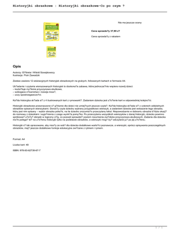 Historyjki obrazkowe : Historyjki obrazkowe-Co po czym ? Nie ma jeszcze oceny Cena sprzeda?y 37,90 z? Cena sprzeda?y z rabatem Opis Autorzy: El?bieta i Witold Szwajkowscy Ilustracje: Piotr Zawadzki Zestaw zawiera 12 edukacyjnych historyjek obrazkowych na grubych, foliowanych kartach w formacie A4. Uk?adanie i czytanie wierszowanych historyjek to doskona?a zabawa, która jednocze?nie wspiera rozwój dzieci: – kszta?tuje my?lenie przyczynowo-skutkowe, – wzbogaca s?ownictwo i rozwija mow?, – uczy spostrzegawczo?ci. Ka?da historyjka sk?ada si? z 4 ilustrowanych kart z rymowank?. Zadaniem dziecka jest u?o?enie kart w odpowiedniej kolejno?ci. Historyjki obrazkowe przeznaczone s? g?ównie dla dzieci nie umiej?cych jeszcze czyta?. Ka?da historyjka sk?ada si? z czterech oddzielnych obrazków opisanych wierszykami. Doros?y czyta dziecku wybrany przypadkowo wierszyk, a zadaniem dziecka jest wskazanie tego obrazka, który jest nim opisany – wybór obrazka poka?e, na ile dziecko zrozumia?o przeczytany tekst. Niepowodzenie w dobraniu obrazka b?dzie okazj? do rozmowy z dzieckiem i wyja?nienia z czego wynik?a pomy?ka. Po przeczytaniu wszystkich wierszyków z danej historyjki, dziecko powinno spróbowa? u?o?y? obrazki w logiczny ci?g, co pozwoli sprawdzi? poziom rozumienia zwi?zków przyczynowo-skutkowych. Zadanie dla dziecka mo?e polega? te? na u?o?eniu historyjki tylko na podstawie obrazków, a wierszyki mog? by? odczytane ju? po jej u?o?eniu. Historyjki s? tak opracowane, aby nios?y ze sob? dla dziecka dodatkowe warto?ci poznawcze, a wierszyki, oprócz opisywania poszczególnych obrazków, maj? jeszcze dodatkowe funkcje edukacyjne zwi?zane z rytmem i rymem. Format: A4 Liczba kart: 48 ISBN: 978-83-62739-67-7 1 / 1 Powered by TCPDF (www.tcpdf.org)