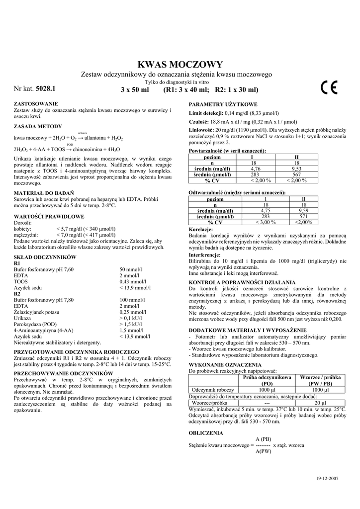 KWAS MOCZOWY Zestaw odczynnikowy do oznaczania stężenia kwasu moczowego Tylko do diagnostyki in vitro Nr kat. 5028.10150 3 x 50 ml (R1: 3 x 40 ml; R2: 1 x 30 ml) ZASTOSOWANIE Zestaw służy do oznaczania stężenia kwasu moczowego w surowicy i osoczu krwi. ZASADA METODY urikaza kwas moczowy + 2H2O + O2 → allantoina + H2O2 POD 2H2O2 + 4-AA + TOOS → chinonoimina + 4H2O Urikaza katalizuje utlenianie kwasu moczowego, w wyniku czego powstaje allantoina i nadtlenek wodoru. Nadtlenek wodoru reaguje następnie z TOOS i 4-aminoantypiryną tworząc barwny kompleks. Intensywość zabarwienia jest wprost proporcjonalna do stężenia kwasu moczowego. MATERIAŁ DO BADAŃ Surowica lub osocze krwi pobranej na heparynę lub EDTA. Próbki można przechowywać do 5 dni w temp. 2-8°C. WARTOŚĆI PRAWIDŁOWE Dorośli: kobiety: < 5,7 mg/dl (< 340 µmol/l) mężczyźni: < 7,0 mg/dl (< 417 µmol/l) Podane wartości należy traktować jako orientacyjne. Zaleca się, aby każde laboratorium określiło własne zakresy wartości prawidłowych. SKŁAD ODCZYNNIKÓW R1 Bufor fosforanowy pH 7,60 EDTA TOOS Azydek sodu R2 Bufor fosforanowy pH 7,80 EDTA Żelazicyjanek potasu Urikaza Peroksydaza (POD) 4-Aminoantypiryna (4-AA) Azydek sodu Niereaktywne stabilizatory i detergenty. 50 mmol/l 2 mmol/l 0,43 mmol/l < 13,9 mmol/l 100 mmol/l 2 mmol/l 0,25 mmol/l > 0,1 kU/l > 1,5 kU/l 1,5 mmol/l < 13,9 mmol/l PRZYGOTOWANIE ODCZYNNIKA ROBOCZEGO Zmieszać odczynniki R1 i R2 w stosunku 4 + 1. Odczynnik roboczy jest stabilny przez 4 tygodnie w temp. 2-8°C lub 14 dni w temp. 15-25°C. PRZECHOWYWANIE ODCZYNNIKÓW Przechowywać w temp. 2-8°C w oryginalnych, zamkniętych opakowaniach. Chronić przed kontaminacją i bezpośrednim światłem słonecznym. Nie zamrażać. Po otwarciu odczynniki prawidłowo przechowywane i chronione przed zanieczyszczeniem są stabilne do daty ważności podanej na opakowaniu. PARAMETRY UŻYTKOWE Limit detekcji: 0,14 mg/dl (8,33 µmol/l) Czułość: 18,8 mA x dl / mg (0,32 mA x l / µmol) Liniowość: 20 mg/dl (1190 µmol/l). Dla wyższych stężeń próbkę należy rozcieńczyć 0,9 % roztworem NaCl w stosunku 1+1; wynik oznaczenia pomnożyć przez 2. Powtarzalność (w serii oznaczeń): poziom I 18 n 4,76 średnia (mg/dl) 283 średnia (µmol/l) < 2,00 % % CV II 18 9,53 567 < 2,00 % Odtwarzalność (między seriami oznaczeń): I II poziom 18 18 n 4,75 9,59 średnia (mg/dl) 283 571 średnia (µmol/l) < 3,00 % <2,00% % CV Korelacje: Badania korelacji wyników z wynikami uzyskanymi za pomocą odczynników referencyjnych nie wykazały znaczących różnic. Dokładne wyniki badań są dostępne na życzenie. Interferencje: Bilirubina do 10 mg/dl i lipemia do 1000 mg/dl (triglicerydy) nie wpływają na wyniki oznaczenia. Inne substancje i leki mogą interferować. KONTROLA POPRAWNOŚCI DZIAŁANIA Do kontroli jakości oznaczeń stosować surowice kontrolne z wartościami kwasu moczowego zmetrykowanymi dla metody enzymatycznej z urikazą i peroksydazą lub dla innej, równoważnej metody. Nie stosować odczynników, jeżeli absorbancja odczynnika roboczego mierzona wobec wody przy długości fali 500 nm jest wyższa niż 0,200. DODATKOWE MATERIAŁY I WYPOSAŻENIE - Fotometr lub analizator automatyczny umożliwiający pomiar absorbancji przy długości fali w zakresie 530 – 570 nm. - Wzorzec kwasu moczowego lub kalibrator. - Standardowe wyposażenie laboratorium diagnostycznego. WYKONANIE OZNACZENIA Do probówek reakcyjnych napipetować: Próba odczynnikowa Wzorzec / próbka (PO) (PW / PB) Odczynnik roboczy 1000 µl 1000 µl Doprowadzić do temperatury oznaczania, następnie dodać: Wzorzec/próbka --20 µl Wymieszać, inkubować 5 min. w temp. 37°C lub 10 min. w temp. 25°C. Odczytać absorbancję próby wzorcowej i próby badanej wobec próby odczynnikowej przy dł. fali 530 - 570 nm. OBLICZENIA A (PB) Stężenie kwasu moczowego = -------- x stęż. wzorca A(PW) 19-12-2007 INFORMACJE DODATKOWE 1. Odczynniki zawierają śladowe ilości azydku sodu. Przy pracy z odczynnikami stosować środki ostrożności typowe dla rutynowych prac laboratoryjnych. 2. Odpady utylizować zgodnie z obowiązującymi przepisami – przez termiczne przekształcanie lub odpowiednimi metodami obróbki fizyczno-chemicznej. 3. Aplikacje do analizatorów automatycznych dostarczamy na życzenie. 4. Wzorzec kwasu moczowego i multikalibrator do analizatorów automatycznych należy nabywać osobno REFERENCJE 1. Thefeld W., Hoffmeister H., Busch E. W., Koller P. U., Vollmar J.: Normalwerte der Serumharnsaure in Abhangigkeit von Alter und Geschlecht mit einem neuen enzymatischen Harnsaurefarbtest. Dtsch. Med. Wschr., 98, 380 (1973). 2. Fossati P., Prencipe L., Berti G.: Use of 3,5-dichloro-2-hydroxy-benzenesulfonic acid / 4-aminophenazone chromogenic system in direct enzymic assay of uric acid in serum and urine. Clin. Chem., 26/2, 227-231 (1980). 3. Roche Molecular Biochemicals: Uric acid liquid reagent: a tool for your test development (2000). 4. Young D. S.: Effects of drugs on clinical laboratory tests, AACC Press, 4th ed. (1995). STOSOWANE SYMBOLE GRAFICZNE - OBJAŚNIENIA: CONT. zawartość numer katalogowy przed użyciem zapoznać się z instrukcją wyrób do diagnostyki in vitro temperatura przechowywania producent numer serii data ważności 19-12-2007