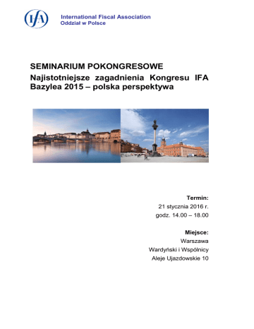 International Fiscal Association Oddział w Polsce SEMINARIUM POKONGRESOWE Najistotniejsze zagadnienia Kongresu IFA Bazylea 2015 – polska perspektywa Termin: 21 stycznia 2016 r. godz. 14.00 – 18.00 Miejsce: Warszawa Wardyński i Wspólnicy Aleje Ujazdowskie 10 International Fiscal Association Oddział w Polsce Agenda 14.00 – 14.05 OTWARCIE SEMINARIUM – Prof. dr hab. Hanna Litwińczuk / Uniwersytet Warszawski, Przewodnicząca Rady Nadzorczej Polskiego Oddziału IFA; Andrzej Puncewicz / Crido Taxand, Przewodniczący Zarządu Polskiego Oddziału IFA (5 min.) PROWADZENIE SEMINARIUM – Prof. dr hab. Włodzimierz Nykiel / Uniwersytet Łódzki, CDiSP, Członek Rady Nadzorczej Polskiego Oddziału IFA (zaproszony); Dariusz Wasylkowski / Wardyński i Wspólnicy, członek Permanent Scientific Committee of IFA 14.05 – 14.50 SESJA I – cześć pierwsza (45 min.) Zachęty podatkowe na rzecz badań i rozwoju (B+R) – Raport generalny i raport krajowy – prezentacja dr Piotr Augustyniak / K&L Gates, członek Rady Nadzorczej Polskiego Oddziału IFA; dr Katarzyna Bronżewska / PwC 14.50 – 15.05 PRZERWA KAWOWA (15 min.) 15.05 – 15.50 SESJA I – cześć druga (45 min) Zachęty podatkowe na rzecz badań i rozwoju (B+R ) – dyskusja z udziałem: dr Piotr Augustyniak / K&L Gates, członek Rady Nadzorczej Polskiego Oddziału IFA, dr Katarzyna Bronżewska / PWC; dr hab. Marcin Jamroży / SGH, Rödl & Partner; Aleksy Miarkowski / Uniwersytet Warszawski, Mazars; Joanna Prokurat / Wardyński i Wspólnicy, Koalicja na rzecz Polskich Innowacji; Beata Tylman / PwC, Koalicja na rzecz Polskich Innowacji 15.50 – 16.20 PRZERWA KAWOWA (30 min.) 16.20 – 17.05 SESJA II – cześć pierwsza (45 min.) Ochrona podstawowych praw podatników w praktyce – Raport generalny i raport krajowy – prezentacja Prof. dr hab. Adam Mariański / Uniwersytet Łódzki, Mariański Group, CDiSP, członek Zarządu Polskiego Oddziału IFA; Małgorzata Sęk / Uniwersytet Łódzki, CDiSP (zaproszona); dr Michał Wilk / Uniwersytet Łódzki, CDiSP 17.05 – 17.15 PRZERWA KAWOWA (10 min.) 17.15 – 18.00 SESJA II – cześć druga (45 min.) Ochrona podstawowych praw podatników w praktyce – Raport generalny i raport krajowy – dyskusja z udziałem: Prof. dr hab. Bogumił Brzeziński / Uniwersytet Mikołaja Kopernika, CDiSP (zaproszony); dr Dagmara Dominik-Ogińska / Wojewódzki Sąd Administracyjny we Wrocławiu; Rafał Iniewski / Rada Podatkowa Konfederacji Lewiatan; Prof. dr hab. Adam Mariański / Uniwersytet Łódzki, Mariański Group, CDiSP, członek Zarządu Polskiego Oddziału IFA; dr Artur Mudrecki, Naczelny Sąd Administracyjny; Małgorzata Sęk / Uniwersytet Łódzki, CDiSP (zaproszona); Halina Tomicka / Akademia Leona Koźmińskiego; dr Michał Wilk / Uniwersytet Łódzki, CDiSP Udział w seminarium jest bezpłatny. Liczba miejsc ograniczona. O rejestracji decyduje kolejność zgłoszeń. Potwierdzenia obecności prosimy kierować na adres: [email protected]