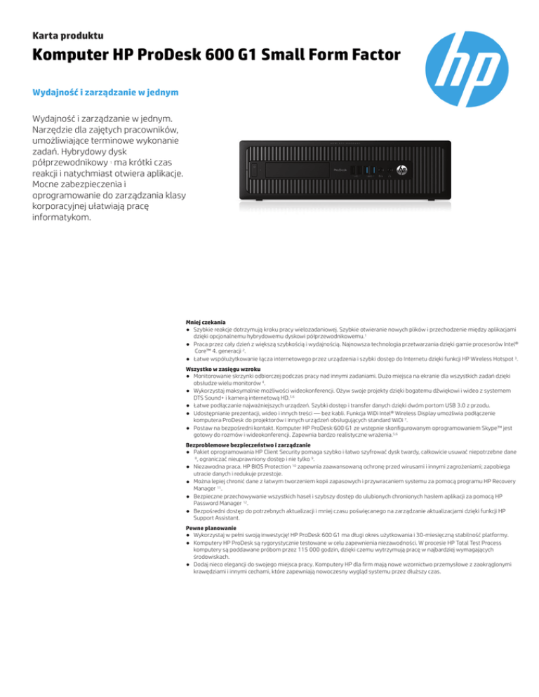 Karta produktu Komputer HP ProDesk 600 G1 Small Form Factor Wydajność i zarządzanie w jednym Wydajność i zarządzanie w jednym. Narzędzie dla zajętych pracowników, umożliwiające terminowe wykonanie zadań. Hybrydowy dysk półprzewodnikowy ma krótki czas reakcji i natychmiast otwiera aplikacje. Mocne zabezpieczenia i oprogramowanie do zarządzania klasy korporacyjnej ułatwiają pracę informatykom. 1 Mniej czekania ● Szybkie reakcje dotrzymują kroku pracy wielozadaniowej. Szybkie otwieranie nowych plików i przechodzenie między aplikacjami dzięki opcjonalnemu hybrydowemu dyskowi półprzewodnikowemu.1 ● Praca przez cały dzień z większą szybkością i wydajnością. Najnowsza technologia przetwarzania dzięki gamie procesorów Intel® Core™ 4. generacji 2. ● Łatwe współużytkowanie łącza internetowego przez urządzenia i szybki dostęp do Internetu dzięki funkcji HP Wireless Hotspot 3. Wszystko w zasięgu wzroku ● Monitorowanie skrzynki odbiorczej podczas pracy nad innymi zadaniami. Dużo miejsca na ekranie dla wszystkich zadań dzięki obsłudze wielu monitorów 4. ● Wykorzystaj maksymalnie możliwości wideokonferencji. Ożyw swoje projekty dzięki bogatemu dźwiękowi i wideo z systemem DTS Sound+ i kamerą internetową HD.5,6 ● Łatwe podłączanie najważniejszych urządzeń. Szybki dostęp i transfer danych dzięki dwóm portom USB 3.0 z przodu. ● Udostępnianie prezentacji, wideo i innych treści — bez kabli. Funkcja WiDi Intel® Wireless Display umożliwia podłączenie komputera ProDesk do projektorów i innych urządzeń obsługujących standard WiDi 7. ● Postaw na bezpośredni kontakt. Komputer HP ProDesk 600 G1 ze wstępnie skonfigurowanym oprogramowaniem Skype™ jest gotowy do rozmów i wideokonferencji. Zapewnia bardzo realistyczne wrażenia.5,6 Bezproblemowe bezpieczeństwo i zarządzanie ● Pakiet oprogramowania HP Client Security pomaga szybko i łatwo szyfrować dysk twardy, całkowicie usuwać niepotrzebne dane 8, ograniczać nieuprawniony dostęp i nie tylko 9. ● Niezawodna praca. HP BIOS Protection 10 zapewnia zaawansowaną ochronę przed wirusami i innymi zagrożeniami; zapobiega utracie danych i redukuje przestoje. ● Można lepiej chronić dane z łatwym tworzeniem kopii zapasowych i przywracaniem systemu za pomocą programu HP Recovery Manager 11. ● Bezpieczne przechowywanie wszystkich haseł i szybszy dostęp do ulubionych chronionych hasłem aplikacji za pomocą HP Password Manager 12. ● Bezpośredni dostęp do potrzebnych aktualizacji i mniej czasu poświęcanego na zarządzanie aktualizacjami dzięki funkcji HP Support Assistant. Pewne planowanie ● Wykorzystaj w pełni swoją inwestycję! HP ProDesk 600 G1 ma długi okres użytkowania i 30-miesięczną stabilność platformy. ● Komputery HP ProDesk są rygorystycznie testowane w celu zapewnienia niezawodności. W procesie HP Total Test Process komputery są poddawane próbom przez 115 000 godzin, dzięki czemu wytrzymują pracę w najbardziej wymagających środowiskach. ● Dodaj nieco elegancji do swojego miejsca pracy. Komputery HP dla firm mają nowe wzornictwo przemysłowe z zaokrąglonymi krawędziami i innymi cechami, które zapewniają nowoczesny wygląd systemu przez dłuższy czas. Karta produktu Komputer HP ProDesk 600 G1 Small Form Factor Tabela specyfikacji Obudowa Small Form Factor Dostępny system operacyjny Windows 10 Pro 64 Windows 10 Home 64 Windows 8.1 Pro 64 Windows 8.1 64 Windows 7 Professional 64 (dostępny poprzez możliwość zmiany wersji Windows 10 Pro na niższą) Windows 7 Professional 32 (dostępny poprzez możliwość zmiany wersji Windows 10 Pro na niższą) Windows 7 Professional 64 (dostępny poprzez możliwość zmiany wersji systemu Windows 8.1 Pro na niższą) Windows 7 Professional 32 (dostępny poprzez możliwość zmiany wersji Windows 8.1 Pro na niższą) Windows 7 Professional 64 Windows 7 Professional 32 SUSE Linux Enterprise Desktop 11 FreeDOS 2.0 Dostępne procesory Intel® Core™ i7-4790S z kartą graficzną Intel HD Graphics 4600 (3,2 GHz, 8 MB pamięci podręcznej, 4 rdzenie); Intel® Core™ i7-4790 z kartą graficzną Intel HD Graphics 4600 (3,6 GHz, 8 MB pamięci podręcznej, 4 rdzenie); Intel® Core™ i7-4771 z kartą graficzną Intel HD Graphics 4600 (3,5 GHz, 8 MB pamięci podręcznej, 4 rdzenie); Intel® Core™ i7-4770 z kartą graficzną Intel HD Graphics 4600 (3,4 GHz, 8 MB pamięci podręcznej, 4 rdzenie); Intel® Core™ i5-4690 z kartą graficzną Intel HD Graphics 4600 (3,5 GHz, 6 MB pamięci podręcznej, 4 rdzenie); Intel® Core™ i5-4670 z kartą graficzną Intel HD Graphics 4600 (3,4 GHz, 6 MB pamięci podręcznej, 4 rdzenie); Intel® Core™ i5-4590 z kartą graficzną Intel HD Graphics 4600 (3,3 GHz, 6 MB pamięci podręcznej, 4 rdzenie); Intel® Core™ i5-4570S z kartą graficzną Intel HD Graphics 4600 (2,9 GHz, 6 MB pamięci podręcznej, 4 rdzenie); Intel® Core™ i5-4570 z kartą graficzną Intel HD Graphics 4600 (3,2 GHz, 6 MB pamięci podręcznej, 4 rdzenie); Intel® Core™ i3-4360 z kartą graficzną Intel HD Graphics 4600 (3,7 GHz, 4 MB pamięci podręcznej, 2 rdzenie); Intel® Core™ i3-4350 z kartą graficzną Intel HD Graphics 4600 (3,6 GHz, 4 MB pamięci podręcznej, 2 rdzenie); Intel® Core™ i3-4340 z kartą graficzną Intel HD Graphics 4600 (3,6 GHz, 4 MB pamięci podręcznej, 2 rdzenie); Intel® Core™ i3-4330 z kartą graficzną Intel HD Graphics 4600 (3,5 GHz, 4 MB pamięci podręcznej, 2 rdzenie); Intel® Core™ i3-4160 z kartą graficzną Intel HD Graphics 4400 (3,6 GHz, 3 MB pamięci podręcznej, 2 rdzenie); Intel® Core™ i3-4150 z kartą graficzną Intel HD Graphics 4400 (3,5 GHz, 3 MB pamięci podręcznej, 2 rdzenie); Intel® Core™ i3-4130 z kartą graficzną Intel HD Graphics 4400 (3,4 GHz, 3 MB pamięci podręcznej, 2 rdzenie); Intel® Pentium® G3450 z kartą graficzną Intel HD Graphics (3,4 GHz, 3 MB pamięci podręcznej, 2 rdzenie); Intel® Penti