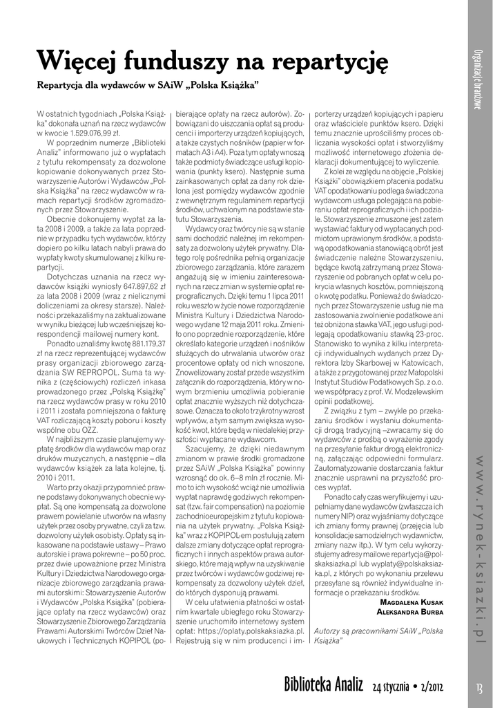 Repartycja dla wydawców w SAiW „Polska Książka” bierające opłaty na rzecz autorów). Zobowiązani do uiszczania opłat są producenci i importerzy urządzeń kopiujących, a także czystych nośników (papier w formatach A3 i A4). Poza tym opłaty wnoszą także podmioty świadczące usługi kopiowania (punkty ksero). Następnie suma zainkasowanych opłat za dany rok dzielona jest pomiędzy wydawców zgodnie z wewnętrznym regulaminem repartycji środków, uchwalonym na podstawie statutu Stowarzyszenia. Wydawcy oraz twórcy nie są w stanie sami dochodzić należnej im rekompensaty za dozwolony użytek prywatny. Dlatego rolę pośrednika pełnią organizacje zbiorowego zarządzania, które zarazem angażują się w imieniu zainteresowanych na rzecz zmian w systemie opłat reprograficznych. Dzięki temu 1 lipca 2011 roku weszło w życie nowe rozporządzenie Ministra Kultury i Dziedzictwa Narodowego wydane 12 maja 2011 roku. Zmieniło ono poprzednie rozporządzenie, które określało kategorie urządzeń i nośników służących do utrwalania utworów oraz procentowe opłaty od nich wnoszone. Znowelizowany został przede wszystkim załącznik do rozporządzenia, który w nowym brzmieniu umożliwia pobieranie opłat znacznie wyższych niż dotychczasowe. Oznacza to około trzykrotny wzrost wpływów, a tym samym zwiększa wysokość kwot, które będą w niedalekiej przyszłości wypłacane wydawcom. Szacujemy, że dzięki niedawnym zmianom w prawie środki gromadzone przez SAiW „Polska Książka” powinny wzrosnąć do ok. 6–8 mln zł rocznie. Mimo to ich wysokość wciąż nie umożliwia wypłat naprawdę godziwych rekompensat (tzw. fair compensation) na poziomie zachodnioeuropejskim z tytułu kopiowania na użytek prywatny. „Polska Książka” wraz z KOPIPOL-em postulują zatem dalsze zmiany dotyczące opłat reprograficznych i innych aspektów prawa autorskiego, które mają wpływ na uzyskiwanie przez twórców i wydawców godziwej rekompensaty za dozwolony użytek dzieł, do których dysponują prawami. W celu ułatwienia płatności w ostatnim kwartale ubiegłego roku Stowarzyszenie uruchomiło internetowy system opłat: https://oplaty.polskaksiazka.pl. Rejestrują się w nim producenci i im- porterzy urządzeń kopiujących i papieru oraz właściciele punktów ksero. Dzięki temu znacznie uprościliśmy proces obliczania wysokości opłat i stworzyliśmy możliwość internetowego złożenia deklaracji dokumentującej to wyliczenie. Z kolei ze względu na objęcie „Polskiej Książki” obowiązkiem płacenia podatku VAT opodatkowaniu podlega świadczona wydawcom usługa polegająca na pobieraniu opłat reprograficznych i ich podziale. Stowarzyszenie zmuszone jest zatem wystawiać faktury od wypłacanych podmiotom uprawionym środków, a podstawą opodatkowania stanowiącą obrót jest świadczenie należne Stowarzyszeniu, będące kwotą zatrzymaną przez Stowarzyszenie od pobranych opłat w celu pokrycia własnych kosztów, pomniejszoną o kwotę podatku. Ponieważ do świadczonych przez Stowarzyszenie usług nie ma zastosowania zwolnienie podatkowe ani też obniżona stawka VAT, jego usługi podlegają opodatkowaniu stawką 23-proc. Stanowisko to wynika z kilku interpretacji indywidualnych wydanych przez Dyrektora Izby Skarbowej w Katowicach, a także z przygotowanej przez Małopolski Instytut Studiów Podatkowych Sp. z o.o. we współpracy z prof. W. Modzelewskim opinii podatkowej. Z związku z tym – zwykle po przekazaniu środków i wysłaniu dokumentacji drogą tradycyjną –zwracamy się do wydawców z prośbą o wyrażenie zgody na przesyłanie faktur drogą elektroniczną, załączając odpowiedni formularz. Zautomatyzowanie dostarczania faktur znacznie usprawni na przyszłość proces wypłat. Ponadto cały czas weryfikujemy i uzupełniamy dane wydawców (zwłaszcza ich numery NIP) oraz wyjaśniamy dotyczące ich zmiany formy prawnej (przejęcia lub konsolidacje samodzielnych wydawnictw, zmiany nazw itp.). W tym celu wykorzystujemy adresy mailowe [email protected] lub [email protected], z których po wykonaniu przelewu przesyłane są również indywidualne informacje o przekazaniu środków. Magdalena Kusak Aleksandra Burba Autorzy są pracownikami SAiW „Polska Książka” Biblioteka Analiz 24 stycznia • 2/2012 w w w. r y n e k- k s i a z k i.p l W ostatnich tygodniach „Polska Książka” dokonała uznań na rzecz wydawców w kwocie 1.529.076,99 zł. W poprzednim numerze „Biblioteki Analiz” informowano już o wypłatach z tytułu rekompensaty za dozwolone kopiowanie dokonywanych przez Stowarzyszenie Autorów i Wydawców „Polska Książka” na rzecz wydawców w ramach repartycji środków zgromadzonych przez Stowarzyszenie. Obecnie dokonujemy wypłat za lata 2008 i 2009, a także za lata poprzednie w przypadku tych wydawców, którzy dopiero po kilku latach nabyli prawa do wypłaty kwoty skumulowanej z kilku repartycji. Dotychczas uznania na rzecz wydawców książki wyniosły 647.897,62 zł za lata 2008 i 2009 (wraz z nielicznymi doliczeniami za okresy starsze). Należności przekazaliśmy na zaktualizowane w wyniku bieżącej lub wcześniejszej korespondencji mailowej numery kont. Ponadto uznaliśmy kwotę 881.179,37 zł na rzecz reprezentującej wydawców prasy organizacji zbiorowego zarządzania SW REPROPOL. Suma ta wynika z (częściowych) rozliczeń inkasa prowadzonego przez „Polską Książkę” na rzecz wydawców prasy w roku 2010 i 2011 i została pomniejszona o fakturę VAT rozliczającą koszty poboru i koszty wspólne obu OZZ. W najbliższym czasie planujemy wypłatę środków dla wydawców map oraz druków muzycznych, a następnie – dla wydawców książek za lata kolejne, tj. 2010 i 2011. Warto przy okazji przypomnieć prawne podstawy dokonywanych obecnie wypłat. Są one kompensatą za dozwolone prawem powielanie utworów na własny użytek przez osoby prywatne, czyli za tzw. dozwolony użytek osobisty. Opłaty 