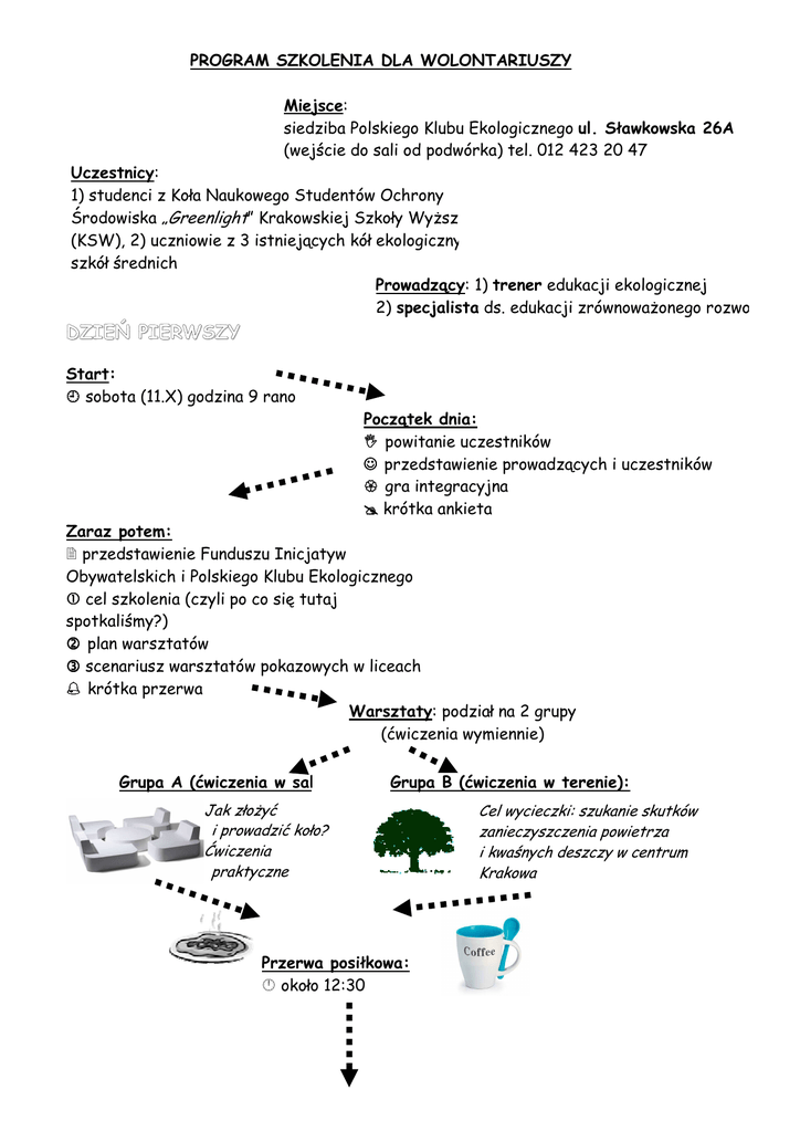 PROGRAM SZKOLENIA DLA WOLONTARIUSZY Miejsce: siedziba Polskiego Klubu Ekologicznego ul. Sławkowska 26A (wejście do sali od podwórka) tel. 012 423 20 47 Uczestnicy: 1) studenci z Koła Naukowego Studentów Ochrony Środowiska „Greenlight” Krakowskiej Szkoły WyŜszej (KSW), 2) uczniowie z 3 istniejących kół ekologicznych ze szkół średnich Prowadzący: 1) trener edukacji ekologicznej 2) specjalista ds. edukacji zrównowaŜonego rozwoju DZIEŃ PIERWSZY Start: sobota (11.X) godzina 9 rano Początek dnia: powitanie uczestników ☺ przedstawienie prowadzących i uczestników gra integracyjna krótka ankieta Zaraz potem: przedstawienie Funduszu Inicjatyw Obywatelskich i Polskiego Klubu Ekologicznego cel szkolenia (czyli po co się tutaj spotkaliśmy?) plan warsztatów scenariusz warsztatów pokazowych w liceach ֠ krótka przerwa Warsztaty: podział na 2 grupy (ćwiczenia wymiennie) Grupa A (ćwiczenia w sali) Grupa B (ćwiczenia w terenie): Jak złoŜyć i prowadzić koło? Ćwiczenia praktyczne Przerwa posiłkowa: około 12:30 Cel wycieczki: szukanie skutków zanieczyszczenia powietrza i kwaśnych deszczy w centrum Krakowa Warsztaty ciąg dalszy: zamiana grupa A idzie w teren, grupa B zajęcia w sali ֠ krótka przerwa Zakończenie dnia: podsumowanie dnia warsztatowego zapowiedź programu na niedzielę Koniec pierwszego dnia: około 14 DZIEŃ DRUGI Start: niedziela (12.X) godzina 11 rano Początek dnia: powitanie uczestników ☺ przypomnienie treści pierwszego dnia szkolenia plan warsztatów Warsztaty: praca w zespołach warsztatowych (ćwiczenia prezentacji) jak załoŜyć koło ciekawe tematy ćwiczenie praktyczne ֠ krótka przerwa Ustalenia organizacyjne: przypomnienie harmonogramu warsztatów w liceach i przyporządkowania grup warsztatowych ustalenie sposobu komunikacji z biurem projektu ankieta ☺ Rozdanie certyfikatów ukończenia szkolenia Koniec: około 15 Szkolenia są częścią projektu „MłodzieŜowi animatorzy zrównowaŜonego rozwoju” realizowanego ze środków otrzymanych od Ministerstwa Pracy i Polityki Społecznej w ramach Rządowego Programu – Fundusz Inicjatyw Obywatelskich przez Polski Klubu Ekologiczny.