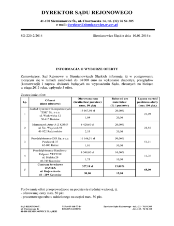 DYREKTOR SĄDU REJONOWEGO 41-100 Siemianowice Śl., ul. Chorzowska 14, tel. (32) 76 54 305 e-mail: [email protected] SG-220-2/2014 Siemianowice Śląskie dnia 10.01.2014 r. INFORMACJA O WYBORZE OFERTY Zamawiający, Sąd Rejonowy w Siemianowicach Śląskich informuje, iŜ w postępowaniu toczącym się w ramach zamówień do 14 000 euro na wykonanie ekspertyz, przeglądów (konserwacji) i napraw drukarek będących na wyposaŜeniu Sądu, zlecanych na bieŜąco w ciągu 2013 roku, wpłynęło 5 ofert. Zestawienie ofert: Oferowana cena (brutto/ilość punktów) (max. 50 pkt) Rabat od cen materiałów (% / punktów) 15 067,50 zł 20,00% 1,09 20,00 Maruszczyk Artur A-Z KOMP ul. Św. Wojciech 93 41-922 Radzionków 6 420,60 zł 20,00% 2,55 20,00 Przedsiębiorstwo DIR Sp. z o.o. Pawłówek 37 62-800 Kalisz 16 166,51 zł 50,00% Lp. Oferent (dane adresowe) 1 Zakład Systemów Komputerowych "ZSK" Sp. z o.o. ul. Wadowicka 12 30-415 Kraków 2 3 4 5 Przedsiębiorstwo HandlowoUsłgowe VECTOR ul. Bielska 29 40-749 Katowice Centrum Serwisowe DAMEX ul. Kujawska 6a 40 - 219 Katowice Łączna wartość punktowa oferty (max 100 pkt.) 21,09 22,55 51,01 1,01 50,00 9 348,00 zł 10,00% 11,75 1,75 10,00 327,18 zł 15,00% 65,00 50,00 15,00 Porównanie ofert przeprowadzono na podstawie średniej waŜonej, tj. - oferowanej ceny max. 50 pkt. - procentowego rabatu udzielonego na części max. 50 pkt. SĄD REJONOWY. ul. Chorzowska 14 41-100 SIEMIANOWICE ŚLĄSKIE NIP: 643-168-77-14 REGON 24232078 Dyrektor Sądu Rejonowego - tel..: 32 - 76 54 303 - fax.: 32 - 76 54 318 DYREKTOR SĄDU REJONOWEGO 41-100 Siemianowice Śl., ul. Chorzowska 14, tel. (32) 76 54 305 e-mail: [email protected] Najkorzystniejszą ofertę złoŜyła firma: Centrum Serwisowe DAMEX, ul. Kujawska 6a, 40 - 219 Katowice W/w firma na podstawie średniej waŜonej zdobyła 65,00 punktów. Dziękujemy za zainteresowanie oraz złoŜone oferty. Wszelkich informacji udziela Sekcja Gospodarcza, tel. 32 7654318. Oryginał podpisał Dyrektor Sądu Grzegorz Makowski Załączniki: 1. Brak Otrzymują: 1. www.siemianowice.sr.gov.pl 2. a/a SĄD REJONOWY. ul. Chorzowska 14 41-100 SIEMIANOWICE ŚLĄSKIE NIP: 643-168-77-14 REGON 24232078 Dyrektor Sądu Rejonowego - tel..: 32 - 76 54 303 - fax.: 32 - 76 54 318