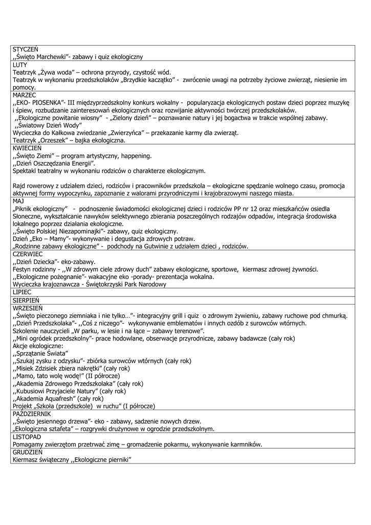 STYCZEŃ ,,Święto Marchewki”- zabawy i quiz ekologiczny LUTY Teatrzyk „Żywa woda” – ochrona przyrody, czystość wód. Teatrzyk w wykonaniu przedszkolaków „Brzydkie kaczątko” - zwrócenie uwagi na potrzeby życiowe zwierząt, niesienie im pomocy. MARZEC ,,EKO- PIOSENKA”- III międzyprzedszkolny konkurs wokalny - popularyzacja ekologicznych postaw dzieci poprzez muzykę i śpiew, rozbudzanie zainteresowań ekologicznych oraz rozwijanie aktywności twórczej przedszkolaków. ,,Ekologiczne powitanie wiosny” - „Zielony dzień” – poznawanie natury i jej bogactwa w trakcie wspólnej zabawy. ,,Światowy Dzień Wody” Wycieczka do Kałkowa zwiedzanie „Zwierzyńca” – przekazanie karmy dla zwierząt. Teatrzyk „Orzeszek” – bajka ekologiczna. KWIECIEŃ ,,Święto Ziemi” – program artystyczny, happening. ,,Dzień Oszczędzania Energii”. Spektakl teatralny w wykonaniu rodziców o charakterze ekologicznym. Rajd rowerowy z udziałem dzieci, rodziców i pracowników przedszkola – ekologiczne spędzanie wolnego czasu, promocja aktywnej formy wypoczynku, zapoznanie z walorami przyrodniczymi i krajobrazowymi naszego miasta. MAJ „Piknik ekologiczny” - podnoszenie świadomości ekologicznej dzieci i rodziców PP nr 12 oraz mieszkańców osiedla Słoneczne, wykształcanie nawyków selektywnego zbierania poszczególnych rodzajów odpadów, integracja środowiska lokalnego poprzez działania ekologiczne. ,,Święto Polskiej Niezapominajki”- zabawy, quiz ekologiczny. Dzień „Eko – Mamy”- wykonywanie i degustacja zdrowych potraw. „Rodzinne zabawy ekologiczne” - podchody na Gutwinie z udziałem dzieci , rodziców. CZERWIEC ,,Dzień Dziecka”- eko-zabawy. Festyn rodzinny - ,,W zdrowym ciele zdrowy duch” zabawy ekologiczne, sportowe, kiermasz zdrowej żywności. ,,Ekologiczne pożegnanie”- wakacyjne eko -porady- prezentacja wokalna. Wycieczka krajoznawcza - Świętokrzyski Park Narodowy LIPIEC SIERPIEŃ WRZESIEŃ ,,Święto pieczonego ziemniaka i nie tylko…”- integracyjny grill i quiz o zdrowym żywieniu, zabawy ruchowe pod chmurką. ,,Dzień Przedszkolaka”- ,,Coś z niczego”- wykonywanie emblematów i innych ozdób z surowców wtórnych. Szkolenie nauczycieli „W parku, w lesie i na łące – zabawy terenowe”. ,,Mini ogródek przedszkolny”- prace hodowlane, obserwacje przyrodnicze, zabawy badawcze (cały rok) Akcje ekologiczne: ,,Sprzątanie Świata” ,,Szukaj zysku z odzysku”- zbiórka surowców wtórnych (cały rok) ,,Misiek Zdzisiek zbiera nakrętki” (cały rok) ,,Mamo, tato wolę wodę!” (II półrocze) ,,Akademia Zdrowego Przedszkolaka” (cały rok) ,,Kubusiowi Przyjaciele Natury” (cały rok) ,,Akademia Aquafresh” (cały rok) Projekt „Szkoła (przedszkole) w ruchu” (I półrocze) PAŹDZIERNIK ,,Święto jesiennego drzewa”- eko - zabawy, sadzenie nowych drzew. „Ekologiczna sztafeta” – rozgrywki drużynowe w ogrodzie przedszkolnym. LISTOPAD Pomagamy zwierzętom przetrwać zimę – gromadzenie pokarmu, wykonywanie karmników. GRUDZIEŃ Kiermasz świąteczny ,,Ekologiczne pierniki”