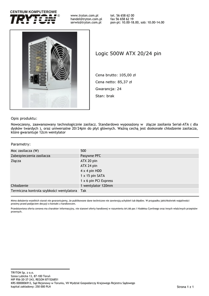 www.tryton.com.pl [email protected] [email protected] tel. 56 658 62 00 fax 56 658 62 19 pon-pt: 10.00-18.00, sob: 10.00-14.00 Logic 500W ATX 20/24 pin Cena brutto: 105,00 zł Cena netto: 85,37 zł Gwarancja: 24 Stan: brak Opis produktu: Nowoczesny, zaawansowany technologicznie zasilacz. Standardowo wyposażony w złącze zasilania Serial-ATA ( dla dysków twardych ), oraz uniwersalne 20/24pin do płyt głównych. Ważną cechą jest doskonałe chłodzenie zasilacza, które gwarantuje 12cm wentylator Parametry: Moc zasilacza (W) Zabezpieczenia zasilacza Złącza 500 Pasywne PFC ATX 20 pin ATX 24 pin 4 x 4 pin HDD 1 x 15 pin SATA 1 x 6 pin PCI Express Chłodzenie 1 wentylator 120mm Termiczna kontrola szybkości wentylatora Tak Mimo dołożenia wszelkich starań nie gwarantujemy, że publikowane dane techniczne nie zawierają uchybień lub błędów. W przypadku jakichkolwiek wątpliwości prosimy przed podjęciem decyzji o kontakt z handlowcem. Przedstawiona oferta cenowa ma charakter informacyjny, nie stanowi oferty handlowej w rozumieniu Art.66 par.1 Kodeksu Cywilnego oraz innych właściwych przepisów prawnych. TRYTON Sp. z o.o. Szosa Lubicka 13, 87-100 Toruń NIP 956-20-37-243, REGON 871526851 KRS 0000006913, Sąd Rejonowy w Toruniu, VII Wydział Gospodarczy Krajowego Rejestru Sądowego kapitał zakładowy: 250 000 PLN Strona 1 z 1