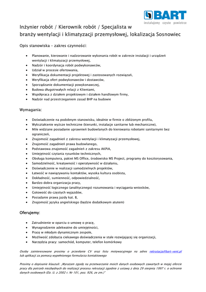 Inżynier robót / Kierownik robót / Specjalista w branży wentylacji i klimatyzacji przemysłowej, lokalizacja Sosnowiec Opis stanowiska – zakres czynności: • Planowanie, kierowanie i nadzorowanie wykonania robót w zakresie instalacji i urządzeń wentylacji i klimatyzacji przemysłowej, • • • • • • • • Nadzór i koordynacja robót podwykonawców, Udział w procesie ofertowania, Weryfikacja dokumentacji projektowej i zastosowanych rozwiązań, Weryfikacja ofert podwykonawców i dostawców, Sporządzanie dokumentacji powykonawczej, Budowa długotrwałych relacji z Klientami, Współpraca z działem projektowym i działem handlowym firmy, Nadzór nad przestrzeganiem zasad BHP na budowie Wymagania: • • • Doświadczenie na podobnym stanowisku, idealnie w firmie o zbliżonym profilu, Wykształcenie wyższe techniczne (kierunki, instalacje sanitarne lub mechaniczne), Mile widziane posiadanie uprawnień budowlanych do kierowania robotami sanitarnymi bez ograniczeń, • • • • • • • • • • • • • • Znajomość zagadnień z zakresu wentylacji i klimatyzacji przemysłowej, Znajomość zagadnień prawa budowlanego, Podstawowa znajomość zagadnień z zakresu AKPiA, Umiejętność czytania rysunków technicznych, Obsługa komputera, pakiet MS Office, środowisko MS Project, programy do kosztorysowania, Samodzielność, kreatywność i operatywność w działaniu, Doświadczenie w realizacji samodzielnych projektów, Łatwość w nawiązywaniu kontaktów, wysoka kultura osobista, Dokładność, sumienność, odpowiedzialność, Bardzo dobra organizacja pracy, Umiejętność logicznego (analitycznego) rozumowania i wyciągania wniosków, Gotowość do częstych wyjazdów, Posiadanie prawa jazdy kat. B, Znajomość języka angielskiego (będzie dodatkowym atutem) Oferujemy: • • • • • Zatrudnienie w oparciu o umowę o pracę, Wynagrodzenie adekwatne do umiejętności, Pracę w młodym dynamicznym zespole, Możliwość zdobycia ciekawego doświadczenia w stale rozwijającej się organizacji, Narzędzia pracy: samochód, komputer, telefon komórkowy Osoby zainteresowane prosimy o przesłanie CV oraz listu motywacyjnego na adres [email protected] lub aplikacji za pomocą wypełnionego formularza kontaktowego Prosimy o dopisanie klauzuli: „Wyrażam zgodę na przetwarzanie moich danych osobowych zawartych w mojej ofercie pracy dla potrzeb niezbędnych do realizacji procesu rekrutacji zgodnie z ustawą z dnia 29 sierpnia 1997 r. o ochronie danych osobowych (Dz. U. z 2002 r. Nr 101, poz. 926, ze zm.)”