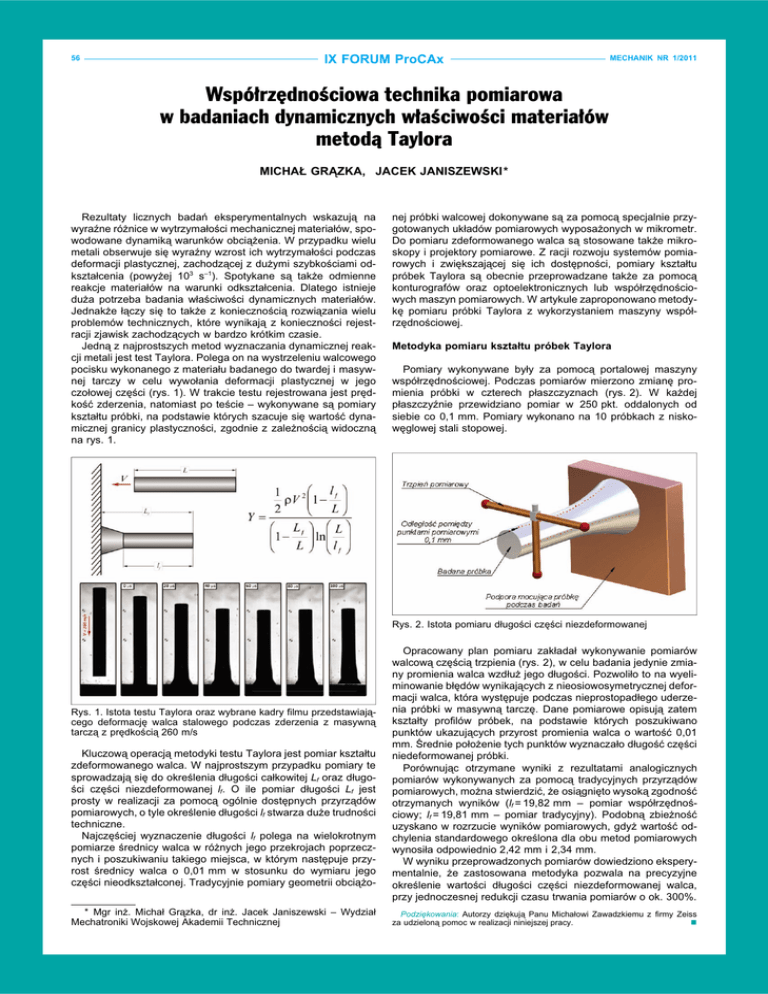 56 IX FORUM ProCAx MECHANIK NR 1/2011 Współrzędnościowa technika pomiarowa w badaniach dynamicznych właściwości materiałów metodą Taylora MICHAŁ GRĄZKA, JACEK JANISZEWSKI* Rezultaty licznych badań eksperymentalnych wskazują na wyraźne różnice w wytrzymałości mechanicznej materiałów, spowodowane dynamiką warunków obciążenia. W przypadku wielu metali obserwuje się wyraźny wzrost ich wytrzymałości podczas deformacji plastycznej, zachodzącej z dużymi szybkościami odkształcenia (powyżej 103 s–1). Spotykane są także odmienne reakcje materiałów na warunki odkształcenia. Dlatego istnieje duża potrzeba badania właściwości dynamicznych materiałów. Jednakże łączy się to także z koniecznością rozwiązania wielu problemów technicznych, które wynikają z konieczności rejestracji zjawisk zachodzących w bardzo krótkim czasie. Jedną z najprostszych metod wyznaczania dynamicznej reakcji metali jest test Taylora. Polega on na wystrzeleniu walcowego pocisku wykonanego z materiału badanego do twardej i masywnej tarczy w celu wywołania deformacji plastycznej w jego czołowej części (rys. 1). W trakcie testu rejestrowana jest prędkość zderzenia, natomiast po teście – wykonywane są pomiary kształtu próbki, na podstawie których szacuje się wartość dynamicznej granicy plastyczności, zgodnie z zależnością widoczną na rys. 1. nej próbki walcowej dokonywane są za pomocą specjalnie przygotowanych układów pomiarowych wyposażonych w mikrometr. Do pomiaru zdeformowanego walca są stosowane także mikroskopy i projektory pomiarowe. Z racji rozwoju systemów pomiarowych i zwiększającej się ich dostępności, pomiary kształtu próbek Taylora są obecnie przeprowadzane także za pomocą konturografów oraz optoelektronicznych lub współrzędnościowych maszyn pomiarowych. W artykule zaproponowano metodykę pomiaru próbki Taylora z wykorzystaniem maszyny współrzędnościowej. Metodyka pomiaru kształtu próbek Taylora Pomiary wykonywane były za pomocą portalowej maszyny współrzędnościowej. Podczas pomiarów mierzono zmianę promienia próbki w czterech płaszczyznach (rys. 2). W każdej płaszczyźnie przewidziano pomiar w 250 pkt. oddalonych od siebie co 0,1 mm. Pomiary wykonano na 10 próbkach z niskowęglowej stali stopowej. Rys. 2. Istota pomiaru długości części niezdeformowanej Rys. 1. Istota testu Taylora oraz wybrane kadry filmu przedstawiającego deformację walca stalowego podczas zderzenia z masywną tarczą z prędkością 260 m/s Kluczową operacją metodyki testu Taylora jest pomiar kształtu zdeformowanego walca. W najprostszym przypadku pomiary te sprowadzają się do określenia długości całkowitej Lf oraz długości części niezdeformowanej lf. O ile pomiar długości Lf jest prosty w realizacji za pomocą ogólnie dostępnych przyrządów pomiarowych, o tyle określenie długości lf stwarza duże trudności techniczne. Najczęściej wyznaczenie długości lf polega na wielokrotnym pomiarze średnicy walca w różnych jego przekrojach poprzecznych i poszukiwaniu takiego miejsca, w którym następuje przyrost średnicy walca o 0,01 mm w stosunku do wymiaru jego części nieodkształconej. Tradycyjnie pomiary geometrii obciążo* Mgr inż. Michał Grązka, dr inż. Jacek Janiszewski – Wydział Mechatroniki Wojskowej Akademii Technicznej Opracowany plan pomiaru zakładał wykonywanie pomiarów walcową częścią trzpienia (rys. 2), w celu badania jedynie zmiany promienia walca wzdłuż jego długości. Pozwoliło to na wyeliminowanie błędów wynikających z nieosiowosymetrycznej deformacji walca, która występuje podczas nieprostopadłego uderzenia próbki w masywną tarczę. Dane pomiarowe opisują zatem kształty profilów próbek, na podstawie których poszukiwano punktów ukazujących przyrost promienia walca o wartość 0,01 mm. Średnie położenie tych punktów wyznaczało długość części niedeformowanej próbki. Porównując otrzymane wyniki z rezultatami analogicznych pomiarów wykonywanych za pomocą tradycyjnych przyrządów pomiarowych, można stwierdzić, że osiągnięto wysoką zgodność otrzymanych wyników (lf = 19,82 mm – pomiar współrzędnościowy; lf = 19,81 mm – pomiar tradycyjny). Podobną zbieżność uzyskano w rozrzucie wyników pomiarowych, gdyż wartość odchylenia standardowego określona dla obu metod pomiarowych wynosiła odpowiednio 2,42 mm i 2,34 mm. W wyniku przeprowadzonych pomiarów dowiedziono eksperymentalnie, że zastosowana metodyka pozwala na precyzyjne określenie wartości długości części niezdeformowanej walca, przy jednoczesnej redukcji czasu trwania pomiarów o ok. 300%. Podziękowania: Autorzy dziękują Panu Michałowi Zawadzkiemu z firmy Zeiss za udzieloną pomoc w realizacji niniejszej pracy.