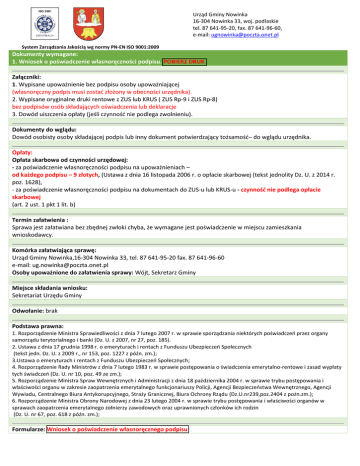 Urząd Gminy Nowinka 16-304 Nowinka 33, woj. podlaskie tel. 87 641-95-20, fax. 87 641-96-60, e-mail: [email protected] System Zarządzania Jakością wg normy PN-EN ISO 9001:2009 Dokumenty wymagane: 1. Wniosek o poświadczenie własnoręczności podpisu. POBIERZ DRUK Załączniki: 1. Wypisane upoważnienie bez podpisu osoby upoważniającej (własnoręczny podpis musi zostać złożony w obecności urzędnika). 2. Wypisane oryginalne druki rentowe z ZUS lub KRUS ( ZUS Rp-9 i ZUS Rp-8) bez podpisów osób składających oświadczenia lub deklaracje 3. Dowód uiszczenia opłaty (jeśli czynność nie podlega zwolnieniu). Dokumenty do wglądu: Dowód osobisty osoby składającej podpis lub inny dokument potwierdzający tożsamość– do wglądu urzędnika. Opłaty: Opłata skarbowa od czynności urzędowej: - za poświadczenie własnoręczności podpisu na upoważnieniach – od każdego podpisu – 9 złotych, (Ustawa z dnia 16 listopada 2006 r. o opłacie skarbowej (tekst jednolity Dz. U. z 2014 r. poz. 1628), - za poświadczenie własnoręczności podpisu na dokumentach do ZUS-u lub KRUS-u - czynność nie podlega opłacie skarbowej (art. 2 ust. 1 pkt 1 lit. b) Termin załatwienia : Sprawa jest załatwiana bez zbędnej zwłoki chyba, że wymagane jest poświadczenie w miejscu zamieszkania wnioskodawcy. Komórka załatwiająca sprawę: Urząd Gminy Nowinka,16-304 Nowinka 33, tel. 87 641-95-20 fax. 87 641-96-60 e-mail: [email protected] Osoby upoważnione do załatwienia sprawy: Wójt, Sekretarz Gminy Miejsce składania wniosku: Sekretariat Urzędu Gminy Odwołanie: brak Podstawa prawna: 1. Rozporządzenie Ministra Sprawiedliwości z dnia 7 lutego 2007 r. w sprawie sporządzania niektórych poświadczeń przez organy samorządu terytorialnego i banki (Dz. U. z 2007, nr 27, poz. 185). 2. Ustawa z dnia 17 grudnia 1998 r. o emeryturach i rentach z Funduszu Ubezpieczeń Społecznych (tekst jedn. Dz. U. z 2009 r., nr 153, poz. 1227 z późn. zm.); 3.Ustawa o emeryturach i rentach z Funduszu Ubezpieczeń Społecznych; 4. Rozporządzenie Rady Ministrów z dnia 7 lutego 1983 r. w sprawie postępowania o świadczenia emerytalno-rentowe i zasad wypłaty tych świadczeń (Dz. U. nr 10, poz. 49 ze zm.); 5. Rozporządzenie Ministra Spraw Wewnętrznych i Administracji z dnia 18 października 2004 r. w sprawie trybu postępowania i właściwości organu w zakresie zaopatrzenia emerytalnego funkcjonariuszy Policji, Agencji Bezpieczeństwa Wewnętrznego, Agencji Wywiadu, Centralnego Biura Antykorupcyjnego, Straży Granicznej, Biura Ochrony Rządu (Dz.U.nr239,poz.2404 z pożn.zm.); 6. Rozporządzenie Ministra Obrony Narodowej z dnia 23 lutego 2004 r. w sprawie trybu postępowania i właściwości organów w sprawach zaopatrzenia emerytalnego żołnierzy zawodowych oraz uprawnionych członków ich rodzin (Dz. U. nr 67, poz. 618 z późn. zm.); Formularze: Wniosek o poświadczenie własnoręcznego podpisu