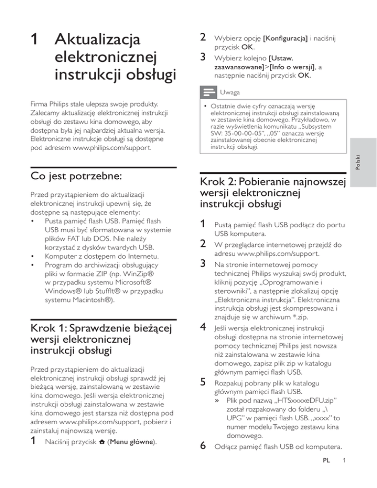 1 Aktualizacja elektronicznej instrukcji obsługi 2 3 Wybierz opcję [Konfiguracja] i naciśnij przycisk OK . Wybierz kolejno [Ustaw. zaawansowane]>[Info o wersji], a następnie naciśnij przycisk OK . Uwaga Co jest potrzebne: Przed przystąpieniem do aktualizacji elektronicznej instrukcji upewnij się, że dostępne są następujące elementy: • Pusta pamięć flash USB. Pamięć flash USB musi być sformatowana w systemie plików FAT lub DOS. Nie należy korzystać z dysków twardych USB. • Komputer z dostępem do Internetu. • Program do archiwizacji obsługujący pliki w formacie ZIP (np. WinZip® w przypadku systemu Microsoft® Windows® lub Stuffl t® w przypadku systemu Macintosh®). Krok 1: Sprawdzenie bieżącej wersji elektronicznej instrukcji obsługi Przed przystąpieniem do aktualizacji elektronicznej instrukcji obsługi sprawdź jej bieżącą wersję, zainstalowaną w zestawie kina domowego. Jeśli wersja elektronicznej instrukcji obsługi zainstalowana w zestawie kina domowego jest starsza niż dostępna pod adresem www.philips.com/support , pobierz i zainstaluj najnowszą wersję. 1 Naciśnij przycisk (Menu główne). • Ostatnie dwie cyfry oznaczają wersję elektronicznej instrukcji obsługi zainstalowaną w zestawie kina domowego. Przykładowo, w razie wyświetlenia komunikatu „Subsystem SW: 35-00-00-05”, „05” oznacza wersję zainstalowanej obecnie elektronicznej instrukcji obsługi. Pols ki Firma Philips stale ulepsza swoje produkty. Zalecamy aktualizację elektronicznej instrukcji obsługi do zestawu kina domowego, aby dostępna była jej najbardziej aktualna wersja. Elektroniczne instrukcje obsługi są dostępne pod adresem www.philips.com/support. Krok 2: Pobieranie najnowszej wersji elektronicznej instrukcji obsługi 1 2 3 4 5 6 Pustą pamięć flash USB podłącz do portu USB komputera. W przeglądarce internetowej przejdź do adresu www.philips.com/support . Na stronie internetowej pomocy technicznej Philips wyszukaj swój produkt, kliknij pozycję „Oprogramowanie i sterowniki”, a następnie zlokalizuj opcję „Elektroniczna instrukcja”. Elektroniczna instrukcja obsługi jest skompresowana i znajduje się w archiwum *.zip. Jeśli wersja elektronicznej instrukcji obsługi dostępna na stronie internetowej pomocy technicznej Philips jest nowsza niż zainstalowana w zestawie kina domowego, zapisz plik zip w katalogu głównym pamięci flash USB. Rozpakuj pobrany plik w katalogu głównym pamięci flash USB. » Plik pod nazwą „HTSxxxxeDFU.zip” został rozpakowany do folderu „\ UPG” w pamięci flash USB. „xxxx” to numer modelu Twojego zestawu kina domowego. Odłącz pamięć flash USB od komputera. PL 1 Krok 3: Aktualizacja elektronicznej instrukcji obsługi Ostrzeżenie • Podczas trwania aktualizacji nie należy wyłączać zestawu kina domowego ani odłączać pamięci flash USB. • Jeśli podczas aktualizacji nastąpi awaria zasilania, nie należy odłączać pamięci flash USB od zestawu kina domowego. Zestaw kina domowego będzie kontynuować aktualizację po przywróceniu zasilania. • Jeśli podczas aktualizacji wystąpił błąd, należy ponownie przeprowadzić procedurę. Jeśli błąd wystąpi ponownie, skontaktuj się z biurem obsługi klienta firmy Philips. 1 2 3 4 Włącz telewizor. Podłącz pamięć flash USB z pobranym plikiem (elektroniczna instrukcja obsługi) do złącza USB w zestawie kina domowego. Naciśnij przycisk (Menu główne). Upewnij się, że: • w kieszeni na płytę nie znajduje się żadna płyta, a • kieszeń na płytę jest zamknięta. Naciśnij [3], [3] i [8] na pilocie. » Postępuj zgodnie ze wskazówkami wyświetlanymi na ekranie telewizora, aby potwierdzić aktualizację. Po zakończeniu zestaw kina domowego automatycznie wyłączy się i włączy ponownie. Jeśli urządzenie nie uruchomi się ponownie, odłącz przewód zasilający na kilka sekund, a następnie podłącz go jeszcze raz. 5 2 Wyjmij urządzenie pamięci masowej USB ze złącza zestawu kina domowego. PL