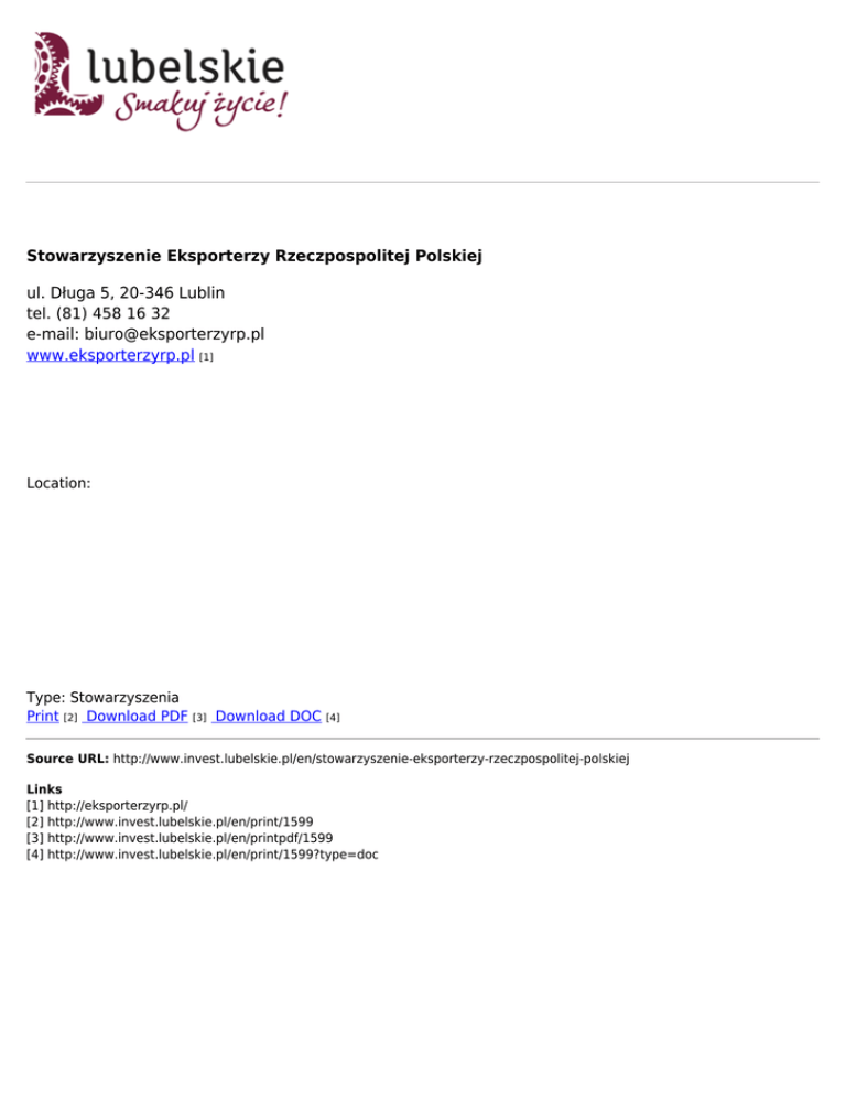Stowarzyszenie Eksporterzy Rzeczpospolitej Polskiej ul. Długa 5, 20-346 Lublin tel. (81) 458 16 32 e-mail: [email protected] www.eksporterzyrp.pl [1] Location: Type: Stowarzyszenia Print [2] Download PDF [3] Download DOC [4] Source URL: http://www.invest.lubelskie.pl/en/stowarzyszenie-eksporterzy-rzeczpospolitej-polskiej Links [1] http://eksporterzyrp.pl/ [2] http://www.invest.lubelskie.pl/en/print/1599 [3] http://www.invest.lubelskie.pl/en/printpdf/1599 [4] http://www.invest.lubelskie.pl/en/print/1599?type=doc