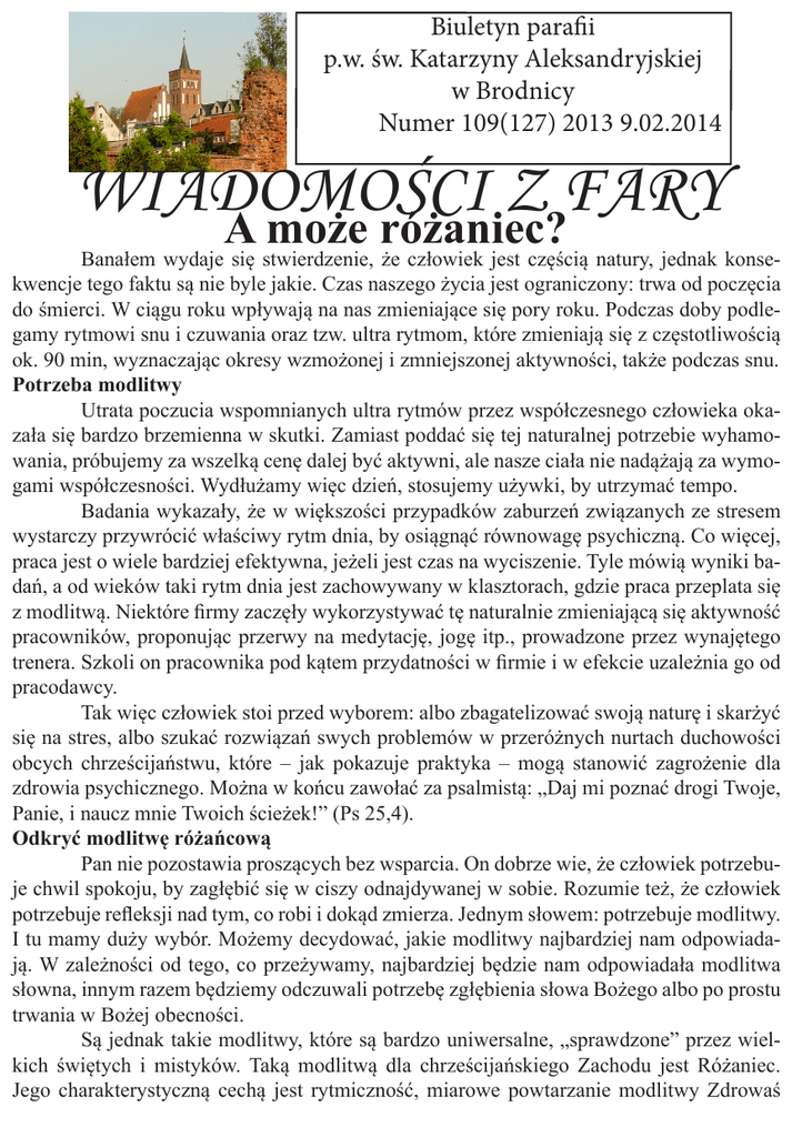 Biuletyn parafii p.w. św. Katarzyny Aleksandryjskiej w Brodnicy Numer 109(127) 2013 9.02.2014 WIADOMOŚCI Z FARY A może różaniec? Banałem wydaje się stwierdzenie, że człowiek jest częścią natury, jednak konsekwencje tego faktu są nie byle jakie. Czas naszego życia jest ograniczony: trwa od poczęcia do śmierci. W ciągu roku wpływają na nas zmieniające się pory roku. Podczas doby podlegamy rytmowi snu i czuwania oraz tzw. ultra rytmom, które zmieniają się z częstotliwością ok. 90 min, wyznaczając okresy wzmożonej i zmniejszonej aktywności, także podczas snu. Potrzeba modlitwy Utrata poczucia wspomnianych ultra rytmów przez współczesnego człowieka okazała się bardzo brzemienna w skutki. Zamiast poddać się tej naturalnej potrzebie wyhamowania, próbujemy za wszelką cenę dalej być aktywni, ale nasze ciała nie nadążają za wymogami współczesności. Wydłużamy więc dzień, stosujemy używki, by utrzymać tempo. Badania wykazały, że w większości przypadków zaburzeń związanych ze stresem wystarczy przywrócić właściwy rytm dnia, by osiągnąć równowagę psychiczną. Co więcej, praca jest o wiele bardziej efektywna, jeżeli jest czas na wyciszenie. Tyle mówią wyniki badań, a od wieków taki rytm dnia jest zachowywany w klasztorach, gdzie praca przeplata się z modlitwą. Niektóre firmy zaczęły wykorzystywać tę naturalnie zmieniającą się aktywność pracowników, proponując przerwy na medytację, jogę itp., prowadzone przez wynajętego trenera. Szkoli on pracownika pod kątem przydatności w firmie i w efekcie uzależnia go od pracodawcy. Tak więc człowiek stoi przed wyborem: albo zbagatelizować swoją naturę i skarżyć się na stres, albo szukać rozwiązań swych problemów w przeróżnych nurtach duchowości obcych chrześcijaństwu, które – jak pokazuje praktyka – mogą stanowić zagrożenie dla zdrowia psychicznego. Można w końcu zawołać za psalmistą: „Daj mi poznać drogi Twoje, Panie, i naucz mnie Twoich ścieżek!” (Ps 25,4). Odkryć modlitwę różańcową Pan nie pozostawia proszących bez wsparcia. On dobrze wie, że człowiek potrzebuje chwil spokoju, by zagłębić się w ciszy odnajdywanej w sobie. Rozumie też, że człowiek potrzebuje refleksji nad tym, co robi i dokąd zmierza. Jednym słowem: potrzebuje modlitwy. I tu mamy duży wybór. Możemy decydować, jakie modlitwy najbardziej nam odpowiadają. W zależności od tego, co przeżywamy, najbardziej będzie nam odpowiadała modlitwa słowna, innym razem będziemy odczuwali potrzebę zgłębienia słowa Bożego albo po prostu trwania w Bożej obecności. Są jednak takie modlitwy, które są bardzo uniwersalne, „sprawdzone” przez wielkich świętych i mistyków. Taką modlitwą dla chrześcijańskiego Zachodu jest Różaniec. Jego charakterystyczną cechą jest rytmiczność, miarowe powtarzanie modlitwy Zdrowaś Maryjo. Już samo systematyczne odmawianie Różańca uczy modlącego się pogłębienia tej modlitwy. Rytmiczność wychodzi naprzeciw ludzkiej fizjologii i ułatwia wyciszenie, a w ciszy można usłyszeć głos Ducha Świętego. Różaniec może być zarówno modlitwą słowną, medytacyjną, jak i wprowadzającą w kontemplację. Ojcze nasz..., Zdrowaś Maryjo..., Chwała Ojcu… Struktura Różańca, który zaczyna i kończy się na ukrzyżowanym Chrystusie, obrazuje drogę człowieka. Przypomina, że Bóg powołał nas ze swej wielkiej miłości i powołuje z powrotem do siebie, a Jezus jest początkiem i końcem. Wielokrotne zwrócenie się do samego Boga Ojca (Ojcze nasz) podkreśla, że w centrum naszego życia jest Bóg i tylko On. Trzy początkowe Zdrowaś Maryjo uświadamiają nam, że do Boga możemy dojść jedynie przez wiarę, która rodzi nadzieję. Gdy zaś uwierzymy, że Bóg cały czas jest obecny i pragnie naszego szczęścia, to nie możemy nie odpowiedzieć modlitwą uwielbienia (Chwała Ojcu) – na wzór maryjnego Magnificat, kiedy to Elżbieta wskazała Maryi łaskę Pana. Powtarzając dziesięciokrotnie Zdrowaś Maryjo, rozważamy główne wydarzenia z życia Jezusa, które stanowią szkielet naszej znajomości słowa Bożego. Można też zastanawiać się nad samym znaczeniem słów modlitwy Zdrowaś Maryjo, która bierze swój początek z dialogu Maryi z Archaniołem Gabrielem, gdzie jedno „tak” Maryi miało ogromne znaczenie dla naszej historii zbawienia. My też możemy dokonać wielkich zmian, mówiąc Stwórcy „tak”. To zaś oznacza, że w innych dostrzegamy Jego ślad, akceptujemy samych siebie, przestajemy tkwić w przeszłości i nie stawiamy Bogu wymagań, oczekując zrealizowania przez Niego naszych planów. W drugiej części modlitwy uznajemy swoją kruchość zarówno ducha, jak i ciała, którą każdy prędzej czy później, mając odwagę stanąć w prawdzie przed samym sobą, dostrzeże. Dlatego prosimy Maryję o pomoc w każdej chwili, a szczególnie w momencie śmierci, gdzie ci, na których liczymy, nie będą mogli dalej nam towarzyszyć. Pozwólmy, by w czasie modlitwy nasze serca napełniały się mądrością – słowem Pana, tak jak robiła to Maryja, zachowując w swoim sercu każde Jego słowo. Z pomocą Maryi Ojciec Pio, Jan Paweł II i inni wielcy ludzie wskazywali na różaniec, który uczy wsłuchiwać się w natchnienia Ducha Świętego. Wzorowali się na Maryi, która była największą mistyczką, bo cały czas żyła w obecności Boga. Modląc się na różańcu, można nasze życie, jak kalkę, przyłożyć do Jej życia i sprawdzić, czy Jej i nasza droga są podobne. Jeżeli mamy pewność, że Maryja skierowałaby nas w tym kierunku, w którym zmierzamy, to jesteśmy na właściwej drodze. Maryi nie da się pominąć na drodze, na której jasny staje się cel ostateczny. Żeby to lepiej zrozumieć, posłużmy się porównaniem dotyczące dziedziny fizyki: by opisać zjawiska zachodzące na Ziemi, używa się określonych wzorów. Jednak tych samym wzor
