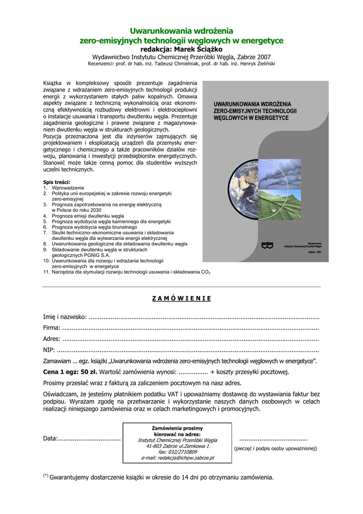 Uwarunkowania wdrożenia zero-emisyjnych technologii węglowych w energetyce redakcja: Marek Ściążko Wydawnictwo Instytutu Chemicznej Przeróbki Węgla, Zabrze 2007 Recenzenci: prof. dr hab. inż. Tadeusz Chmielniak, prof. dr hab. inż. Henryk Zieliński Książka w kompleksowy sposób prezentuje zagadnienia związane z wdrażaniem zero-emisyjnych technologii produkcji energii z wykorzystaniem stałych paliw kopalnych. Omawia aspekty związane z techniczną wykonalnością oraz ekonomiczną efektywnością rozbudowy elektrowni i elektrociepłowni o instalacje usuwania i transportu dwutlenku węgla. Prezentuje zagadnienia geologiczne i prawne związane z magazynowaniem dwutlenku węgla w strukturach geologicznych. Pozycja przeznaczona jest dla inżynierów zajmujących się projektowaniem i eksploatacją urządzeń dla przemysłu energetycznego i chemicznego a także pracowników działów rozwoju, planowania i inwestycji przedsiębiorstw energetycznych. Stanowić może także cenną pomoc dla studentów wyższych uczelni technicznych. Spis treści: 1. Wprowadzenie 2. Polityka unii europejskiej w zakresie rozwoju energetyki zero-emisyjnej 3. Prognoza zapotrzebowania na energię elektryczną w Polsce do roku 2030 4. Prognoza emisji dwutlenku węgla 5. Prognoza wydobycia węgla kamiennego dla energetyki 6. Prognoza wydobycia węgla brunatnego 7. Skutki techniczno–ekonomiczne usuwania i składowania dwutlenku węgla dla wytwarzania energii elektrycznej 8. Uwarunkowania geologiczne dla składowania dwutlenku węgla 9. Składowanie dwutlenku węgla w strukturach geologicznych PGNiG S.A. 10. Uwarunkowania dla rozwoju i wdrażania technologii zero-emisyjnych w energetyce 11. Narzędzia dla stymulacji rozwoju technologii usuwania i składowania CO2 ZAMÓWIENIE Imię i nazwisko: ............................................................................................................................. Firma: ........................................................................................................................................... Adres: ........................................................................................................................................... NIP: .............................................................................................................................................. Zamawiam ... egz. książki „Uwarunkowania wdrożenia zero-emisyjnych technologii węglowych w energetyce”. Cena 1 egz: 50 zł. Wartość zamówienia wynosi: ................ + koszty przesyłki pocztowej. Prosimy przesłać wraz z fakturą za zaliczeniem pocztowym na nasz adres. Oświadczam, że jesteśmy płatnikiem podatku VAT i upoważniamy dostawcę do wystawiania faktur bez podpisu. Wyrażam zgodę na przetwarzanie i wykorzystanie naszych danych osobowych w celach realizacji niniejszego zamówienia oraz w celach marketingowych i promocyjnych. Data:.................................. (*) Zamówienia prosimy kierować na adres: ........... ..................................... Instytut Chemicznej Przeróbki Węgla 41-803 Zabrze ul.Zamkowa 1 (pieczęć i podpis osoby upoważnionej) fax: 032/2710809 e-mail: [email protected] Gwarantujemy dostarczenie książki w okresie do 14 dni po otrzymaniu zamówienia.