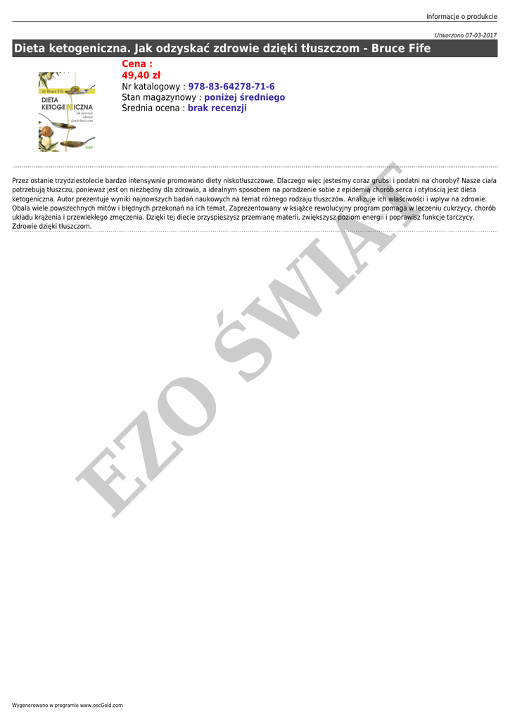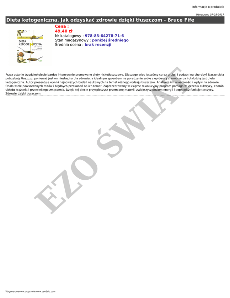 Informacje o produkcie Utworzono 07-03-2017 Dieta ketogeniczna. Jak odzyskać zdrowie dzięki tłuszczom - Bruce Fife Cena : 49,40 zł Nr katalogowy : 978-83-64278-71-6 Stan magazynowy : poniżej średniego Średnia ocena : brak recenzji EZ O ŚW IA T Przez ostanie trzydziestolecie bardzo intensywnie promowano diety niskotłuszczowe. Dlaczego więc jesteśmy coraz grubsi i podatni na choroby? Nasze ciała potrzebują tłuszczu, ponieważ jest on niezbędny dla zdrowia, a idealnym sposobem na poradzenie sobie z epidemią chorób serca i otyłością jest dieta ketogeniczna. Autor prezentuje wyniki najnowszych badań naukowych na temat różnego rodzaju tłuszczów. Analizuje ich właściwości i wpływ na zdrowie. Obala wiele powszechnych mitów i błędnych przekonań na ich temat. Zaprezentowany w książce rewolucyjny program pomaga w leczeniu cukrzycy, chorób układu krążenia i przewlekłego zmęczenia. Dzięki tej diecie przyspieszysz przemianę materii, zwiększysz poziom energii i poprawisz funkcje tarczycy. Zdrowie dzięki tłuszczom. Wygenerowano w programie www.oscGold.com