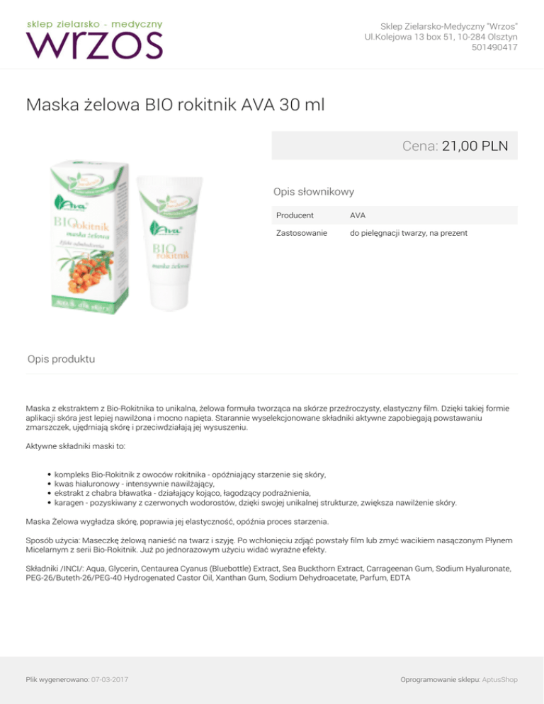 Sklep Zielarsko-Medyczny "Wrzos" Ul.Kolejowa 13 box 51, 10-284 Olsztyn 501490417 Maska żelowa BIO rokitnik AVA 30 ml Cena: 21,00 PLN Opis słownikowy Producent AVA Zastosowanie do pielęgnacji twarzy, na prezent Opis produktu Maska z ekstraktem z Bio-Rokitnika to unikalna, żelowa formuła tworząca na skórze przeźroczysty, elastyczny film. Dzięki takiej formie aplikacji skóra jest lepiej nawilżona i mocno napięta. Starannie wyselekcjonowane składniki aktywne zapobiegają powstawaniu zmarszczek, ujędrniają skórę i przeciwdziałają jej wysuszeniu. Aktywne składniki maski to: kompleks Bio-Rokitnik z owoców rokitnika - opóźniający starzenie się skóry, kwas hialuronowy - intensywnie nawilżający, ekstrakt z chabra bławatka - działający kojąco, łagodzący podrażnienia, karagen - pozyskiwany z czerwonych wodorostów, dzięki swojej unikalnej strukturze, zwiększa nawilżenie skóry. Maska Żelowa wygładza skórę, poprawia jej elastyczność, opóźnia proces starzenia. Sposób użycia: Maseczkę żelową nanieść na twarz i szyję. Po wchłonięciu zdjąć powstały film lub zmyć wacikiem nasączonym Płynem Micelarnym z serii Bio-Rokitnik. Już po jednorazowym użyciu widać wyraźne efekty. Składniki /INCI/: Aqua, Glycerin, Centaurea Cyanus (Bluebottle) Extract, Sea Buckthorn Extract, Carrageenan Gum, Sodium Hyaluronate, PEG-26/Buteth-26/PEG-40 Hydrogenated Castor Oil, Xanthan Gum, Sodium Dehydroacetate, Parfum, EDTA Plik wygenerowano: 07-03-2017 Powered by TCPDF (www.tcpdf.org) Oprogramowanie sklepu: AptusShop