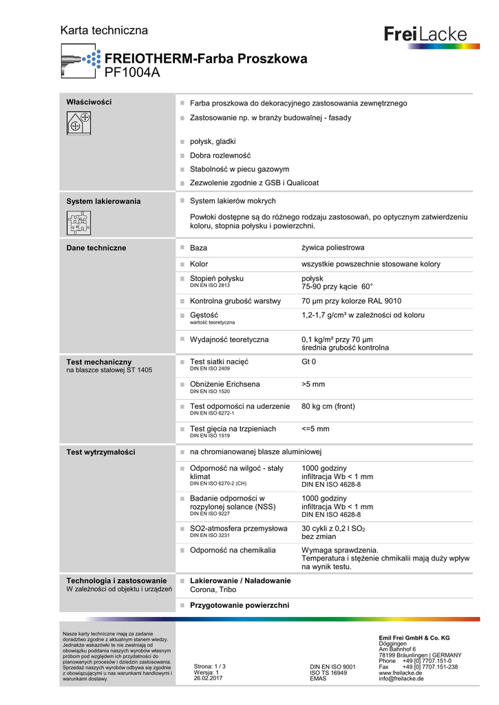 Karta techniczna FREIOTHERM-Farba Proszkowa PF1004A Właściwości Farba proszkowa do dekoracyjnego zastosowania zewnętrznego Zastosowanie np. w branży budowalnej - fasady połysk, gladki Dobra rozlewność Stabolność w piecu gazowym Zezwolenie zgodnie z GSB i Qualicoat System lakierowania System lakierów mokrych Powłoki dostępne są do różnego rodzaju zastosowań, po optycznym zatwierdzeniu koloru, stopnia połysku i powierzchni. Dane techniczne Baza żywica poliestrowa Kolor wszystkie powszechnie stosowane kolory Stopień połysku połysk 75-90 przy kącie 60° DIN EN ISO 2813 Kontrolna grubość warstwy 70 µm przy kolorze RAL 9010 Gęstość 1,2-1,7 g/cm³ w zależności od koloru wartość teoretyczna Wydajność teoretyczna 0,1 kg/m² przy 70 µm średnia grubość kontrolna Test mechaniczny Test siatki nacięć Gt 0 na blaszce stalowej ST 1405 DIN EN ISO 2409 Obniżenie Erichsena >5 mm DIN EN ISO 1520 Test odporności na uderzenie 80 kg cm (front) DIN EN ISO 6272-1 Test gięcia na trzpieniach <=5 mm DIN EN ISO 1519 Test wytrzymałości na chromianowanej blasze aluminiowej Odporność na wilgoć - stały klimat 1000 godziny infiltracja Wb < 1 mm DIN EN ISO 6270-2 (CH) DIN EN ISO 4628-8 Badanie odporności w rozpylonej solance (NSS) 1000 godziny infiltracja Wb < 1 mm DIN EN ISO 9227 DIN EN ISO 4628-8 SO2-atmosfera przemysłowa 30 cykli z 0,2 l SO2 bez zmian DIN EN ISO 3231 Odporność na chemikalia Technologia i zastosowanie W zależności od objektu i urządzeń Wymaga sprawdzenia. Temperatura i stężenie chmikalii mają duży wpływ na wynik testu. Lakierowanie / Naładowanie Corona, Tribo Przygotowanie powierzchni Nasze karty techniczne mają za zadanie doradztwo zgodne z aktualnym stanem wiedzy. Jednakże wskazówki te nie zwalniają od obowiązku poddania naszych wyrobów własnym próbom pod względem ich przydatności do planowanych procesów i dziedzin zastosowania. Sprzedaż naszych wyrobów odbywa się zgodnie z obowiązującymi u nas warunkami handlowymi i warunkami dostawy. Strona: 1 / 3 Wersja: 1 26.02.2017 DIN EN ISO 9001 ISO TS 16949 EMAS Emil Frei GmbH & Co. KG Döggingen Am Bahnhof 6 78199 Bräunlingen | GERMANY Phone +49 [0] 7707.151-0 Fax +49 [0] 7707.151-238 www.freilacke.de [email protected] Karta techniczna FREIOTHERM-Farba Proszkowa PF1004A Powierzchnia musi być wolna od wszystkich przyklejających się, przywierających i haczących materiałów, np.: oleje, tłuszcz, rdza, materiały łatwopalne, pozostałości po wosku lub po materiałach rozdzielających. Przy wysokich wymaganiach polecemy dostosowane fosforanowanie lub chromianowanie. Zaprawka: na zapytanie Wskazówki dotyczące bezpieczeństwa i higieny pracy Przy stosowaniu lakierów należy zastosować standardowe środki ostrożności i ochrony osobistej. Dalsze wskazówki dotyczące niebezpiecznych substancji, danych odnośnie bezpieczeństwa i zaleceń dla ochrony zdrowia i środowiska zostały zamieszczone w karcie charakterystyki. Utwardzanie Temperatura objektu Zalecana temperatura wypalania 10 min./180 °C Okno utwradzania sprawdzono w kolorze RAL 9010 zielona szrafura = warunki wypalania z dobrymi własiwościami wykończeniowymi Magazynowanie W oryginalnym opakowaniu 24 miesięcy przy temperaturze magazynu od 5-25°C. Farby proszkowe należy przechowywać w miejscach suchych i chłodnych. Minimalny czas przydatności określony jest na opakowaniu. Składowanie powyżej podanego czasu nie oznacza, że towar jest niezdatny do użytku. Jednak dla zapewnienia wysokiej jakości, należy przed zastosowaniem sprawdzić właściwości produktu. Wskazówki specjalne Przesiewanie ochronne: 160 µm Zgodność z obcą farbą proszkową - musi zostać sprawdzona Zezwolenie Warunki specjalne Wszystkie dane są oparte na bazie stardowego klimatu 23/50 DIN EN 23270. Wszystkie dane są oparte na naszych doświadczenaich i znajomości produktu. Nasze karty techniczne mają za zadanie doradztwo zgodne z aktualnym stanem wiedzy. Jednakże wskazówki te nie zwalniają od obowiązku poddania naszych wyrobów własnym próbom pod względem ich przydatności do planowanych procesów i dziedzin zastosowania. Sprzedaż naszych wyrobów odbywa się zgodnie z obowiązującymi u nas warunkami handlowymi i warunkami dostawy. Strona: 2 / 3 Wersja: 1 26.02.2017 DIN EN ISO 9001 ISO TS 16949 EMAS Emil Frei GmbH & Co. KG Döggingen Am Bahnhof 6 78199 Bräunlingen | GERMANY Phone +49 [0] 7707.151-0 Fax +49 [0] 7707.151-238 www.freilacke.de [email protected] Karta techniczna FREIOTHERM-Farba Proszkowa PF1004A Na sam proces aplikacji nie mamy wpływu.W przypadku pytań jesteśmy do Państwa dyspozycji. Dane w niniejszej karcie technicznej są jedynie wytycznymii nie stanowią żadnej specyfikacji. Nasze karty techniczne mają za zadanie doradztwo zgodne z aktualnym stanem wiedzy. Jednakże wskazówki te nie zwalniają od obowiązku poddania naszych wyrobów własnym próbom pod względem ich przydatności do planowanych procesów i dziedzin zastosowania. Sprzedaż naszych wyrobów odbywa się zgodnie z obowiązującymi u nas warunkami handlowymi i warunkami dostawy. Strona: 3 / 3 Wersja: 1 26.02.2017 DIN EN ISO 9001 ISO TS 16949 EMAS Emil Frei GmbH & Co. KG Döggingen Am Bahnhof 6 78199 Bräunlingen | GERMANY Phone +49 [0] 7707.151-0 Fax +49 [0] 7707.151-238 www.freilacke.de [email protected]