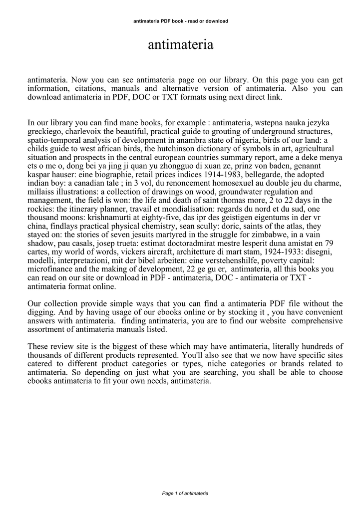 antimateria PDF book - read or download antimateria antimateria. Now you can see antimateria page on our library. On this page you can get information, citations, manuals and alternative version of antimateria. Also you can download antimateria in PDF, DOC or TXT formats using next direct link. In our library you can find mane books, for example : antimateria, wstepna nauka jezyka greckiego, charlevoix the beautiful, practical guide to grouting of underground structures, spatio-temporal analysis of development in anambra state of nigeria, birds of our land: a childs guide to west african birds, the hutchinson dictionary of symbols in art, agricultural situation and prospects in the central european countries summary report, ame a deke menya ets o me o, dong bei ya jing ji quan yu zhongguo di xuan ze, prinz von baden, genannt kaspar hauser: eine biographie, retail prices indices 1914-1983, bellegarde, the adopted indian boy: a canadian tale ; in 3 vol, du renoncement homosexuel au double jeu du charme, millaiss illustrations: a collection of drawings on wood, groundwater regulation and management, the field is won: the life and death of saint thomas more, 2 to 22 days in the rockies: the itinerary planner, travail et mondialisation: regards du nord et du sud, one thousand moons: krishnamurti at eighty-five, das ipr des geistigen eigentums in der vr china, findlays practical physical chemistry, sean scully: doric, saints of the atlas, they stayed on: the stories of seven jesuits martyred in the struggle for zimbabwe, in a vain shadow, pau casals, josep trueta: estimat doctoradmirat mestre lesperit duna amistat en 79 cartes, my world of words, vickers aircraft, architetture di mart stam, 1924-1933: disegni, modelli, interpretazioni, mit der bibel arbeiten: eine verstehenshilfe, poverty capital: microfinance and the making of development, 22 ge gu er, antimateria, all this books you can read on our site or download in PDF - antimateria, DOC - antimateria or TXT antimateria format online. Our collection provide simple ways that you can find a antimateria PDF file without the digging. And by having usage of our ebooks online or by stocking it , you have convenient answers with antimateria. finding antimateria, you are to find our website comprehensive assortment of antimateria manuals listed. These review site is the biggest of these which may have antimateria, literally hundreds of thousands of different products represented. You'll also see that we now have specific sites catered to different product categories or types, niche categories or brands related to antimateria. So depending on just what you are searching, you shall be able to choose ebooks antimateria to fit your own needs, antimateria. Page 1 of antimateria
