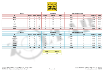 Team 1 TRAFIENIA ZUŻYTA AMUNICJA ID zginał trafił bilans brzuch ramię plecy UZI D-D efekt.(%) wynik Krzyz 16 42 26 29 25 4 3060 0 1.373 42.0 Karol 42 33 -9 12 17 5 2250 27 1.449 33.0 KL 30 30 0 17 16 2 1500 9 1.988 30.0 Fori 29 28 -1 17 10 2 4260 0 0.657 28.0 Roman 26 0 -26 0 0 0 2760 2 0.000 0.0 Suma 143 133 -10 75 68 13 13830 38 0.959 133 Team 2 TRAFIENIA ZUŻYTA AMUNICJA ID zginał trafił bilans brzuch ramię plecy UZI D-D efekt.(%) wynik Gara 33 54 21 43 35 11 2130 0 2.535 54.0 Zwierzyna 32 30 -2 23 3 5 3870 0 0.775 30.0 Turbo 29 27 -2 21 0 6 3120 0 0.865 27.0 Woszu 15 18 3 15 2 2 1920 0 0.938 18.0 Maciek 24 14 -10 9 2 3 2460 0 0.569 14.0 Suma 133 143 10 111 42 27 13500 0 1.059 143 Laserowy Poligon Zoltar - ul.Aleja Pokoju 81, 31-564 Kraków Tel.:792-111-091, e-mail:[email protected] Team 2 Team 1 143 133 Strona 1 z 9 Data: 2015-08-01; Godzina: 22:22; Czas gry: 25minut Prowadzący: Gamemaster ZOLTAR Team 1 TRAFIENIA ZUŻYTA AMUNICJA ID zginał trafił bilans brzuch ramię plecy UZI D-D efekt.(%) wynik Krzyz 13 33 20 25 18 1 2370 0 1.392 33.0 Karol 34 26 -8 17 7 5 2100 0 1.238 26.0 KL 17 21 4 10 10 2 1260 6 1.659 21.0 Fori 8 18 10 12 2 4 2850 0 0.632 18.0 Roman 10 10 0 2 5 3 2610 0 0.383 10.0 Suma 82 108 26 66 42 15 11190 6 0.965 108 Team 2 TRAFIENIA ZUŻYTA AMUNICJA ID zginał trafił bilans brzuch ramię plecy UZI D-D efekt.(%) wynik Gara 27 36 9 31 20 4 2520 1 1.428 36.0 Zwierzyna 37 19 -18 18 0 1 3210 25 0.587 19.0 Turbo 21 13 -8 12 0 1 2430 0 0.535 13.0 Maciek 10 11 1 9 2 0 2610 0 0.421 11.0 Woszu 13 3 -10 3 1 0 1410 11 0.211 3.0 Suma 108 82 -26 73 23 6 12180 37 0.671 82 Laserowy Poligon Zoltar - ul.Aleja Pokoju 81, 31-564 Kraków Tel.:792-111-091, e-mail:[email protected] Team 1 Team 2 108 82 Strona 2 z 9 Data: 2015-08-01; Godzina: 23:00; Czas gry: 20minut Prowadzący: Gamemaster ZOLTAR Team 1 TRAFIENIA ZUŻYTA AMUNICJA ID zginał trafił bilans brzuch ramię plecy UZI D-D efekt.(%) wynik Gara 15 51 36 32 29 13 3330 0 1.532 51.0 Maciek 9 25 16 20 9 0 3660 0 0.683 25.0 Zwierzyna 11 22 11 16 4 2 3120 0 0.705 22.0 Turbo 12 13 1 8 4 1 2610 3 0.498 13.0 Woszu 15 11 -3 9 2 0 1500 0 0.733 11.0 Suma 62 122 61 85 48 16 14220 3 0.858 122 Team 2 TRAFIENIA ZUŻYTA AMUNICJA ID zginał trafił bilans brzuch ramię plecy UZI D-D efekt.(%) wynik Krzyz 22 21 0 10 10 3 3660 0 0.574 21.0 KL 26 19 -7 12 11 2 1380 9 1.368 19.0 Karol 30 11 -19 7 2 2 2070 0 0.531 11.0 Roman 28 5 -23 4 0 1 2370 1 0.211 5.0 Fori 18 5 -12 4 1 0 2040 0 0.245 5.0 Suma 124 61 -61 37 24 8 11520 10 0.529 61 Laserowy Poligon Zoltar - ul.Aleja Pokoju 81, 31-564 Kraków Tel.:792-111-091, e-mail:[email protected] Team 1 Team 2 122 61 Strona 3 z 9 Data: 2015-08-02; Godzina: 00:01; Czas gry: 20minut Prowadzący: Gamemaster ZOLTAR Team 1 TRAFIENIA ZUŻYTA AMUNICJA ID zginał trafił bilans brzuch ramię plecy UZI D-D efekt.(%) wynik Krzyz 15 37 22 28 12 3 2640 0 1.402 37.0 KL 23 20 -3 11 9 2 2040 32 0.965 20.0 Turbo 28 18 -10 9 5 5 3000 0 0.600 18.0 Woszu 20 15 -5 10 3 2 1920 0 0.781 15.0 Roman 0 8 8 6 1 1 300 1 2.658 8.0 Suma 86 98 12 64 30 13 9900 33 0.987 98 Team 2 TRAFIENIA ZUŻYTA AMUNICJA ID zginał trafił bilans brzuch ramię plecy UZI D-D efekt.(%) wynik Gara 27 42 15 31 20 7 3540 1 1.186 42.0 Zwierzyna 15 12 -3 11 1 0 3510 0 0.342 12.0 Maciek 16 12 -4 8 1 4 2310 0 0.519 12.0 Fori 16 11 -5 9 2 0 2790 0 0.394 11.0 Karol 24 9 -15 6 1 2 2370 0 0.380 9.0 Suma 98 86 -12 65 25 13 14520 1 0.592 86 Laserowy Poligon Zoltar - ul.Aleja Pokoju 81, 31-564 Kraków Tel.:792-111-091, e-mail:[email protected] Team 1 Team 2 98 86 Strona 4 z 9 Data: 2015-08-02; Godzina: 00:29; Czas gry: 4minut Prowadzący: Gamemaster ZOLTAR Team 1 TRAFIENIA ZUŻYTA AMUNICJA ID zginał trafił bilans brzuch ramię plecy UZI D-D efekt.(%) wynik Gara 20 41 21 25 23 9 3870 1 1.059 41.0 Zwierzyna 19 25 6 20 5 1 3300 0 0.758 25.0 Karol 30 21 -9 12 6 3 2520 0 0.833 21.0 Fori 12 21 9 17 4 2 1980 0 1.061 21.0 Maciek 11 17 6 13 3 1 2820 0 0.603 17.0 Suma 92 125 33 87 41 16 14490 1 0.863 125 Team 2 TRAFIENIA ZUŻYTA AMUNICJA ID zginał trafił bilans brzuch ramię plecy UZI D-D efekt.(%) wynik Krzyz 17 40 23 24 14 11 3090 0 1.294 40.0 Turbo 35 23 -12 19 1 4 2850 0 0.807 23.0 KL 26 16 -10 10 5 1 2400 0 0.667 16.0 Woszu 23 13 -10 11 2 0 2430 0 0.535 13.0 Roman 24 0 -24 0 0 0 2370 0 0.000 0.0 Suma 125 92 -33 64 22 16 13140 0 0.700 92 Laserowy Poligon Zoltar - ul.Aleja Pokoju 81, 31-564 Kraków Tel.:792-111-091, e-mail:[email protected] Team 1 Team 2 125 92 Strona 5 z 9 Data: 2015-08-02; Godzina: 01:14; Czas gry: 20minut Prowadzący: Gamemaster ZOLTAR Drużyny Miejsce Laserowy Poligon Zoltar - ul.Aleja Pokoju 81, 31-564 Kraków Tel.:792-111-091, e-mail:[email protected] Nazwa Rozgrywki 1 2 3 4 5 Suma Team 1 133 108 122 98 125 586 Team 2 143 464 82 61 Strona 6 z 9 86 92 Data: 2015-08-02 Prowadzący: Gamemaster ZOLTAR Zestawienie wg wyniku Miejsce TRAFIENIA ZUŻYTA AMUNICJA ID zginał trafił bilans brzuch ramię plecy UZI D-D efekt.(%) wynik Gara 134.04 228.72 94.68 166.44 120.00 41.88 17474.40 4.20 1.309 228.72 Krzyz 83.88 187.56 103.68 133.32 73.20 19.92 14860.80 0.00 1.262 187.56 KL 124.80 108.00 -16.80 60.36 50.28 9.96 9864.00 109.32 1.083 108.00 4 Turbo 138.72 96.36 -42.36 60.48 18.00 21.48 15231.60 1.80 0.633 96.36 5 Zwierzyna 100.56 90.00 -10.56 76.44 9.84 4.80 18165.60 15.00 0.495 90.00 6 Karol 148.56 77.64 -70.92 45.36 20.16 14.40 12204.00 12.96 0.636 77.64 7 Maciek 77.52 74.52 -3.00 53.52 12.36 14.04 13564.80 0.00 0.549 74.52 8 Fori 84.72 72.84 -11.88 54.96 15.00 4.56 14536.80 0.00 0.501 72.84 9 Woszu 97.80 69.84 -27.96 51.00 12.96 6.96 9885.60 6.60 0.706 69.84 10 Roman 49.68 33.00 -16.68 21.60 6.00 5.40 6634.80 4.56 0.497 33.00 Laserowy Poligon Zoltar - ul.Aleja Pokoju 81, 31-564 Kraków Tel.:792-111-091, e-mail:[email protected] Strona 7 z 9 Data: 2015-08-02 Prowadzący: Gamemaster ZOLTAR Zestawienie wg bilansu Miejsce TRAFIENIA ZUŻYTA AMUNICJA ID zginał trafił bilans brzuch ramię plecy UZI D-D efekt.(%) wynik Krzyz 83.88 187.56 103.68 133.32 73.20 19.92