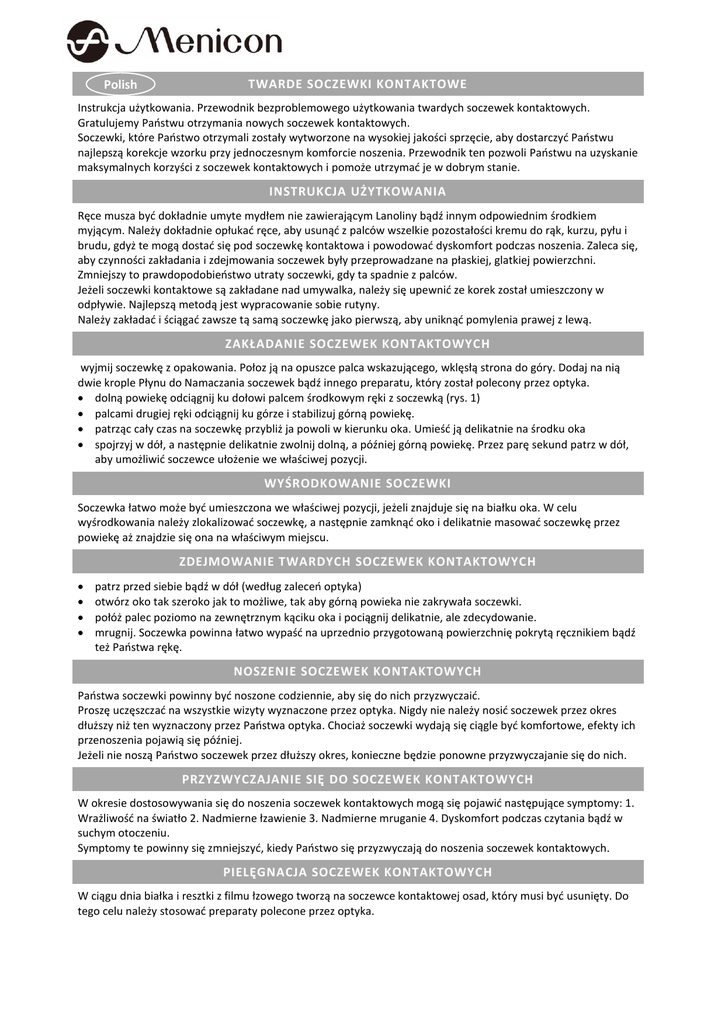 Polish TWARDE SOCZEWKI KONTAKTOWE Instrukcja użytkowania. Przewodnik bezproblemowego użytkowania twardych soczewek kontaktowych. Gratulujemy Państwu otrzymania nowych soczewek kontaktowych. Soczewki, które Państwo otrzymali zostały wytworzone na wysokiej jakości sprzęcie, aby dostarczyć Państwu najlepszą korekcje wzorku przy jednoczesnym komforcie noszenia. Przewodnik ten pozwoli Państwu na uzyskanie maksymalnych korzyści z soczewek kontaktowych i pomoże utrzymać je w dobrym stanie. INSTRUKCJA UŻYTKOWANIA Ręce musza być dokładnie umyte mydłem nie zawierającym Lanoliny bądź innym odpowiednim środkiem myjącym. Należy dokładnie opłukać ręce, aby usunąć z palców wszelkie pozostałości kremu do rąk, kurzu, pyłu i brudu, gdyż te mogą dostać się pod soczewkę kontaktowa i powodować dyskomfort podczas noszenia. Zaleca się, aby czynności zakładania i zdejmowania soczewek były przeprowadzane na płaskiej, glatkiej powierzchni. Zmniejszy to prawdopodobieństwo utraty soczewki, gdy ta spadnie z palców. Jeżeli soczewki kontaktowe są zakładane nad umywalka, należy się upewnić ze korek został umieszczony w odpływie. Najlepszą metodą jest wypracowanie sobie rutyny. Należy zakładać i ściągać zawsze tą samą soczewkę jako pierwszą, aby uniknąć pomylenia prawej z lewą. ZAKŁADANIE SOCZEWEK KONTAKTOWYCH wyjmij soczewkę z opakowania. Połoz ją na opuszce palca wskazującego, wklęsłą strona do góry. Dodaj na nią dwie krople Płynu do Namaczania soczewek bądź innego preparatu, który został polecony przez optyka. dolną powiekę odciągnij ku dołowi palcem środkowym ręki z soczewką (rys. 1) palcami drugiej ręki odciągnij ku górze i stabilizuj górną powiekę. patrząc cały czas na soczewkę przybliż ja powoli w kierunku oka. Umieść ją delikatnie na środku oka spojrzyj w dół, a następnie delikatnie zwolnij dolną, a później górną powiekę. Przez parę sekund patrz w dół, aby umożliwić soczewce ułożenie we właściwej pozycji. WYŚRODKOWANIE SOCZEWKI Soczewka łatwo może być umieszczona we właściwej pozycji, jeżeli znajduje się na białku oka. W celu wyśrodkowania należy zlokalizować soczewkę, a następnie zamknąć oko i delikatnie masować soczewkę przez powiekę aż znajdzie się ona na właściwym miejscu. ZDEJMOWANIE TWARDYCH SOCZEWEK KONTAKTOWYCH patrz przed siebie bądź w dół (według zaleceń optyka) otwórz oko tak szeroko jak to możliwe, tak aby górną powieka nie zakrywała soczewki. połóż palec poziomo na zewnętrznym kąciku oka i pociągnij delikatnie, ale zdecydowanie. mrugnij. Soczewka powinna łatwo wypaść na uprzednio przygotowaną powierzchnię pokrytą ręcznikiem bądź też Państwa rękę. NOSZENIE SOCZEWEK KONTAKTOWYCH Państwa soczewki powinny być noszone codziennie, aby się do nich przyzwyczaić. Proszę uczęszczać na wszystkie wizyty wyznaczone przez optyka. Nigdy nie należy nosić soczewek przez okres dłuższy niż ten wyznaczony przez Państwa optyka. Chociaż soczewki wydają się ciągle być komfortowe, efekty ich przenoszenia pojawią się później. Jeżeli nie noszą Państwo soczewek przez dłuższy okres, konieczne będzie ponowne przyzwyczajanie się do nich. PRZYZWYCZAJANIE SIĘ DO SOCZEWEK KONTAKTOWYCH W okresie dostosowywania się do noszenia soczewek kontaktowych mogą się pojawić następujące symptomy: 1. Wrażliwość na światło 2. Nadmierne łzawienie 3. Nadmierne mruganie 4. Dyskomfort podczas czytania bądź w suchym otoczeniu. Symptomy te powinny się zmniejszyć, kiedy Państwo się przyzwyczają do noszenia soczewek kontaktowych. PIELĘGNACJA SOCZEWEK KONTAKTOWYCH W ciągu dnia białka i resztki z filmu łzowego tworzą na soczewce kontaktowej osad, który musi być usunięty. Do tego celu należy stosować preparaty polecone przez optyka. Kiedy soczewki nie są używane, należy je przechowywać w odpowiednim opakowaniu, w płynie poleconym przez optyka. Roztwór ten dezynfekuje soczewki i zabezpiecza je przed mikrobiologicznym zanieczyszczeniem, przez co redukuje ryzyko infekcji. Płyn do przechowywania soczewek ma również właściwości nawilżające i odżywiające, co powoduje ze soczewka jest pokryta zwilżoną warstwą, która działa jak „poduszka” pomiędzy soczewka i rogówką oraz pomiędzy soczewka i powieką. Zapewnia to większy komfort zaraz po założeniu jak i w ciągu dnia, a jednocześnie pomaga zredukować gromadzenie się osadu na soczewce. Dla maksymalnego komfortu twarde soczewki kontaktowe powinny być stale przechowywane w stanie mokrym. Jeżeli Państwa soczewki przez nieuwagę zostaną dopuszczone do wyschnięcia, należy je oczyścić przy pomocy Płynu do Czyszczenia i zanurzyć w Płynie do Namaczania bądź Odżywce w Płynie. Proszę zapoznać się i postępować zgodnie z instrukcją wydaną przez producenta płynu do soczewek, który Państwo używają. Nie należy używać płynów przeterminowanych. Nie należy rozcieńczać płynów, ponieważ to zmniejsza efektywność ich działania. Należy się stosować do zaleceń optyka, który zasugeruje najlepsze płyny odpowiednie dla Państwa typu soczewek. ZASADY KORZYSTANIA Z SOCZEWEK KONTAKTOWYCH. Zawsze. Zakładaj i zdejmuj soczewki delikatnie. Zawsze. Trzymaj swoje soczewki w miejscu niedostępnym dla dzieci. Zawsze. Wymieniaj soczewki na nowe jeżeli uległy zniszczeniu bądź porysowaniu. Zawsze. Postępuj zgodnie z instrukcjami i radami Twojego okulisty dotyczącymi czyszczenia, przechowywania oraz obchodzenia się z soczewkami. Zawsze. Uczęszczaj na wszystkie zalecane przez lekarza prowadzącego wizyty. Zawsze. Zdejmuj soczewki kontaktowe jeżeli odczujesz jakiekolwiek niepożądane reakcje. Jeżeli one nie ustna, skonsultuj się ze specjalistą. Zawsze. Myj ręce przed zakładaniem soczewek. Aby uniknąć dostania się drobniutkich włókien na soczewkę, przed dotykaniem jej strzep dłonie i osusz je ręcznikiem. Zawsze. Trzymaj p