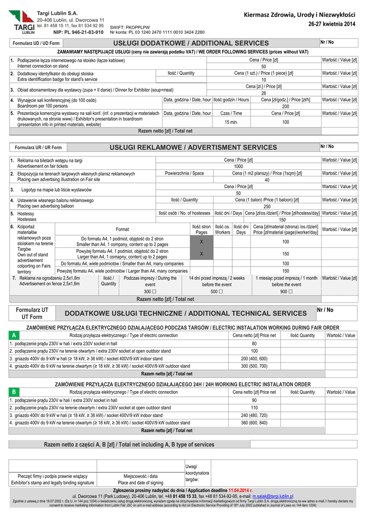 Kiermasz Zdrowia, Urody i Niezwykłości 26-27 kwietnia 2014 SWIFT: PKOPPLPW Nr konta: PL 03 1240 2470 1111 0010 3424 2280 Nr / No USŁUGI DODATKOWE / ADDITIONAL SERVICES Formularz UD / UD Form ZAMAWIAMY NASTĘPUJĄCE USŁUGI (ceny nie zawierają podatku VAT) / WE ORDER FOLLOWING SERVICES (prices without VAT) 1. Podłączenie łącza internetowego na stoisko (łącze kablowe) Internet connection on stand Cena / Price [zł] 50 Ilość / Quantity Cena (1 szt.) / Price (1 piece) [zł] Dodatkowy identyfikator do obsługi stoiska Extra identiffication badge for stand’s service 10 Cena [zł.] / Price [zł] Obiad abonamentowy dla wystawcy (zupa + II danie) / Dinner for Exhibitor (soup+meal) 26 Data, godzina / Date, hour Ilość godzin / Hours Cena [zł/godz.] / Price [zł/h] Wynajęcie sali konferencyjnej (do 100 osób) Boardroom per 100 persons 200 Prezentacja komercyjna wystawcy na sali konf. (inf. o prezentacji w materiałach Data, godzina / Date, hour Czas / Time Cena / Price [zł] drukowanych, na stronie www) / Exhibitor’s presentation in boardroom 15 min. 100 (presentation info in printed materials, website) Wartość / Value [zł] 2. Wartość / Value [zł] 3. 4. 5. Wartość / Value [zł] Wartość / Value [zł] Wartość / Value [zł] Razem netto [zł] / Total net Nr / No USŁUGI REKLAMOWE / ADVERTISMENT SERVICES Formularz UR / UR Form 1. Reklama na biletach wstępu na targi Advertisement on fair tickets Wartość / Value [zł] 2. Wartość / Value [zł] 3. 4. 5. 6. 7. Cena / Price [zł] 1000 Powierzchnia / Space Cena (1 m2 planszy) / Price (1sqm) [zł] Ekspozycja na terenach targowych własnych plansz reklamowych Placing own advertising illustration on Fair site 40 Cena / Price [zł] Logotyp na mapie lub liście wystawców 50 Ilość / Quantity Cena (1 balon) /Price (1 baloon) [zł] Ustawienie własnego balonu reklamowego Placing own advertising balloon 250 Ilość osób / No. of hostesses Ilość dni / Days Cena [zł/os./dzień] / Price [zł/hostess/day] Hostessy Hostesses 150 Kolportaż Ilość stron Ilość os. Ilość dni Cena [zł/materiał (strona) /os./dzień] Format materiałów Pages Workers Days Price [zł/material (page)/worker/day] reklamowych poza Do formatu A4, 1 podmiot, objętość do 2 stron X 100 stoiskiem na terenie Smaller than A4, 1 company, content up to 2 pages Targów Powyżej formatu A4, 1 podmiot, objętość do 2 stron X 150 Own out of stand Larger than A4, 1 comapny, content up to 2 pages advertisement Do formatu A4, wiele podmiotów / Smaller than A4, many companies 100 colporting on Fairs Powyżej formatu A4, wiele podmiotów / Larger than A4, many companies 150 territory Reklama na ogrodzeniu 2,5x1,8m Ilość / Podczas imprezy / During the 14 dni przed imprezą / 2 weeks 1 miesiąc przed imprezą / 1 month Advertisement on fence 2,5x1,8m Quantity event before the event before the event 300 500 900 Wartość / Value [zł] Wartość / Value [zł] Wartość / Value [zł] Wartość / Value [zł] Wartość / Value [zł] Razem netto [zł] / Total net Formularz UT UT Form DODATKOWE USŁUGI TECHNICZNE / ADDITIONAL TECHNICAL SERVICES Nr / No ZAMÓWIENIE PRZYŁĄCZA ELEKTRYCZNEGO DZIAŁAJĄCEGO PODCZAS TARGÓW / ELECTRIC INSTALATION WORKING DURING FAIR ORDER A Rodzaj przyłącza elektrycznego / Type of electric connection Cena netto [zł] Price net 1. podłączenie prądu 230V w hali / extra 230V socket in hall 80 2. podłączenie prądu 230V na terenie otwartym / extra 230V socket at open outdoor stand 100 3. gniazdo 400V do 9 kW w hali (≥ 18 kW, ≥ 36 kW) / socket 400V/9 kW indoor stand 200 (400, 600) 4. gniazdo 400V do 9 kW na terenie otwartym (≥ 18 kW, ≥ 36 kW) / socket 400V/9 kW outdoor stand 300 (500, 700) Ilość Quantity Wartość / Value Razem netto [zł] / Total net ZAMÓWIENIE PRZYŁĄCZA ELEKTRYCZNEGO DZIAŁAJĄCEGO 24H / 24H WORKING ELECTRIC INSTALATION ORDER B Rodzaj przyłącza elektrycznego / Type of electric connection Cena netto [zł] Price net 1. podłączenie prądu 230V w hali / extra 230V socket in hall Ilość Quantity Wartość / Value 90 2. podłączenie prądu 230V na terenie otwartym / extra 230V socket at open outdoor stand 110 3. gniazdo 400V do 9 kW w hali (≥ 18 kW, ≥ 36 kW) / socket 400V/9 kW indoor stand 240 (480, 720) 4. gniazdo 400V do 9 kW na terenie otwartym (≥ 18 kW, ≥ 36 kW) / socket 400V/9 kW outdoor stand 360 (600, 840) Razem netto [zł] / Total net Razem netto z części A, B [zł] / Total net including A, B type of services Pieczęć firmy i podpis prawnie wiążący Exhibitor’s stamp and legally binding signature Miejscowość i data Place and date of signing Uwagi koordynatora targów: Zgłoszenia prosimy nadsyłać do dnia / Application deadline 11.04.2014 r. ul. Dworcowa 11 (Park Ludowy), 20-406 Lublin, tel. +48 81 458 15 33, fax +48 81 534-92-95, e-mail: [email protected] Zgodnie z ustawą z dnia 18.07.2002 r. (Dz.U. nr 144 poz.1204) o świadczeniu usług drogą elektroniczną, wyrażam zgodę na otrzymywanie informacji marketingowych od firmy Targi Lublin S.A. drogą elektroniczną na ww adres e-mail./ I hereby declare my consent to receive marketing information from Lublin Fair JSC on a/m e-mail address (according to Act on Electronic Service Providing of 18 th July 2002 published in Journal of Laws no 144 item 1204)