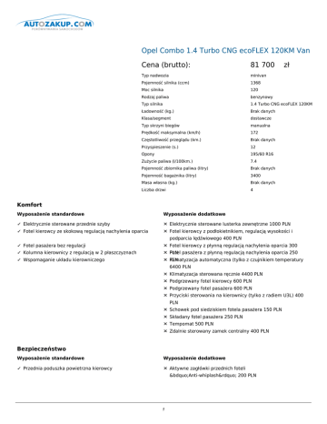 Opel Combo 1.4 Turbo CNG ecoFLEX 120KM Van Cena (brutto): 81 700 zł Typ nadwozia minivan Pojemność silnika (ccm) 1368 Moc silnika 120 Rodzaj paliwa benzynowy Typ silnika 1.4 Turbo CNG ecoFLEX 120KM Ładowność (kg.) Brak danych Klasa/segment dostawcze Typ skrzyni biegów manualna Prędkość maksymalna (km/h) 172 Częstotliwość przeglądu (km.) Brak danych Przyspieszenie (s.) 12 Opony 195/60 R16 Zużycie paliwa (l/100km.) 7.4 Pojemność zbiornika paliwa (litry) Brak danych Pojemność bagażnika (litry) 3400 Masa własna (kg.) Brak danych Liczba drzwi 4 Komfort Wyposażenie standardowe Wyposażenie dodatkowe ✓ Elektrycznie sterowane przednie szyby ✕ Elektrycznie sterowane lusterka zewnętrzne 1000 PLN ✓ Fotel kierowcy ze skokową regulacją nachylenia oparcia ✕ Fotel kierowcy z podłokietnikiem, regulacją wysokości i ✓ Fotel pasażera bez regulacji ✕ Fotel kierowcy z płynną regulacją nachylenia oparcia 300 ✓ Kolumna kierownicy z regulacją w 2 płaszczyznach ✕ Fotel PLN pasażera z płynną regulacją nachylenia oparcia 250 ✓ Wspomaganie układu kierowniczego ✕ Klimatyzacja PLN automatyczna (tylko z czujnikiem temperatury podparcia lędźwiowego 400 PLN 6400 PLN ✕ Klimatyzacja sterowana ręcznie 4400 PLN ✕ Podgrzewany fotel kierowcy 600 PLN ✕ Podgrzewany fotel pasażera 600 PLN ✕ Przyciski sterowania na kierownicy (tylko z radiem U3L) 400 PLN ✕ Schowek pod siedziskiem fotela pasażera 150 PLN ✕ Składany fotel pasażera 250 PLN ✕ Tempomat 500 PLN ✕ Zdalnie sterowany zamek centralny 400 PLN Bezpieczeństwo Wyposażenie standardowe Wyposażenie dodatkowe ✓ Przednia poduszka powietrzna kierowcy ✕ Aktywne zagłówki przednich foteli „Anti-whiplash” 200 PLN 1 ✕ Boczne poduszki powietrzne kierowcy i pasażera (tylko z fotelem kierowcy DCW/DCY) Zawiera: przednia poduszka pasażera 1000 PLN ✕ Opony zimowe 1000 PLN ✕ Przednia poduszka powietrzna pasażera 800 PLN ✕ System stabilizacji toru jazdy ESP Zawiera: układ wspomagania ruszania na pochyłościach 2500 PLN Dodatki Wyposażenie standardowe Wyposażenie dodatkowe ✓ Brak przeszklenia części bagażowej ✕ Blokada zamków „deadlock” (tylko z ✓ Felgi stalowe 15x6”, z oponami 185/65 R15 92T ✕ Czujnik parkowania z tyłu 800 PLN centralnym zamkiem CLA) 200 PLN (standard dla wersji 1.3 CDTI i 1.6 CDTI) ✓ Felgi stalowe 16x6”, z oponami 195/60 R16 99T ✕ Czujnik temperatury zewnętrznej (tylko z elektrycznie (standard dla wersji 1.4, 1.4 Turbo CNG i 2.0 CDTI) ✓ Instalacja do montażu radia sterowanymi lusterkami DL8) 200 PLN ✕ Dodatkowy kluczyk z pilotem (tylko z centralnym zamkiem CLA, niedostępny z kluczykiem KTN) 200 PLN ✓ Kołpaki piast kół ✕ Felgi aluminiowe 16x6”, z oponami 195/60 R16 99T 1800 PLN ✓ Lewy panel boczny bez okna ✕ Flex Cargo – rozkładana przegroda z kraty nad fotelem pasażera 500 PLN ✓ Lusterka zewnętrzne w kolorze czarnym ✕ Gniazdko 12V w przestrzeni bagażowej na słupku D (niedostępne z silnikiem 1.4 Turbo CNG) 200 PLN ✓ Pełna przegroda kabiny odddzielająca przedział pasażerski ✕ Instalacja do alarmu (tylko z centralnym zamkiem CLA) 300 od bagażowego ✓ Pełnowymiarowe koło zapasowe PLN ✕ Koło kierownicy pokryte skórą (z dźwignią zmiany biegów dla wersji z manualną skrzynią, tylko z przyciskami sterowania KKC) 700 PLN ✓ Podwyższona ładowność dla wersji L2, standardowy dach ✕ Lakier metaliczny 1700 PLN (H1) ✓ Prawe drzwi przesuwane bez okna (standard w wersji L2) ✕ Lewe drzwi przesuwane bez okna 1400 PLN ✓ Prawy panel boczny bez okna (niedostępny w wersji L2) ✕ Lewe drzwi przesuwane ze stałym oknem 2000 PLN ✓ Tapicerka Cube Black, materiałowa czarna, czarne panele ✕ Lusterka zewnętrzne w kolorze nadwozia 200 PLN drzwi ✓ Tylne drzwi skrzydłowe, asymetryczne, nieprzeszklone ✕ Materiał wyciszający na pełnej przegrodzie kabiny 200 PLN ✓ Układ ABS ✕ Pełna przegroda kabiny z oknem (tylko z tylną klapą J1U/J1X) 400 PLN ✕ Pełnowymiarowe kołpaki kół 200 PLN ✕ Podwyższona ładowność dla wersji L1, standardowy dach (H1) (wyposażenie standardowe z 1.4 Turbo CNG) 1000 PLN ✕ Podłoga przestrzeni bagażowej pokryta tworzywem PVC 200 PLN ✕ Popielniczka i zapalniczka (pakiet dla palących) 200 PLN ✕ Prawe drzwi przesuwane bez okna (standard w wersji L2) 1400 PLN ✕ Prawe drzwi przesuwane ze stałym oknem 2000 PLN ✕ 2 Przeszklenie lewego panelu bocznego, szyba stała 250 PLN 3 ✕ Przeszklenie prawego panelu bocznego, szyba stała 250 PLN ✕ Radioodbiornik RDS z odtwarzaczem CD, 4 głośniki 4x20W (niedostępny z przyciskami sterowania KKC i zestawem Bluetooth) 900 PLN ✕ Radioodbiornik RDS z odtwarzaczem CD/MP3, 4 głośniki 4x20W 1500 PLN ✕ Relingi dachowe (niedostępne z wysokim dachem) 600 PLN ✕ Spryskiwacze przednich reflektorów (tylko ze zderzakami w kolorze nadwozia VT4) 500 PLN ✕ Światła przeciwmgielne przednie 600 PLN ✕ System Start/Stop (niedostępny z silnikiem 1.4 Turbo CNG) 1500 PLN ✕ Tapicerka Vinyl Black, winylowa czarna, czarne panele drzwi 400 PLN ✕ Trzeci kluczyk mechaniczny (tylko z centralnym zamkiem CLA) 100 PLN ✕ Tylne drzwi skrzydłowe, asymetryczne, przeszklone z ogrzewaniem tylnej szyby (w wersji Van tylko z przegrodami AX9/AYU,standard dla wersji z podwyższonym dachem H2) ✕ Tylny 600 PLN otwierany luk bagażowy w dachu 2200 PLN ✕ Uchwyt na dokumenty na desce rozdzielczej 150 PLN ✕ Wewnętrzne belki pod dachem w przestrzeni bagażowej – uchwyt na drabinę 900 PLN ✕ Wyjmowana lampka z funkcją latarki w przestrzeni bagażowej, ładowana 200 PLN ✕ Wysoki dach (H2) (niedostępny z silnikami 1.3 CDTI i 1.4 Turbo CNG, dostępny tylko w wersji L1) 5000 PLN ✕ Wysoki dach (H2) i podwyższona ładowność (niedostępny z silnikiem 1.3 CDTI, dostępny tylko w wersji L1) 6000 PLN ✕ Zderzaki w kolorze nadwozia 600 PLN ✕ Zestaw Bluetooth Viva-Voice ze złączami USB i AUX-in (tylko z przyciskami sterowania KK