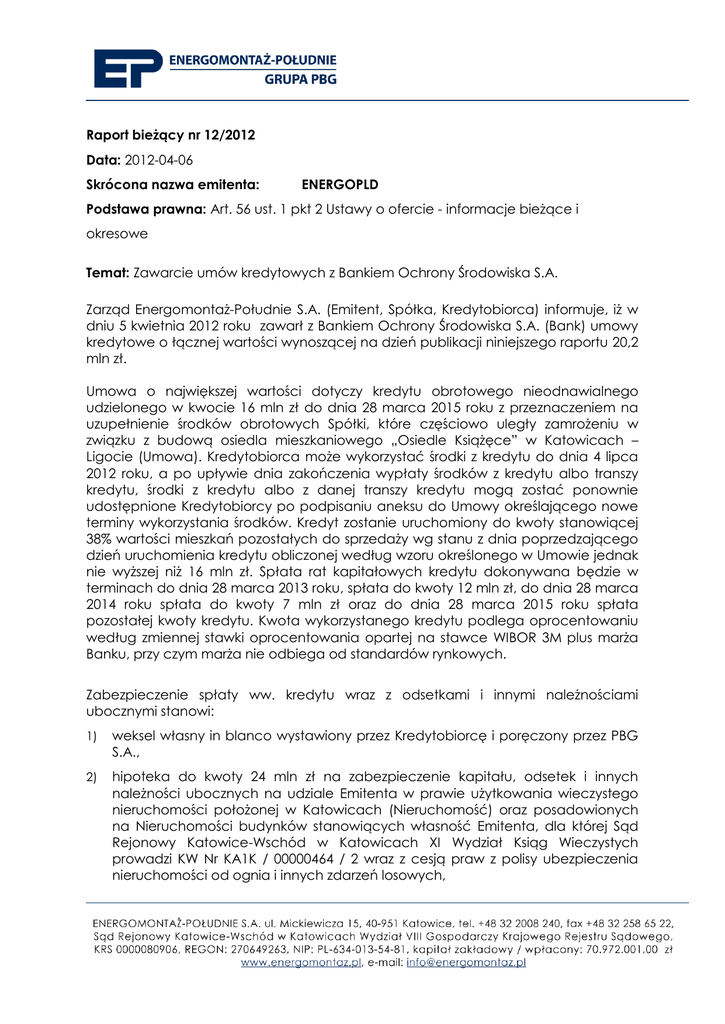 Raport bieżący nr 12/2012 Data: 2012-04-06 Skrócona nazwa emitenta: ENERGOPLD Podstawa prawna: Art. 56 ust. 1 pkt 2 Ustawy o ofercie - informacje bieżące i okresowe Temat: Zawarcie umów kredytowych z Bankiem Ochrony Środowiska S.A. Zarząd Energomontaż-Południe S.A. (Emitent, Spółka, Kredytobiorca) informuje, iż w dniu 5 kwietnia 2012 roku zawarł z Bankiem Ochrony Środowiska S.A. (Bank) umowy kredytowe o łącznej wartości wynoszącej na dzień publikacji niniejszego raportu 20,2 mln zł. Umowa o największej wartości dotyczy kredytu obrotowego nieodnawialnego udzielonego w kwocie 16 mln zł do dnia 28 marca 2015 roku z przeznaczeniem na uzupełnienie środków obrotowych Spółki, które częściowo uległy zamrożeniu w związku z budową osiedla mieszkaniowego „Osiedle Książęce” w Katowicach – Ligocie (Umowa). Kredytobiorca może wykorzystać środki z kredytu do dnia 4 lipca 2012 roku, a po upływie dnia zakończenia wypłaty środków z kredytu albo transzy kredytu, środki z kredytu albo z danej transzy kredytu mogą zostać ponownie udostępnione Kredytobiorcy po podpisaniu aneksu do Umowy określającego nowe terminy wykorzystania środków. Kredyt zostanie uruchomiony do kwoty stanowiącej 38% wartości mieszkań pozostałych do sprzedaży wg stanu z dnia poprzedzającego dzień uruchomienia kredytu obliczonej według wzoru określonego w Umowie jednak nie wyższej niż 16 mln zł. Spłata rat kapitałowych kredytu dokonywana będzie w terminach do dnia 28 marca 2013 roku, spłata do kwoty 12 mln zł, do dnia 28 marca 2014 roku spłata do kwoty 7 mln zł oraz do dnia 28 marca 2015 roku spłata pozostałej kwoty kredytu. Kwota wykorzystanego kredytu podlega oprocentowaniu według zmiennej stawki oprocentowania opartej na stawce WIBOR 3M plus marża Banku, przy czym marża nie odbiega od standardów rynkowych. Zabezpieczenie spłaty ww. kredytu wraz z odsetkami i innymi należnościami ubocznymi stanowi: 1) weksel własny in blanco wystawiony przez Kredytobiorcę i poręczony przez PBG S.A., 2) hipoteka do kwoty 24 mln zł na zabezpieczenie kapitału, odsetek i innych należności ubocznych na udziale Emitenta w prawie użytkowania wieczystego nieruchomości położonej w Katowicach (Nieruchomość) oraz posadowionych na Nieruchomości budynków stanowiących własność Emitenta, dla której Sąd Rejonowy Katowice-Wschód w Katowicach XI Wydział Ksiąg Wieczystych prowadzi KW Nr KA1K / 00000464 / 2 wraz z cesją praw z polisy ubezpieczenia nieruchomości od ognia i innych zdarzeń losowych, 3) pełnomocnictwo do rachunków bieżących w Banku. W przypadkach określonych w Umowie m.in. w przypadku niedostarczenia do Banku w terminie 10 dni roboczych od uprawomocnienia postanowienia dotyczącego wpisu hipoteki do kwoty 24 mln zł na zabezpieczenie spłaty wszystkich zobowiązań wynikających z umowy kredytowej, odpisu księgi wieczystej, niedostarczenia na wniosek Banku aktualnej wyceny Nieruchomości lub aktualnego odpisu z księgi wieczystej prowadzonej dla Nieruchomości, przerwania w okresie kredytowania ubezpieczenia Nieruchomości, utraty albo pogorszenia zdolności kredytowej przez Kredytobiorcę, wszczęcia przekraczającej kwotę 200.000 zł egzekucji wobec Kredytobiorcy przez innego/innych niż Bank wierzyciela/wierzycieli, Bank może wypowiedzieć Umowę albo podwyższyć marżę. Zgodnie z treścią Umowy Kredytobiorca zobowiązał się, pod rygorem wypowiedzenia Umowy albo podwyższenia marży, do informowania Banku na bieżąco o faktach mających wpływ na jego sytuację ekonomiczną, finansową i prawną, mogących mieć wpływ na wykonywanie przez niego postanowień Umowy. Jednocześnie Kredytobiorca zobowiązał się do utrzymywania w całym okresie kredytowania minimalnych poziomów wskaźników finansowych, których weryfikacja odbywać się będzie w okresach kwartalnych na podstawie kwartalnych sprawozdań finansowych. Emitent uznaje 10% kapitałów własnych Spółki jako kryterium uznania umów za znaczące. Podpis osoby upoważnionej: Bartosz Basa