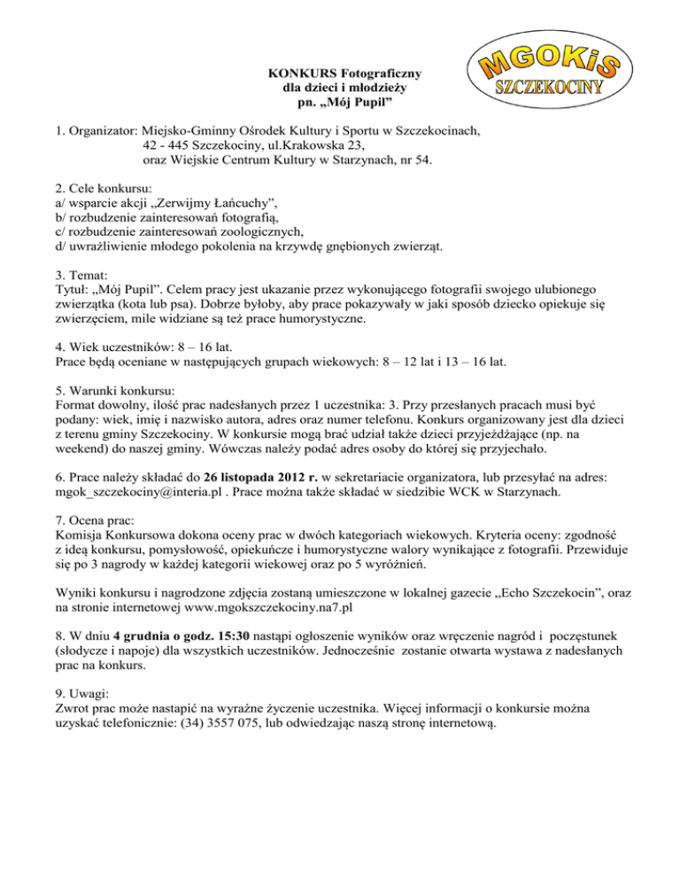 KONKURS Fotograficzny dla dzieci i młodzieży pn. „Mój Pupil” 1. Organizator: Miejsko-Gminny Ośrodek Kultury i Sportu w Szczekocinach, 42 - 445 Szczekociny, ul.Krakowska 23, oraz Wiejskie Centrum Kultury w Starzynach, nr 54. 2. Cele konkursu: a/ wsparcie akcji „Zerwijmy Łańcuchy”, b/ rozbudzenie zainteresowań fotografią, c/ rozbudzenie zainteresowań zoologicznych, d/ uwrażliwienie młodego pokolenia na krzywdę gnębionych zwierząt. 3. Temat: Tytuł: „Mój Pupil”. Celem pracy jest ukazanie przez wykonującego fotografii swojego ulubionego zwierzątka (kota lub psa). Dobrze byłoby, aby prace pokazywały w jaki sposób dziecko opiekuje się zwierzęciem, mile widziane są też prace humorystyczne. 4. Wiek uczestników: 8 – 16 lat. Prace będą oceniane w następujących grupach wiekowych: 8 – 12 lat i 13 – 16 lat. 5. Warunki konkursu: Format dowolny, ilość prac nadesłanych przez 1 uczestnika: 3. Przy przesłanych pracach musi być podany: wiek, imię i nazwisko autora, adres oraz numer telefonu. Konkurs organizowany jest dla dzieci z terenu gminy Szczekociny. W konkursie mogą brać udział także dzieci przyjeżdżające (np. na weekend) do naszej gminy. Wówczas należy podać adres osoby do której się przyjechało. 6. Prace należy składać do 26 listopada 2012 r. w sekretariacie organizatora, lub przesyłać na adres: [email protected] . Prace można także składać w siedzibie WCK w Starzynach. 7. Ocena prac: Komisja Konkursowa dokona oceny prac w dwóch kategoriach wiekowych. Kryteria oceny: zgodność z ideą konkursu, pomysłowość, opiekuńcze i humorystyczne walory wynikające z fotografii. Przewiduje się po 3 nagrody w każdej kategorii wiekowej oraz po 5 wyróżnień. Wyniki konkursu i nagrodzone zdjęcia zostaną umieszczone w lokalnej gazecie „Echo Szczekocin”, oraz na stronie internetowej www.mgokszczekociny.na7.pl 8. W dniu 4 grudnia o godz. 15:30 nastąpi ogłoszenie wyników oraz wręczenie nagród i poczęstunek (słodycze i napoje) dla wszystkich uczestników. Jednocześnie zostanie otwarta wystawa z nadesłanych prac na konkurs. 9. Uwagi: Zwrot prac może nastapić na wyraźne życzenie uczestnika. Więcej informacji o konkursie można uzyskać telefonicznie: (34) 3557 075, lub odwiedzając naszą stronę internetową.