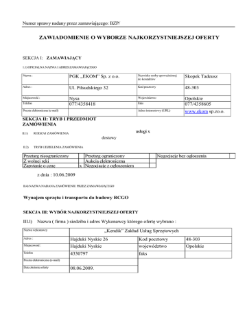 Numer sprawy nadany przez zamawiającego: BZP/ ZAWIADOMIENIE O WYBORZE NAJKORZYSTNIEJSZEJ OFERTY SEKCJA I: ZAMAWIAJĄCY 1.1) OFICJALNA NAZWA I ADRES ZAMAWIAJĄCEGO Nazwa : PGK „EKOM” Sp. z o.o. Nazwisko osoby upoważnionej do kontaktów Skopek Tadeusz Adres : Ul. Piłsudskiego 32 Kod pocztowy 48-303 Miejscowość : Nysa 077/4358418 Województwo Opolskie 077/4358605 Telefon Faks Poczta elektroniczna (e-mail) Adres internetowy (URL) www.ekom sp.zo.o. SEKCJA II: TRYB I PRZEDMIOT ZAMÓWIENIA II.1) usługi x RODZAJ ZAMÓWIENIA dostawy II.2) TRYB UDZIELENIA ZAMÓWIENIA Przetarg nieograniczony Z wolnej ręki Zapytanie o cenę Negocjacje bez ogłoszenia Przetarg ograniczony Aukcja elektroniczna x Negocjacje z ogłoszeniem z dnia : 10.06.2009 II.4) NAZWA NADANA ZAMÓWIENIU PRZEZ ZAMAWIAJĄCEGO Wynajem sprzętu i transportu do budowy RCGO SEKCJA III: WYBÓR NAJKORZYSTNIEJSZEJ OFERTY III.l) Nazwa ( firma ) siedziba i adres Wykonawcy którego ofertę wybrano : „Kendik” Zakład Usług Sprzętowych Nazwa wykonawcy Adres : Hajduki Nyskie 26 Kod pocztowy 48-303 Miejscowość : Hajduki Nyskie województwo Opolskie Telefon 4330797 faks Poczta elektroniczna (e-mail) Data złożenia oferty 08.06.2009. str. 2 Numer sprawy nadany przez zamawiającego: III.2) Uzasadnienie wyboru oferty : Najkorzystniejsza oferta SEKCJA IV: INFORMACJE O WYKONAWCACH I OFERTACH IV. 1) Informacja o Wykonawcach którzy złożyli oferty : Streszczenie oceny i porównania złożonych ofert Punktacja przyznana w poszczególnych kryteriach oceny ofert Łączna punktacja Wykonawca X Suma Cen BDM Dariusz Morawiecki 200 80 „Kendik” Zakład Usług Sprzętowych 160 100 TRA-PER Mariusz Michel 197 81,2 Zakład usługowy Wykonawstwa Robót Ziemnych Piotr Sliwiński Infradróg MeljoracjiNysa Śliwiński Piotr 173 92,4 172 93 IV.2) Wykonawcy, których oferty zostały odrzucone : Wykonawca X Uzasadnienie faktyczne i prawne odrzucenia oferty X IV.3) Wykonawcy, którzy zostali wykluczeni z postępowania o udzielenie zamówienia : Wykonawca Uzasadnienie faktyczne i prawne odrzucenia oferty Wykluczenia Wykonawcy X X IV.4) Data zawiadomienia : 10.06.2009 ............................................. ( podpis kierownika zamawiającego )