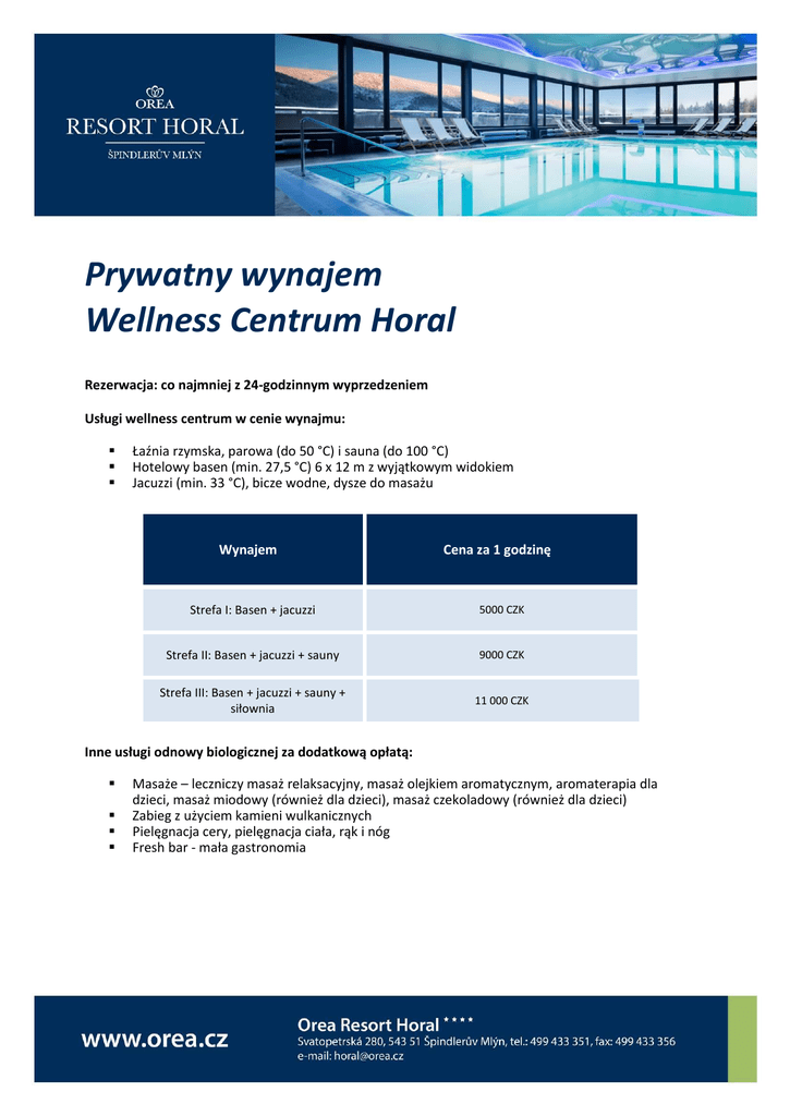 Prywatny wynajem Wellness Centrum Horal Rezerwacja: co najmniej z 24-godzinnym wyprzedzeniem Usługi wellness centrum w cenie wynajmu: Łaźnia rzymska, parowa (do 50 °C) i sauna (do 100 °C) Hotelowy basen (min. 27,5 °C) 6 x 12 m z wyjątkowym widokiem Jacuzzi (min. 33 °C), bicze wodne, dysze do masażu Wynajem Cena za 1 godzinę Strefa I: Basen + jacuzzi 5000 CZK Strefa II: Basen + jacuzzi + sauny 9000 CZK Strefa III: Basen + jacuzzi + sauny + siłownia 11 000 CZK Inne usługi odnowy biologicznej za dodatkową opłatą: Masaże – leczniczy masaż relaksacyjny, masaż olejkiem aromatycznym, aromaterapia dla dzieci, masaż miodowy (również dla dzieci), masaż czekoladowy (również dla dzieci) Zabieg z użyciem kamieni wulkanicznych Pielęgnacja cery, pielęgnacja ciała, rąk i nóg Fresh bar - mała gastronomia