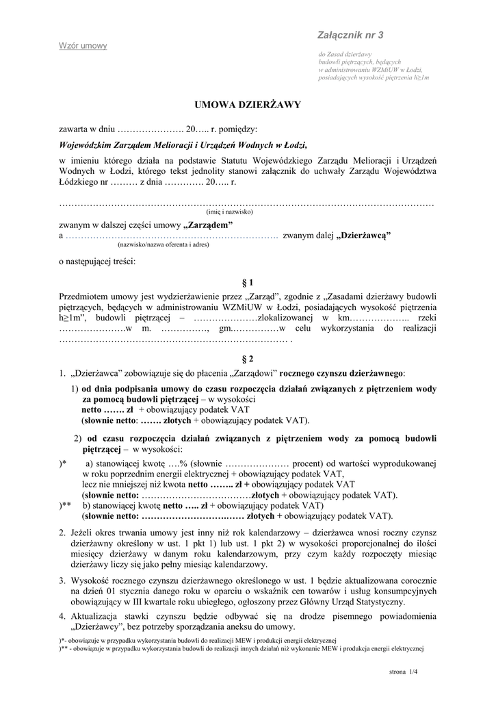 Załącznik nr 3 Wzór umowy do Zasad dzierżawy budowli piętrzących, będących w administrowaniu WZMiUW w Łodzi, posiadających wysokość piętrzenia h≥1m UMOWA DZIERŻAWY zawarta w dniu …………………. 20….. r. pomiędzy: Wojewódzkim Zarządem Melioracji i Urządzeń Wodnych w Łodzi, w imieniu którego działa na podstawie Statutu Wojewódzkiego Zarządu Melioracji i Urządzeń Wodnych w Łodzi, którego tekst jednolity stanowi załącznik do uchwały Zarządu Województwa Łódzkiego nr ……… z dnia …………. 20….. r. …………………………………………………………………………………………………………… (imię i nazwisko) zwanym w dalszej części umowy „Zarządem” a ……………………………………………………………. zwanym dalej „Dzierżawcą” (nazwisko/nazwa oferenta i adres) o następującej treści: §1 Przedmiotem umowy jest wydzierżawienie przez „Zarząd”, zgodnie z „Zasadami dzierżawy budowli piętrzących, będących w administrowaniu WZMiUW w Łodzi, posiadających wysokość piętrzenia h≥1m”, budowli piętrzącej – …………………zlokalizowanej w km……………….. rzeki ………………….w m. ……………, gm.……………w celu wykorzystania do realizacji ………………………………………………………………… . §2 1. „Dzierżawca” zobowiązuje się do płacenia „Zarządowi” rocznego czynszu dzierżawnego: 1) od dnia podpisania umowy do czasu rozpoczęcia działań związanych z piętrzeniem wody za pomocą budowli piętrzącej – w wysokości netto ……. zł + obowiązujący podatek VAT (słownie netto: ……. złotych + obowiązujący podatek VAT). 2) od czasu rozpoczęcia działań związanych z piętrzeniem wody za pomocą budowli piętrzącej – w wysokości: )* )** a) stanowiącej kwotę ….% (słownie ………………… procent) od wartości wyprodukowanej w roku poprzednim energii elektrycznej + obowiązujący podatek VAT, lecz nie mniejszej niż kwota netto …….. zł + obowiązujący podatek VAT (słownie netto: ………………………………złotych + obowiązujący podatek VAT). b) stanowiącej kwotę netto ….. zł + obowiązujący podatek VAT) (słownie netto: ……………………….…… złotych + obowiązujący podatek VAT). 2. Jeżeli okres trwania umowy jest inny niż rok kalendarzowy – dzierżawca wnosi roczny czynsz dzierżawny określony w ust. 1 pkt 1) lub ust. 1 pkt 2) w wysokości proporcjonalnej do ilości miesięcy dzierżawy w danym roku kalendarzowym, przy czym każdy rozpoczęty miesiąc dzierżawy liczy się jako pełny miesiąc kalendarzowy. 3. Wysokość rocznego czynszu dzierżawnego określonego w ust. 1 będzie aktualizowana corocznie na dzień 01 stycznia danego roku w oparciu o wskaźnik cen towarów i usług konsumpcyjnych obowiązujący w III kwartale roku ubiegłego, ogłoszony przez Główny Urząd Statystyczny. 4. Aktualizacja stawki czynszu będzie odbywać się na drodze pisemnego powiadomienia „Dzierżawcy”, bez potrzeby sporządzania aneksu do umowy. )*- obowiązuje w przypadku wykorzystania budowli do realizacji MEW i produkcji energii elektrycznej )** - obowiązuje w przypadku wykorzystania budowli do realizacji innych działań niż wykonanie MEW i produkcja energii elektrycznej strona 1/4 §3 1. Ustala się terminy płatności rocznego czynszu dzierżawnego określonego w § 2: 1) dla czynszu określonego w § 2 ust. 1 pkt 1: - do 30 ……….. każdego roku za dany rok, przy czym termin płatności za rok, w którym została podpisana umowa wynosi 30 dni kalendarzowych od dnia podpisania umowy, 2) dla czynszu określonego w § 2 ust. 1 pkt 2: )* - do 30 ………… każdego roku za rok poprzedni. )** - do 30 ………… każdego roku za dany rok. 2. Czynsz dzierżawny, określony w § 2 umowy, wpłacany będzie przez „Dzierżawcę” na podstawie niniejszej umowy i faktury VAT wystawionej przez „Zarząd”, na rachunek bankowy „Zarządu”: Nazwa Banku………………………………………………………………………………………, Nr rachunku……………………………………………………………………………………….. z dopiskiem: „Czynsz dzierżawny - budowla piętrząca w km ……. rzeki …….”. 3. Aktualizacja danych rachunku bankowego określonego w ust. 2, w przypadku jego zmiany, będzie odbywać się na drodze pisemnego powiadomienia „Dzierżawcy”, bez potrzeby sporządzania aneksu do umowy. 4. W przypadku nie dotrzymania określonych w ust. 1 terminów wnoszenia czynszu określonego w § 2 zostaną naliczone przez „Zarząd” odsetki ustawowe za zwłokę. 5. Wysokość rocznego czynszu dzierżawnego określona w §2 ust. 1 będzie powiększona o udokumentowane koszty poniesione przez „Zarząd” związane z korespondencją wzywającą do ich zapłaty. §4 Na „Dzierżawcy” ciążą następujące obowiązki: 1) Protokolarnego przejęcia budowli zgodnie z zapisem §10 ust. 1 umowy. 2) Utrzymywania i użytkowania budowli zgodnego z zasadami określonymi w art. 5 ust. 2 ustawy z dnia 7.07.1994 r. Prawo budowlane (tekst jednolity Dz. U. z 2010 r. nr 243, poz. 1623 z późn. zm.). 3) Przestrzeganie wszelkich przepisów administracyjnych, budowlanych, sanitarnych i innych związanych z dzierżawieniem budowli piętrzącej i prowadzeniem działalności związanej z jej wykorzystaniem. 4) Udostępnienie w pierwszej kolejności wody do nawodnień. 5) Uzyskanie wszelkich zezwoleń wymaganych do rozpoczęcia działalności z wykorzystaniem budowli piętrzącej, m. in. uzyskania pozwolenia wodnoprawnego. związanej 6) Uczestniczenie na wezwanie „Zarządu” w przeglądach budowli piętrzącej wynikających z zapisu art. 62 ustawy Prawo budowlane. 7) Gospodarowanie wodą, piętrzenie z wykorzystaniem budowli piętrzącej oraz jej eksploatacja będzie odbywać się zgodnie z