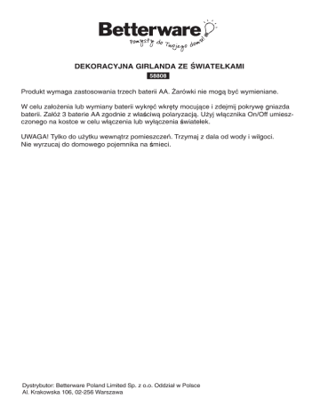 Dekoracyjna girlanda ze światełkami 58808 Produkt wymaga zastosowania trzech baterii AA. Żarówki nie mogą być wymieniane. W celu założenia lub wymiany baterii wykręć wkręty mocujące i zdejmij pokrywę gniazda baterii. Załóż 3 baterie AA zgodnie z właściwą polaryzacją. Użyj włącznika On/Off umieszczonego na kostce w celu włączenia lub wyłączenia światełek. UWAGA! Tylko do użytku wewnątrz pomieszczeń. Trzymaj z dala od wody i wilgoci. Nie wyrzucaj do domowego pojemnika na śmieci. Dystrybutor: Betterware Poland Limited Sp. z o.o. Oddział w Polsce Al. Krakowska 106, 02-256 Warszawa