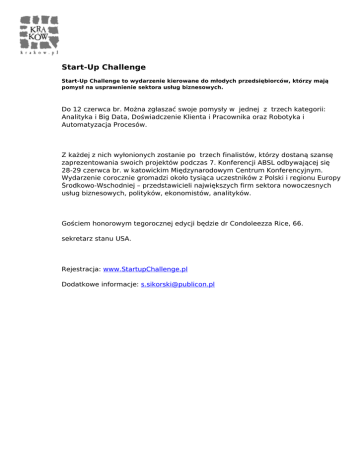 Start-Up Challenge Start-Up Challenge to wydarzenie kierowane do młodych przedsiębiorców, którzy mają pomysł na usprawnienie sektora usług biznesowych. Do 12 czerwca br. Można zgłaszać swoje pomysły w jednej z trzech kategorii: Analityka i Big Data, Doświadczenie Klienta i Pracownika oraz Robotyka i Automatyzacja Procesów. Z każdej z nich wyłonionych zostanie po trzech finalistów, którzy dostaną szansę zaprezentowania swoich projektów podczas 7. Konferencji ABSL odbywającej się 28-29 czerwca br. w katowickim Międzynarodowym Centrum Konferencyjnym. Wydarzenie corocznie gromadzi około tysiąca uczestników z Polski i regionu Europy Środkowo-Wschodniej – przedstawicieli największych firm sektora nowoczesnych usług biznesowych, polityków, ekonomistów, analityków. Gościem honorowym tegorocznej edycji będzie dr Condoleezza Rice, 66. sekretarz stanu USA. Rejestracja: www.StartupChallenge.pl Dodatkowe informacje: [email protected] Powered by TCPDF (www.tcpdf.org)