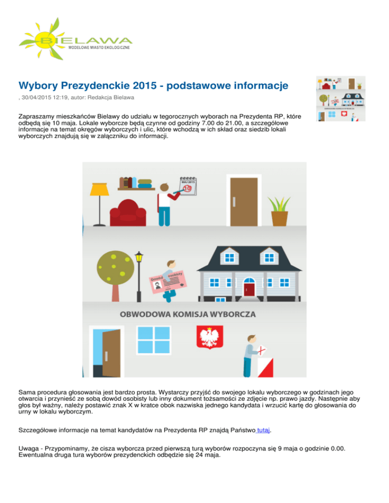 Wybory Prezydenckie 2015 - podstawowe informacje , 30/04/2015 12:19, autor: Redakcja Bielawa Zapraszamy mieszkańców Bielawy do udziału w tegorocznych wyborach na Prezydenta RP, które odbędą się 10 maja. Lokale wyborcze będą czynne od godziny 7.00 do 21.00, a szczegółowe informacje na temat okręgów wyborczych i ulic, które wchodzą w ich skład oraz siedzib lokali wyborczych znajdują się w załączniku do informacji. Sama procedura głosowania jest bardzo prosta. Wystarczy przyjść do swojego lokalu wyborczego w godzinach jego otwarcia i przynieść ze sobą dowód osobisty lub inny dokument tożsamości ze zdjęcie np. prawo jazdy. Następnie aby głos był ważny, należy postawić znak X w kratce obok nazwiska jednego kandydata i wrzucić kartę do głosowania do urny w lokalu wyborczym. Szczegółowe informacje na temat kandydatów na Prezydenta RP znajdą Państwo tutaj. Uwaga - Przypominamy, że cisza wyborcza przed pierwszą turą wyborów rozpoczyna się 9 maja o godzinie 0.00. Ewentualna druga tura wyborów prezydenckich odbędzie się 24 maja. © 2010 Gmina Bielawa. Wszelkie prawa zastrzeżone. All rights reserved. Projekt: XOOOM