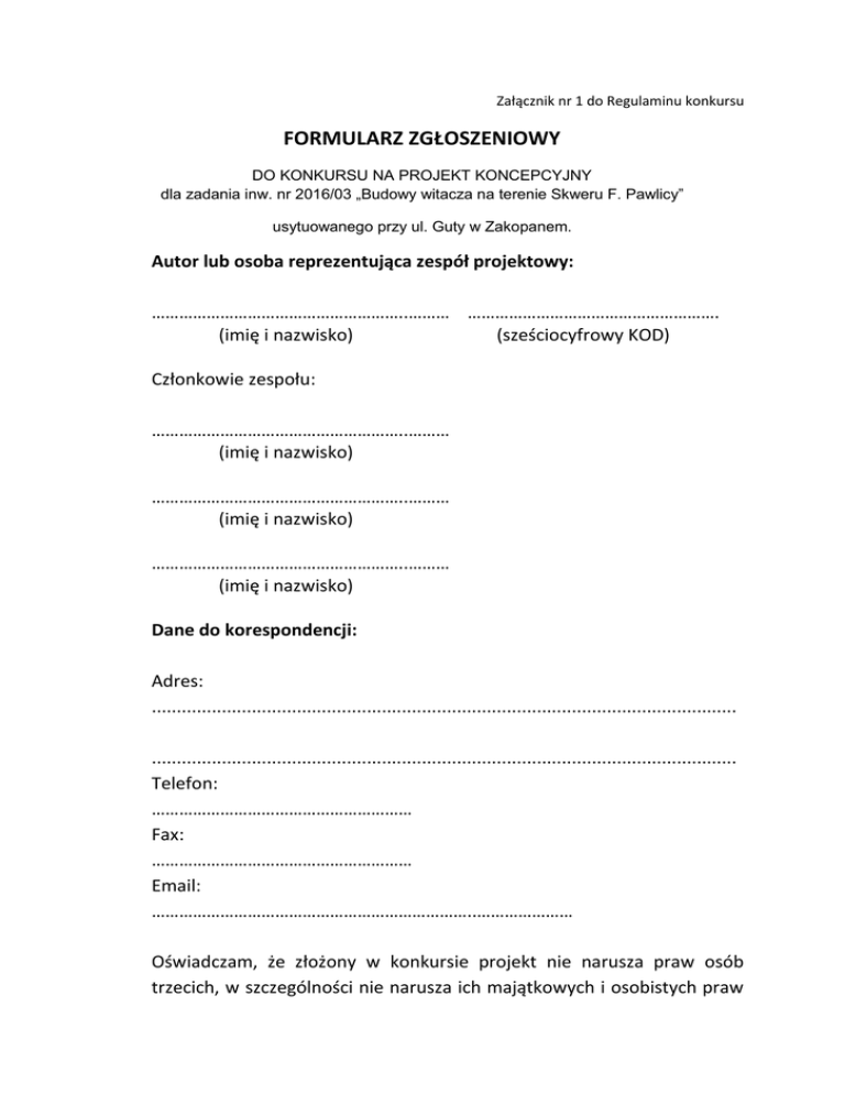Załącznik nr 1 do Regulaminu konkursu FORMULARZ ZGŁOSZENIOWY DO KONKURSU NA PROJEKT KONCEPCYJNY dla zadania inw. nr 2016/03 „Budowy witacza na terenie Skweru F. Pawlicy” usytuowanego przy ul. Guty w Zakopanem. Autor lub osoba reprezentująca zespół projektowy: ………………………………………………..……… ………………………………………………. (imię i nazwisko) (sześciocyfrowy KOD) Członkowie zespołu: ………………………………………………..……… (imię i nazwisko) ………………………………………………..……… (imię i nazwisko) ………………………………………………..……… (imię i nazwisko) Dane do korespondencji: Adres: ..................................................................................................................... ..................................................................................................................... Telefon: ………………………………………………… Fax: ………………………………………………… Email: ……………………………………………………………..………………… Oświadczam, że złożony w konkursie projekt nie narusza praw osób trzecich, w szczególności nie narusza ich majątkowych i osobistych praw autorskich, ani obowiązujących przepisów prawa oraz ponoszę pełną i wyłączną odpowiedzialność w przypadku stwierdzenia takich naruszeń. Oświadczam również, że przedstawiona praca konkursowa nie brała udziału w żadnym innym konkursie. Oświadczam, że w przypadku uzyskania nagrody wyrażam zgodę na przeniesienie autorskich praw majątkowych do pracy konkursowej na wszelkich dostępnych polach eksploatacji wynikających z treści art. 50 ustawy z dnia 4 lutego 1994 r. o prawie autorskim i prawach pokrewnych (Dz. U. z 2006 r., nr 90, poz. 631 z późn. zm.). …………………………………….. miejscowość, data ……………………………………………. czytelny podpis osoby uprawnionej