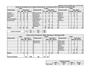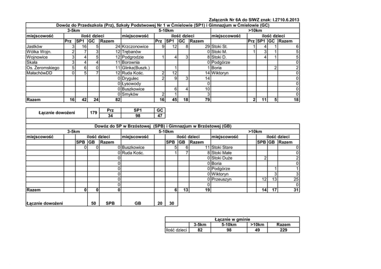 Załącznik Nr 6A do SIWZ znak: I.2710.6.2013 Dowóz do Przedszkola (Prz), Szkoły Podstwowej Nr 1 w Ćmielowie (SP1) i Gimnazjum w Ćmielowie (GC) 3-5km 5-10km >10km ilość dzieci ilość dzieci ilość dzieci miejscowość miejscowość miejsccowość Prz SP1 GC Razem Prz SP1 GC Razem Prz SP1 GC Razem Jastków 3 16 5 24 Krzczonowice 9 12 8 29 Stoki St. 1 4 1 6 Wólka Wojn. 2 7 3 12 Trębanów 0 Stoki M. 1 3 1 5 Wojnowice 3 4 5 12 Podgrodzie 1 4 3 8 Stoki D. 4 1 5 Skała 3 4 4 11 Borownia 0 Podgórze 0 Os. Żeromskiego 5 6 0 11 Glinka(Buszk.) 1 1 Boria 2 2 MałachówDD 0 5 7 12 Ruda Kośc. 2 12 14 Wiktoryn 0 0 Drygulec 2 9 3 14 0 0 Łysowody 0 0 0 Buszkowice 6 4 10 0 0 Smyków 2 1 3 0 Razem 16 42 24 82 16 45 18 79 2 11 5 18 Łącznie dowożeni 179 Prz 34 SP1 98 GC 47 Dowóz do SP w Brzóstowej (SPB) i Gimnazjum w Brzóstowej (GB) 5-10km ilość dzieci ilość dzieci miejscowość miejscowość SPB GB Razem SPB GB Razem 0 0 0 Buszkowice 5 6 11 Stoki Stare 0 Ruda Kośc. 1 7 8 Stoki Małe 0 0 Stoki Duże 0 0 Boria 0 0 Podgórze 0 0 Wiktoryn 0 0 Przeuszyn 0 0 0 0 0 6 13 19 3-5km miejscowość Razem Łącznie dowożeni 50 SPB GB 20 >10km ilość dzieci SPB GB Razem 2 12 1 3 13 14 17 30 Ilość dzieci 3-5km 82 Łącznie w gminie >10km 5-10km 49 98 Razem 229 0 0 2 0 1 3 25 0 31