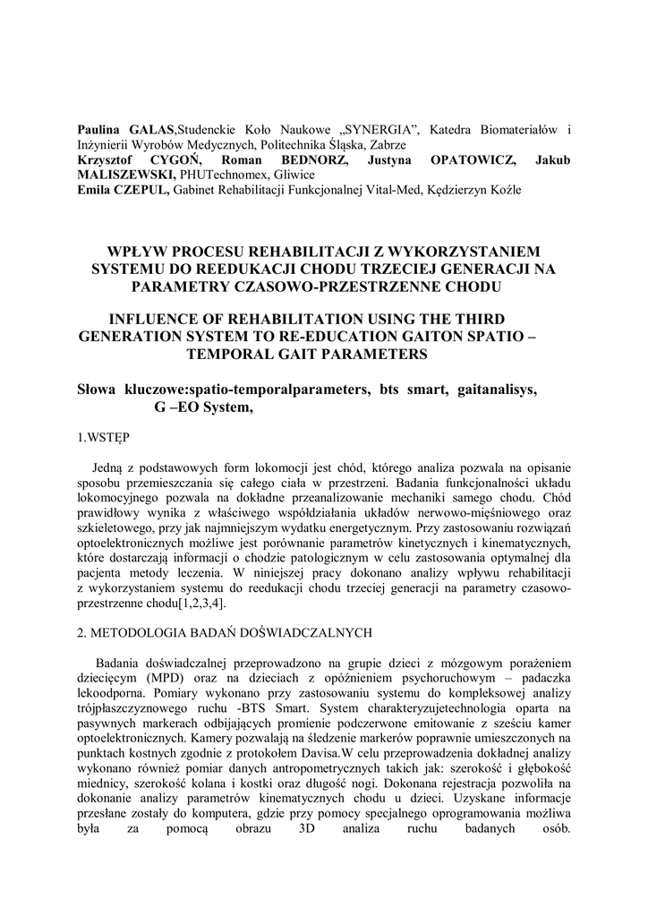 Paulina GALAS,Studenckie Koło Naukowe „SYNERGIA”, Katedra Biomateriałów i Inżynierii Wyrobów Medycznych, Politechnika Śląska, Zabrze Krzysztof CYGOŃ, Roman BEDNORZ, Justyna OPATOWICZ, Jakub MALISZEWSKI, PHUTechnomex, Gliwice Emila CZEPUL, Gabinet Rehabilitacji Funkcjonalnej Vital-Med, Kędzierzyn Koźle WPŁYW PROCESU REHABILITACJI Z WYKORZYSTANIEM SYSTEMU DO REEDUKACJI CHODU TRZECIEJ GENERACJI NA PARAMETRY CZASOWO-PRZESTRZENNE CHODU INFLUENCE OF REHABILITATION USING THE THIRD GENERATION SYSTEM TO RE-EDUCATION GAITON SPATIO – TEMPORAL GAIT PARAMETERS Słowa kluczowe:spatio-temporalparameters, bts smart, gaitanalisys, G –EO System, 1.WSTĘP Jedną z podstawowych form lokomocji jest chód, którego analiza pozwala na opisanie sposobu przemieszczania się całego ciała w przestrzeni. Badania funkcjonalności układu lokomocyjnego pozwala na dokładne przeanalizowanie mechaniki samego chodu. Chód prawidłowy wynika z właściwego współdziałania układów nerwowo-mięśniowego oraz szkieletowego, przy jak najmniejszym wydatku energetycznym. Przy zastosowaniu rozwiązań optoelektronicznych możliwe jest porównanie parametrów kinetycznych i kinematycznych, które dostarczają informacji o chodzie patologicznym w celu zastosowania optymalnej dla pacjenta metody leczenia. W niniejszej pracy dokonano analizy wpływu rehabilitacji z wykorzystaniem systemu do reedukacji chodu trzeciej generacji na parametry czasowoprzestrzenne chodu[1,2,3,4]. 2. METODOLOGIA BADAŃ DOŚWIADCZALNYCH Badania doświadczalnej przeprowadzono na grupie dzieci z mózgowym porażeniem dziecięcym (MPD) oraz na dzieciach z opóźnieniem psychoruchowym – padaczka lekoodporna. Pomiary wykonano przy zastosowaniu systemu do kompleksowej analizy trójpłaszczyznowego ruchu -BTS Smart. System charakteryzujetechnologia oparta na pasywnych markerach odbijających promienie podczerwone emitowanie z sześciu kamer optoelektronicznych. Kamery pozwalają na śledzenie markerów poprawnie umieszczonych na punktach kostnych zgodnie z protokołem Davisa.W celu przeprowadzenia dokładnej analizy wykonano również pomiar danych antropometrycznych takich jak: szerokość i głębokość miednicy, szerokość kolana i kostki oraz długość nogi. Dokonana rejestracja pozwoliła na dokonanie analizy parametrów kinematycznych chodu u dzieci. Uzyskane informacje przesłane zostały do komputera, gdzie przy pomocy specjalnego oprogramowania możliwa była za pomocą obrazu 3D analiza ruchu badanych osób. XI Konferencja Naukowa Majówka Młodych Biomechaników im. prof. Dagmary Tejszerskiej s. 28 3. ANALIZA WYNIKÓW Do dalszej analizy brano pod uwagę trzy najlepsze przejścia (kryterium wyboru dotyczyło jakości nagrania oraz sposobu przejścia – pacjent miał wykonać minimum 4 pełne kroki bez zatrzymywania się w trakcie badania). Kolejno przy użyciu takich narzędzi jak SMART Tracker i SMART Analyzer dokonano wyznaczenia parametrów czasowo- przestrzennych. Analizie poddano wygenerowane w raporcie parametry chodu,zarejestrowane u dzieci przed rehabilitacją, po dziesięciu i dwudziestu dniach rehabilitacji przy użyciu systemu trzeciej generacji do reedukacji chodu G-EO System(Tabela 1). Tabela 1. Średnie wartości parametrów czasowo – przestrzennych pacjentów poddanych rehabilitacji przy użyciu systemu do reedukacji chodu wartość parametrów czasowo - przestrzennych: parametry czasowo przestrzenne chodu przed rehabilitacją po 10 dniach rehabilitacji po 20 dniach rehabilitacji normy parametrów czasowo przestrzennych L P L P L P L P faza podporowa [%] 75.336 ± 15.49 73.596 ± 11.82 70.898 ± 12.38 73.764 ± 9.94 69.81 ± 7.69 73.198 ± 6.42 58.7 ± 2.9 58.5 ± 2.1 faza wymachowa [%] 24.664 ± 15.49 26.406 ± 11.83 29.102 ± 12.38 26.234 ± 9.94 30.19 ± 7.69 26.802 ± 6.42 41.3 ± 2.9 41.5 ± 0.9 faza dwupodporowa [%] 21.674 ± 15.51 24.552 ± 10.10 24.798 ± 19.83 19.71 ± 4.76 20.188 ± 9.13 20.934 ± 6.66 5.7 ± 0.8 5.3 ± 0.6 kadencja [krok/s] długość kroku [m] prędkość chodu [m/s] 0.978 ± 0.57 0.249 ± 0.14 0.202 ± 0.13 0.260 ± 0.30 1.05 ± 0.58 0.259 ± 0.13 0.207 ± 0.12 0.277 ± 0.31 1.002 ± 0.5 0.253 ± 0.07 0.212 ± 0.10 0.262 ± 0.24 2.210 ± 0.7 0.55 ± 0.02 0.54 ± 0.03 1.21 0.16 4. PODSUMOWANIE PRACY Przeprowadzone badania doświadczalne miały na celu pokazanie skuteczności zastosowania najbardziej zaawansowanego systemu do rehabilitacji i reedukacji chodu firmy Reha Technology – G-EO System. Analiza wielkości charakteryzujących chód przed zabiegiem i kolejno po dziesięciu i dwudziestu dniach wskazuje, że użycie systemu trzeciej generacji do reedukacji chodu ma wpływ na przewrócenie utraconej funkcji chodu. W wyniku niewielkiej liczby badanych osób, wyniki należy traktować jako badania pilotażowe. LITERATURA [1] Nawrotny J.: Podstawy fizjoterapii cz.3, Wyd. Kasper, Kraków, 2004 [2] Harrir G. F., Wertsch J.J.: Procedures for gait analysis, Arch Phys Med. Rehabil 1994, 75, p. 216-225 [3] Davis RB, Ounpuu S, Tyburski D, Gage JR: A gait analysis data collection and reduction technique.Human Movement Science, 1991, 10:575-587 [4]Tejszerska D., Świtoński E., Gzik M.: Biomechanika narządu ruchu człowieka. Wyd.1. Instytut Technologii Eksploatacji - PIB, Radom, 2011