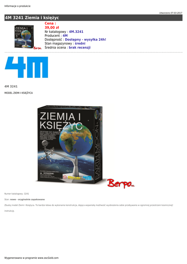 Informacje o produkcie Utworzono 07-03-2017 4M 3241 Ziemia i księżyc Cena : 39,00 zł Nr katalogowy : 4M.3241 Producent : 4M Dostępność : Dostępny - wysyłka 24h! Stan magazynowy : średni Średnia ocena : brak recenzji 4M 3241 MODEL ZIEMI I KSIĘŻYCA Numer katalogowy: 3241 Stan: nowe - oryginalnie zapakowane Zbuduj model Ziemi i Księżyca. To bardzo łatwa do wykonania konstrukcja, dająca wspaniałą możliwość wyobrażenia sobie przebywania w ogromnej przestrzeni kosmicznej! instrukcję. Wygenerowano w programie www.oscGold.com Informacje o produkcie Dostępność w salonach: Ilość: Sklep - Złotniki: 5 Sklep - zlikwidowany: 0 Sklep - Szczepankowo: 1 Dostępne opcje 4M 3241 Ziemia i księżyc » Wiek: 8 - 11 lat, 12 lat i więcej. Wygenerowano w programie www.oscGold.com