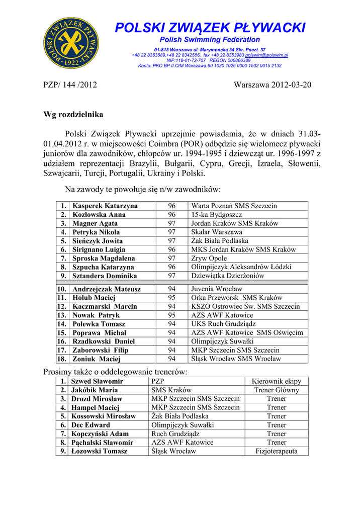 POLSKI ZWIĄZEK PŁYWACKI Polish Swimming Federation 01-813 Warszawa ul. Marymoncka 34 Skr. Poczt. 37 +48 22 8353589,+48 22 8342556, fax +48 22 8353983 [email protected] NIP:118-01-72-707 REGON 000866389 Konto: PKO BP II O/M Warszawa 90 1020 1026 0000 1502 0015 2132 PZP/ 144 /2012 Warszawa 2012-03-20 Wg rozdzielnika Polski Związek Pływacki uprzejmie powiadamia, że w dniach 31.0301.04.2012 r. w miejscowości Coimbra (POR) odbędzie się wielomecz pływacki juniorów dla zawodników, chłopców ur. 1994-1995 i dziewcząt ur. 1996-1997 z udziałem reprezentacji Brazylii, Bułgarii, Cypru, Grecji, Izraela, Słowenii, Szwajcarii, Turcji, Portugalii, Ukrainy i Polski. Na zawody te powołuje się n/w zawodników: 1. 2. 3. 4. 5. 6. 7. 8. 9. Kasperek Katarzyna Kozłowska Anna Magner Agata Petryka Nikola Sieńczyk Jowita Sirignano Luigia Sproska Magdalena Szpucha Katarzyna Sztandera Dominika 96 96 97 97 97 96 97 96 97 Warta Poznań SMS Szczecin 15-ka Bydgoszcz Jordan Kraków SMS Kraków Skalar Warszawa Żak Biała Podlaska MKS Jordan Kraków SMS Kraków Zryw Opole Olimpijczyk Aleksandrów Łódzki Dziewiątka Dzierżoniów 10. 11. 12. 13. 14. 15. 16. 17. 18. Andrzejczak Mateusz Hołub Maciej Kaczmarski Marcin Nowak Patryk Polewka Tomasz Poprawa Michał Rzadkowski Daniel Zaborowski Filip Zoniuk Maciej 94 95 94 95 94 94 94 94 94 Juvenia Wrocław Orka Przeworsk SMS Kraków KSZO Ostrowiec Św. SMS Szczecin AZS AWF Katowice UKS Ruch Grudziądz AZS AWF Katowice SMS Oświęcim Olimpijczyk Suwałki MKP Szczecin SMS Szczecin Śląsk Wrocław SMS Wrocław Prosimy także o oddelegowanie trenerów: 1. 2. 3. 4. 5. 6. 7. 8. 9. Szwed Sławomir Jakóbik Maria Drozd Mirosław Hampel Maciej Kossowski Mirosław Dec Edward Kopczyński Adam Pąchalski Sławomir Łozowski Tomasz PZP SMS Kraków MKP Szczecin SMS Szczecin MKP Szczecin SMS Szczecin Żak Biała Podlaska Olimpijczyk Suwałki Ruch Grudziądz AZS AWF Katowice Śląsk Wrocław Kierownik ekipy Trener Główny Trener Trener Trener Trener Trener Trener Fizjoterapeuta Wyjazd na zawody nastąpi 29 marca 2012 z MDL Warszawa Okęcie o godz. 07.40 rejsem TP587 do Lizbony, powrót (lądowanie w Warszawie) 02 kwietnia 2012 o godz. 22.40 rejsem LO380 z Frankfurtu. Zbiórka powołanych 28 marca 2012. Dla powołanych został zarezerwowany nocleg w Warszawie z 28 na 29 marca 2012 w hotelu Aramis, ul. Mangalia 3 B, Warszawa. Osobom korzystającym z noclegu zostanie zapewniona kolacja 28.03., śniadanie (suchy prowiant) 29.03. oraz transport na MDL Okęcie. W hotelu należy się stawić 28 marca do godz. 19.00. Z uwagi na późny powrót istnieje możliwość zakwaterowania w Warszawie z 02 na 03 kwietnia. Zainteresowanych prosimy o bezzwłoczne zgłoszenie tego faktu w PZP. Program zawodów i propozycje obsady konkurencji w załączeniu. Powołani zostaną wyposażeni w dresy reprezentacyjne, koszulkę, szorty, klapki, - firmy - ARENA (zawodnicy ponadto w czepki, slipy/kostiumy, okulary), pozostały sprzęt indywidualny do zawodów należy zabrać ze sobą. Prosimy o bezzwłoczne podanie rozmiarów: koszulki i dresy (XL, L, M, S), klapki, kostiumy startowe arena wg rozmiarów „INT” na adres [email protected] lub [email protected]. Uwaga: osoby, które otrzymały w ubiegłym roku dresy w bieżącym roku ich nie otrzymają, proszone są o zabranie posiadanego już sprzętu. Zawodnicy niepełnoletni muszą posiadać pisemne zgody rodziców na wyjazd, a ci którzy po powrocie nie będą odbierani z lotniska przez swoich rodziców ponadto muszą posiadać pisemne upoważnienia opiekunów prawnych do odbioru przez wskazane osoby trzecie. Osoby wyjeżdżające z PZP po raz pierwszy proszone są o bezzwłoczne podanie (e-mailem, faxem lub telefonicznie) dat urodzenia, adresu zamieszkania i nr paszportu do ubezpieczenia. Koszty przyjazdu do Warszawy i powrót do miejsc zamieszkania po zawodach pokrywają jednostki delegujące. Pozostałe koszty pokrywa PZP. Kierownik Organizacyjno-Szkoleniowy PZP mgr Jerzy Kowalski Otrzymują: 1. Zainteresowane Kluby/SMS 2. a/a PREZES mgr Krzysztof Usielski Multinations JUN Meet Coimbra (POR) 31st March/1st April 2012 SATURDAY - 31st March 2012 Event 1st Name Family Name Birth Year 400m Ind. Medley Boys 400m Ind. Medley Girls 100m Freestyle Boys 100m Freestyle Girls 200m Backstroke Boys 200m Backstroke Girls 50m Butterfly Boys 50m Butterfly Girls 4X100m Medley Boys 4X100m Medley Girls Filip Katarzyna Michał Diana Tomasz Agata Michał Anna Zaborowski Szpucha Poprawa Sokołowska Polewka Magner Poprawa Kozłowska 1994 1996 1994 1996 1994 1996 1994 1996 200m Butterfly Boys 200m Butterfly Girls 100m Backstroke Boys 100m Backstroke Girls 200m Breaststroke Boys 200m Breaststroke Girls 50m Freestyle Boys 50m Freestyle Girls 4X200m Freestyle Boys 4X200m Freestyle Girls Michał Katarzyna Tomasz Anna Patryk Jowita Daniel Nikola Maciej Poprawa Szpucha Polewka Kozłowska Nowak Sieńczyk Rzadkowski Petryka Zoniuk 1994 1996 1994 1996 1994 1997 1994 1997 1994 SUNDAY – 1st April 2012 Event 1st Name Family Name Birth Year 1500m Freestyle Boys 100m Breaststroke Girls 100m Breaststroke Boys 200m Freestyle Girls 200m Freestyle Boys 50m Backstroke Girls 50m Backstroke Boys 800m Freestyle Girls Filip Dominika Patryk Diana Jan Nikola Tomasz Katarzyna Zaborowski Sztandera Nowak Sokołowska Świtkowski Petryka Polewka Kasperek 1994 1997 1995 1996 1994 1996 1994 1996 400m Freestyle Boys 400m Freestyle Girls 100m Butterfly Boys 100m Butterfly Girls 200m Ind. Medley Boys 200m Ind. Medley Girls 50m Breaststroke Boys 50m Breaststroke Girls 4X100m Freestyle Boys 4X100m Freestyle Girls Marcin Diana Michał Magdalena Jan Jowita Patryk Dominika Kaczmarski Sokołowska Poprawa Sproska Świtkowski Sieńczyk Nowak Sztandera 1994 1996 1994 1997 1994 1997 1995 1997