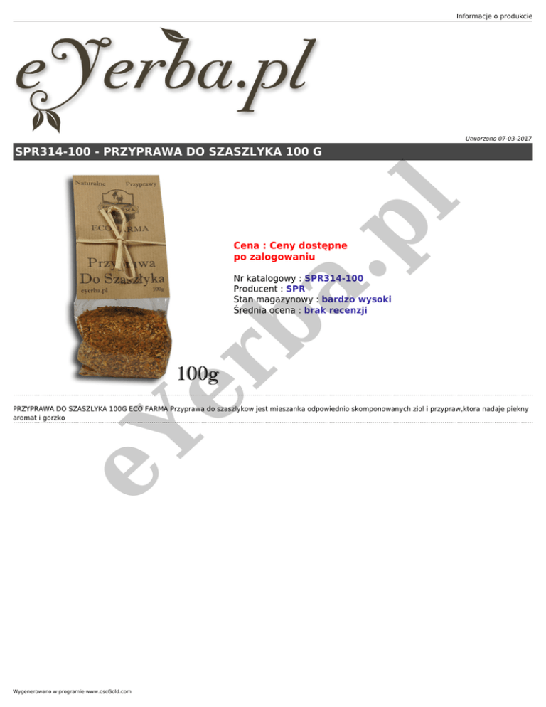 Informacje o produkcie Utworzono 07-03-2017 a. pl SPR314-100 - PRZYPRAWA DO SZASZLYKA 100 G Cena : Ceny dostępne po zalogowaniu er b Nr katalogowy : SPR314-100 Producent : SPR Stan magazynowy : bardzo wysoki Średnia ocena : brak recenzji eY PRZYPRAWA DO SZASZLYKA 100G ECO FARMA Przyprawa do szaszlykow jest mieszanka odpowiednio skomponowanych ziol i przypraw,ktora nadaje piekny aromat i gorzko Wygenerowano w programie www.oscGold.com