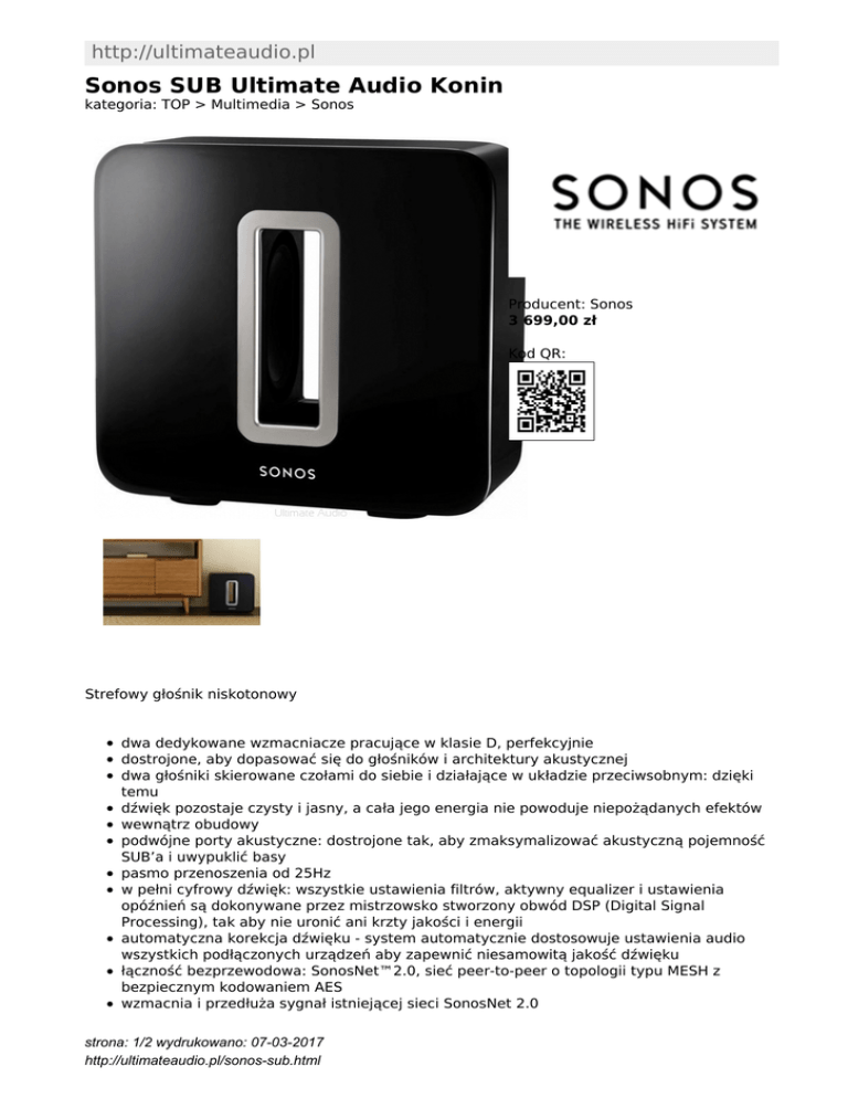 http://ultimateaudio.pl Sonos SUB Ultimate Audio Konin kategoria: TOP > Multimedia > Sonos Producent: Sonos 3 699,00 zł Kod QR: Strefowy głośnik niskotonowy dwa dedykowane wzmacniacze pracujące w klasie D, perfekcyjnie dostrojone, aby dopasować się do głośników i architektury akustycznej dwa głośniki skierowane czołami do siebie i działające w układzie przeciwsobnym: dzięki temu dźwięk pozostaje czysty i jasny, a cała jego energia nie powoduje niepożądanych efektów wewnątrz obudowy podwójne porty akustyczne: dostrojone tak, aby zmaksymalizować akustyczną pojemność SUB’a i uwypuklić basy pasmo przenoszenia od 25Hz w pełni cyfrowy dźwięk: wszystkie ustawienia filtrów, aktywny equalizer i ustawienia opóźnień są dokonywane przez mistrzowsko stworzony obwód DSP (Digital Signal Processing), tak aby nie uronić ani krzty jakości i energii automatyczna korekcja dźwięku - system automatycznie dostosowuje ustawienia audio wszystkich podłączonych urządzeń aby zapewnić niesamowitą jakość dźwięku łączność bezprzewodowa: SonosNet™2.0, sieć peer-to-peer o topologii typu MESH z bezpiecznym kodowaniem AES wzmacnia i przedłuża sygnał istniejącej sieci SonosNet 2.0 strona: 1/2 wydrukowano: 07-03-2017 http://ultimateaudio.pl/sonos-sub.html port sieciowy (RJ45) dzięki któremu można podłączyć SUB'a również przewodowo do domowej sieci możliwość postawienia SUB'a pionowo lub położenia płasko na podłodze pozwala np. ukryć go pod kanapą działa ze wszystkimi komponentami Sonos z wbudowanym wzmacniaczem: CONNECT:AMP/ZP120/ZP100; PLAY:5/ ZonePlayer S5; PLAY:3; nie działa z urządzeniami bez wzmacniacza: CONNECT/ ZP90/ZP80 strona: 2/2 wydrukowano: 07-03-2017 http://ultimateaudio.pl/sonos-sub.html