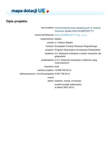 Opis projektu tytuł projektu: Uruchomienie prac badawczych w nowym Centrum Spółki EKO-KOMPOZYTY nazwa beneficjenta: EKO-KOMPOZYTY Sp. z o.o. województwo: śląskie powiat: m. Piekary Śląskie fundusz: Europejski Fundusz Rozwoju Regionalnego program: Program Operacyjny Innowacyjna Gospodarka działanie: 4.5. Wsparcie inwestycji o dużym znaczeniu dla gospodarki poddziałanie: 4.5.2. Wsparcie inwestycji w sektorze usług nowoczesnych dziedzina: brak wartość projektu: 18 890 340.00 zł dofinansowanie z Unii Europejskiej: 5 827 790.40 zł ocena: sektor: badania, rozwój, innowacje punktor projekt realizowany w latach 2007-2013