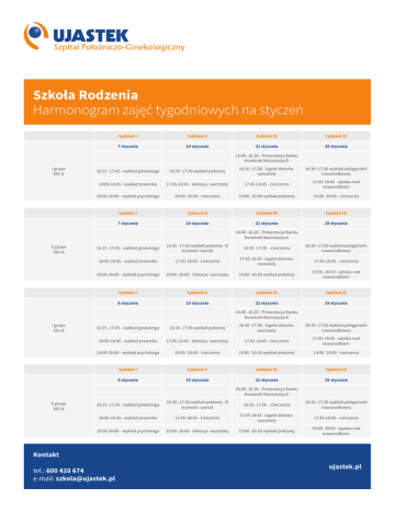 Szkoła Rodzenia Harmonogram zajęć tygodniowych na styczeń tydzień I tydzień II tydzień III tydzień IV 7 stycznia 14 stycznia 21 stycznia 28 stycznia 16:00 -16.20 - Prezentacja Banku Komórek Macieżystych I grupa 350 zł 16:15 -17:45 - wykład ginekologa 16:30 -17:30 wykład położnej 16:30 -17:30 - kąpiel dzieckawarsztaty 16:30 -17:30 wykład pielęgniarki noworodkowej 18:00-18:45 - wykład prawnika 17:45-18:45 - laktacja- warsztaty 17:45-18:45 - ćwiczenia 17:45-18:45 - opieka nad noworodkiem 19:00-20:00 - wykład psychologa 19:00- 20:00 - ćwiczenia 19:00- 20:30 wykład położnej 19:00- 20:00 - ćwiczenia tydzień I tydzień II tydzień III tydzień IV 7 stycznia 14 stycznia 21 stycznia 28 stycznia 16:00 -16.20 - Prezentacja Banku Komórek Macieżystych II grupa 350 zł 16:15 -17:45 - wykład ginekologa 16:30 -17:30 wykład położnej- III trymestr i poród 16:30 -17:30 - ćwiczenia 16:30 -17:30 wykład pielęgniarki noworodkowej 18:00-18:45 - wykład prawnika 17:45-18:45 - ćwiczenia 17:45-18:45 - kąpiel dzieckawarsztaty 17:45-18:45 - ćwiczenia 19:00-20:00 - wykład psychologa 19:00- 20:00 - laktacja- warsztaty 19:00- 20:30 wykład położnej 19:00- 20:00 - opieka nad noworodkiem tydzień I tydzień II tydzień III tydzień IV 8 stycznia 15 stycznia 22 stycznia 29 stycznia 16:00 -16.20 - Prezentacja Banku Komórek Macieżystych I grupa 350 zł 16:15 -17:45 - wykład ginekologa 16:30 -17:30 wykład położnej 16:30 -17:30 - kąpiel dzieckawarsztaty 16:30 -17:30 wykład pielęgniarki noworodkowej 18:00-18:45 - wykład prawnika 17:45-18:45 - laktacja- warsztaty 17:45-18:45 - ćwiczenia 17:45-18:45 - opieka nad noworodkiem 19:00-20:00 - wykład psychologa 19:00- 20:00 - ćwiczenia 19:00- 20:30 wykład położnej 19:00- 20:00 - ćwiczenia tydzień I tydzień II tydzień III tydzień IV 8 stycznia 15 stycznia 22 stycznia 29 stycznia 16:00 -16.20 - Prezentacja Banku Komórek Macieżystych II grupa 350 zł 16:15 -17:45 - wykład ginekologa 16:30 -17:30 wykład położnej- III trymestr i poród 16:30 -17:30 - ćwiczenia 16:30 -17:30 wykład pielęgniarki noworodkowej 18:00-18:45 - wykład prawnika 17:45-18:45 - ćwiczenia 17:45-18:45 - kąpiel dzieckawarsztaty 17:45-18:45 - ćwiczenia 19:00-20:00 - wykład psychologa 19:00- 20:00 - laktacja- warsztaty 19:00- 20:30 wykład położnej 19:00- 20:00 - opieka nad noworodkiem Kontakt tel.: 600 420 674 e-mail: [email protected] ujastek.pl